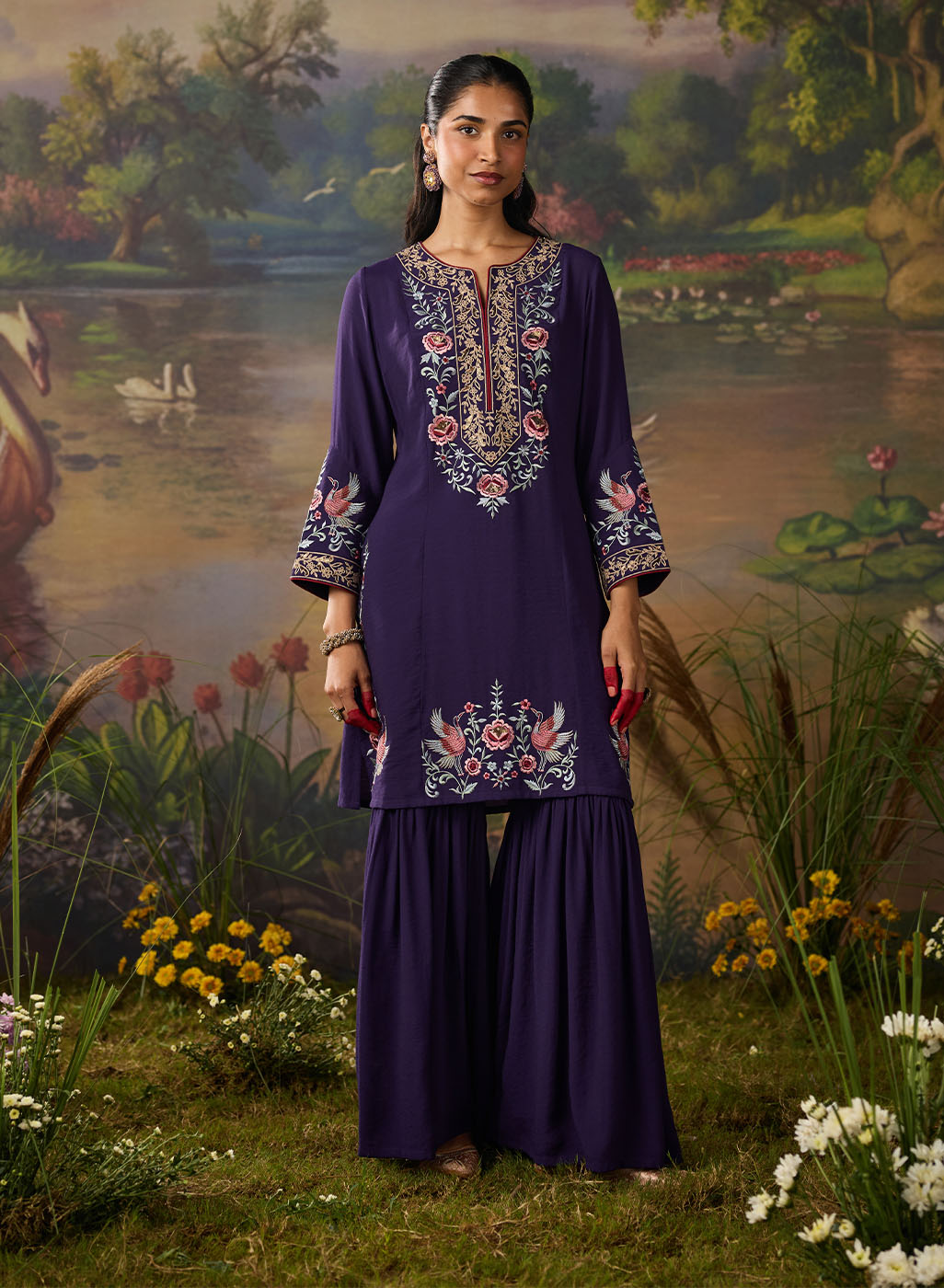 Volume works when it is deliberately created. The sharara combines a flared bottom starting below the knee with a fitted top to create a balanced look. When combined with a fitted kurta, the two together create a very flattering and festive look.