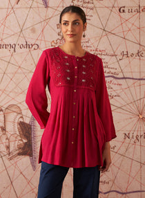 If you like Indian-style tops but are looking for a Western twist, consider trying a peplum silhouette. The fullness, or flare, of the fabric below the waist helps to distribute your body’s proportions from top to bottom and also adds a touch of style.