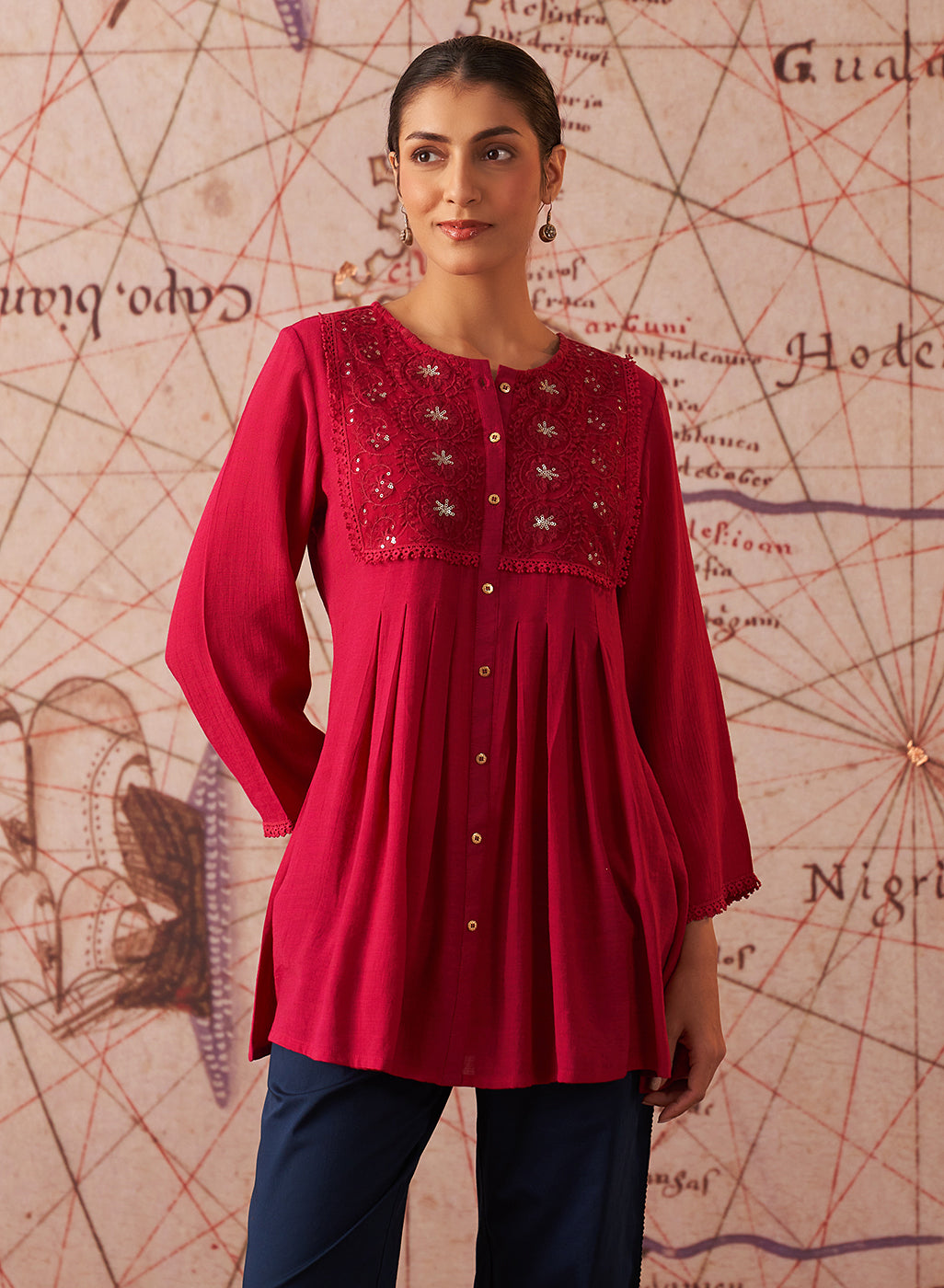 Another great option for the pear-shaped woman is the straight kurta. The straight fit of the kurta creates a long line on both the top and bottom, without being tight on the hips, so the appearance is more balanced. The longer line creates a polished and elongated look when paired with straight leg pants or cigarette pants.