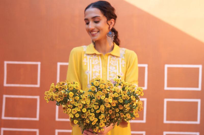 The allure of embroidered kurtas really is unparalleled, and this mustard-coloured embroidered kurta is another example of the same. The one-of-a-kind shade and the details all over make it even more apt for Baisakhi. Complete the look with matching heels and add a pair of statement earrings for that graceful look.