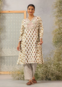 On the fourth day, we pay homage to Goddess Kushmanda, and for this occasion, consider choosing this exquisite ivory-coloured printed kurta set from Lakshita. This versatile ensemble allows you to express your style effortlessly, and with its comfortable cotton fabric, you can relish comfort throughout the day.