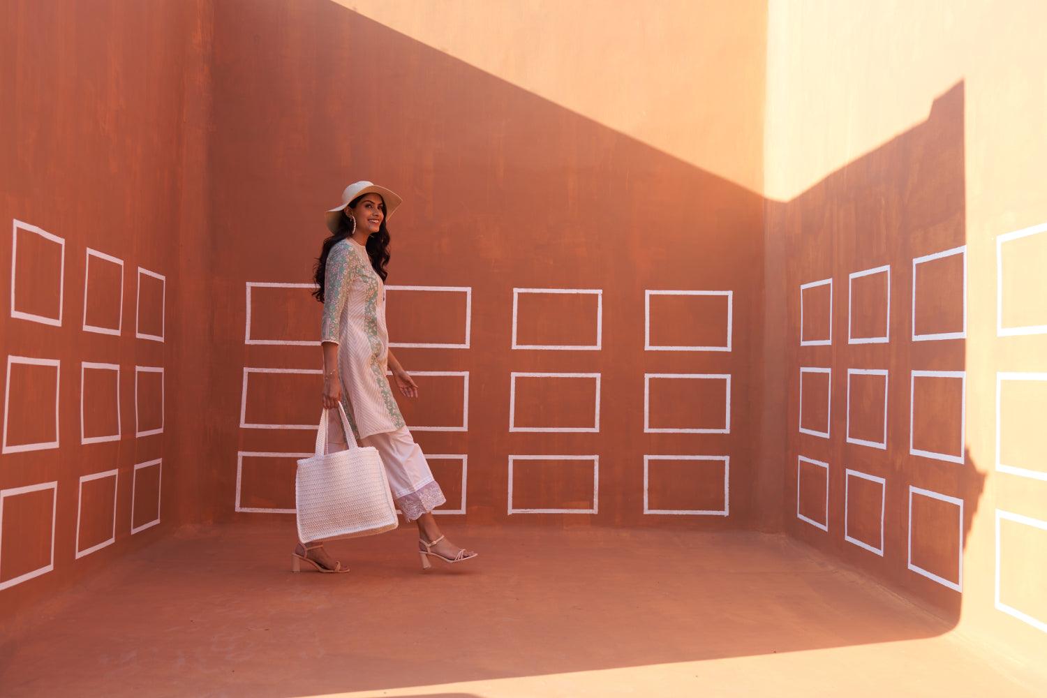 Our first recommendation will be ethnic kurta sets like this ivory-coloured kurta set that comes with intricate embroidery. Milled from high-quality cotton, this embroidered kurta set carries an elegant yet playful vibe.