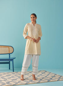 Another lovely option we have in ethnic wear for women is this very pretty yellow v-neck kurti with dori embroidery and sequin work.