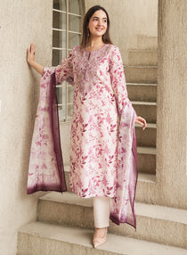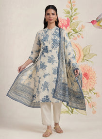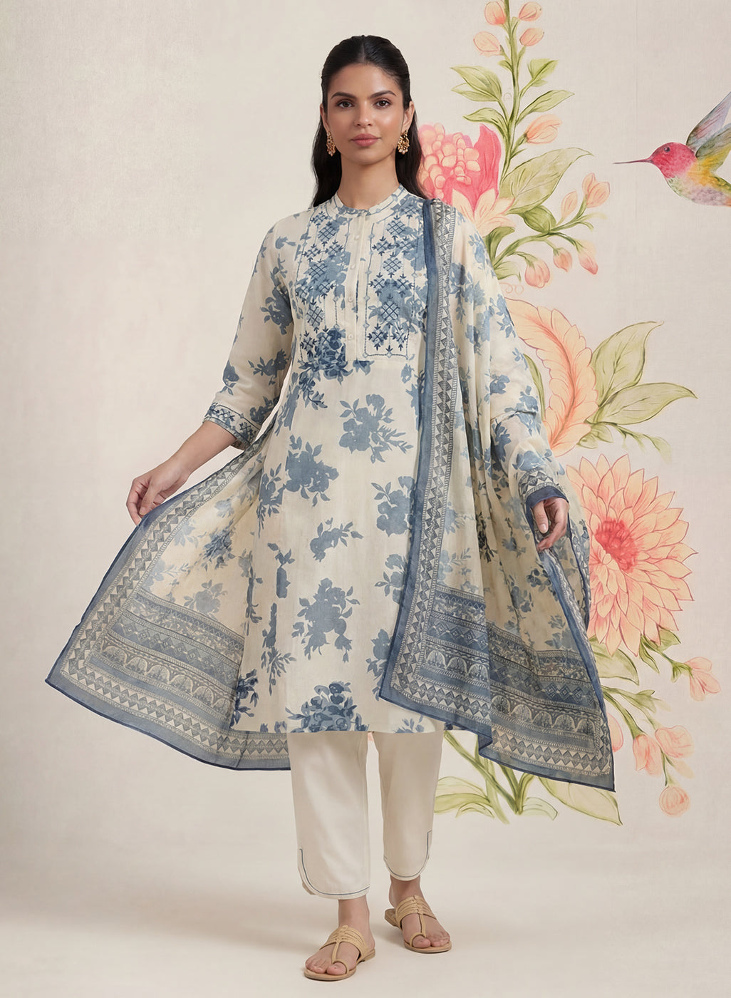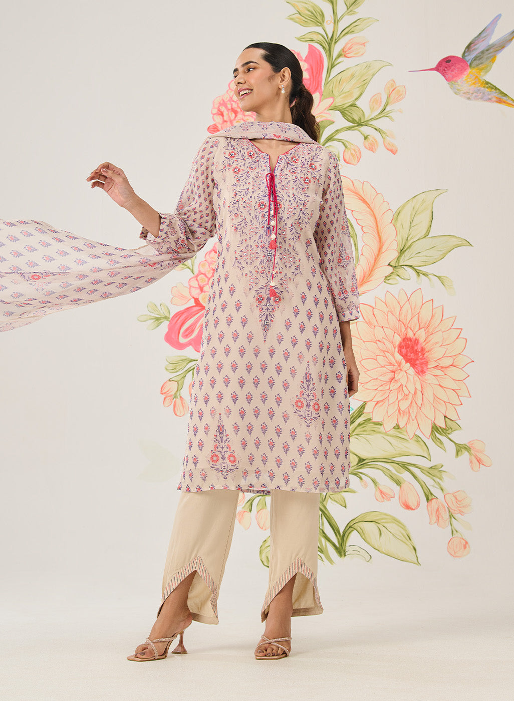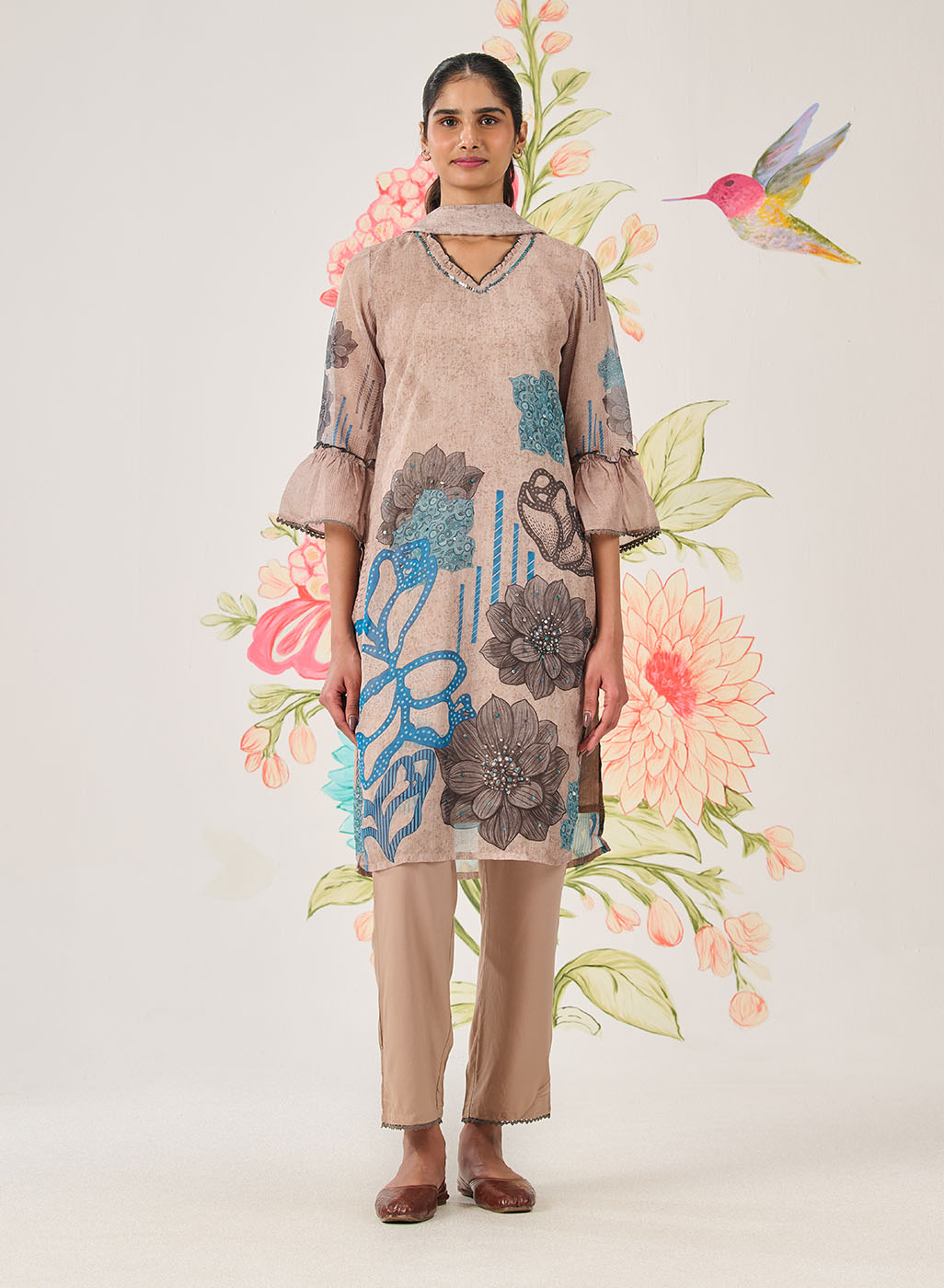 The beige base keeps things neutral and soft on the yes, and for the heat. The all-over print adds just enough visual interest without ever feeling busy. The sheer lghteright organza gives it an airy, weightless feel. This set is perfect when you want something dressy for the warm weather. The delicate details like pearl buttons, tassels, and the light dupatta all add to the feminine appeal of the ensemble.