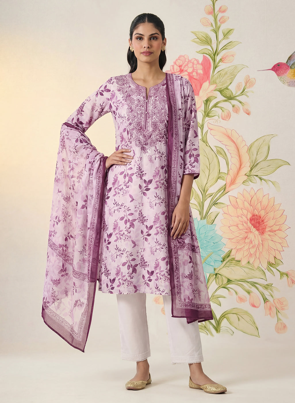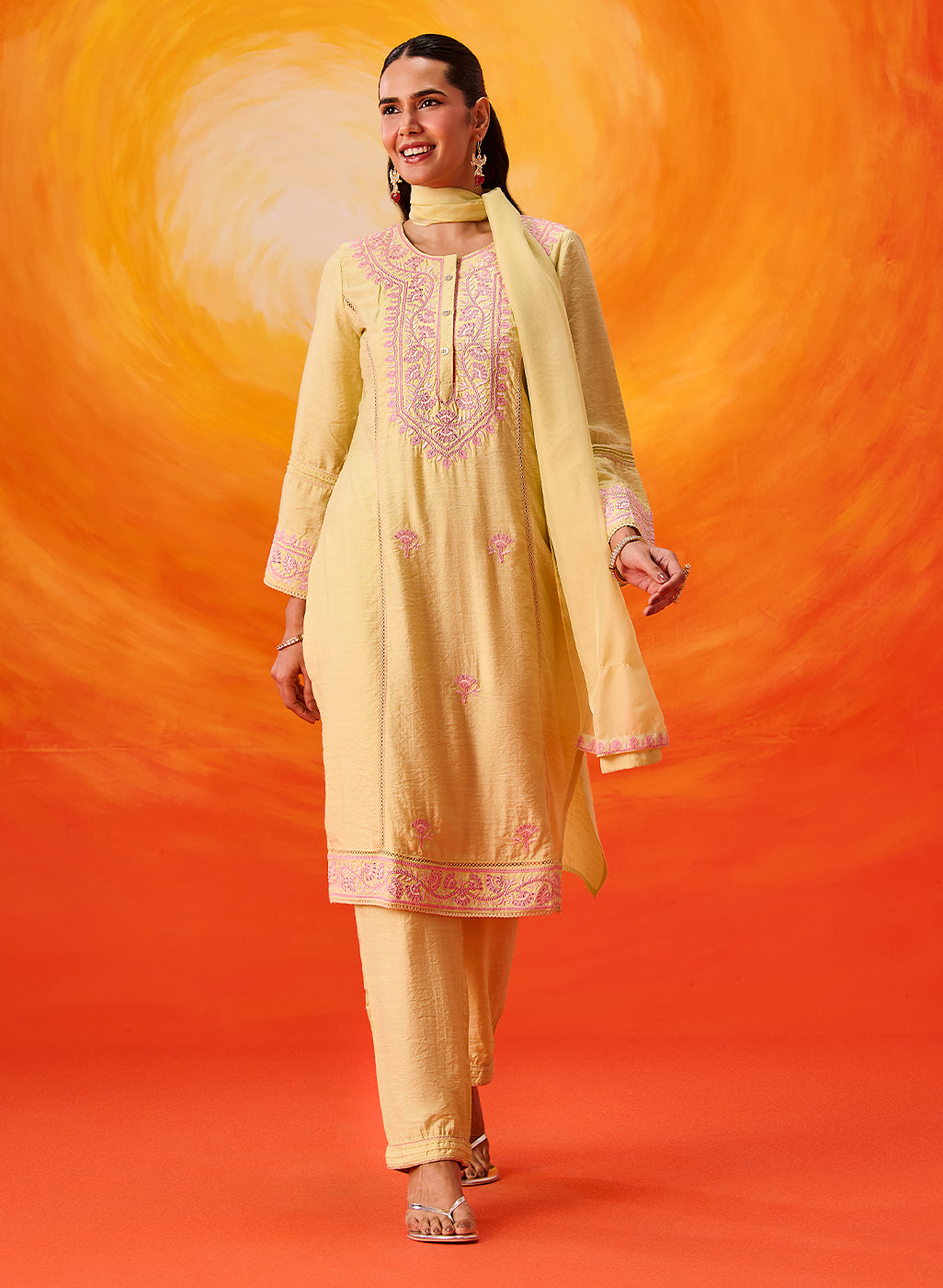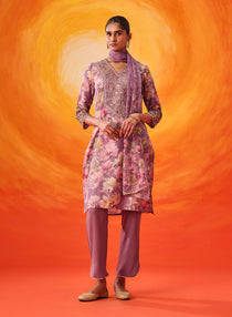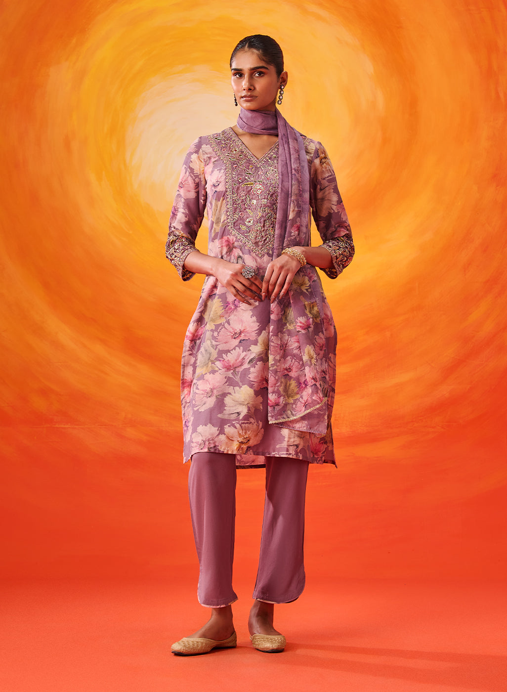 This is a summer outfit with some presence. The fuchsia shade is boldand vibrant, but the Chanderi fabric balances it beautifully. It is lightweight with a soft sheen that elevates the outfit, and gives it an ethereal feel. The straight silhouette keeps it clean and easy. The print adds enough detail to help the outfit standout.