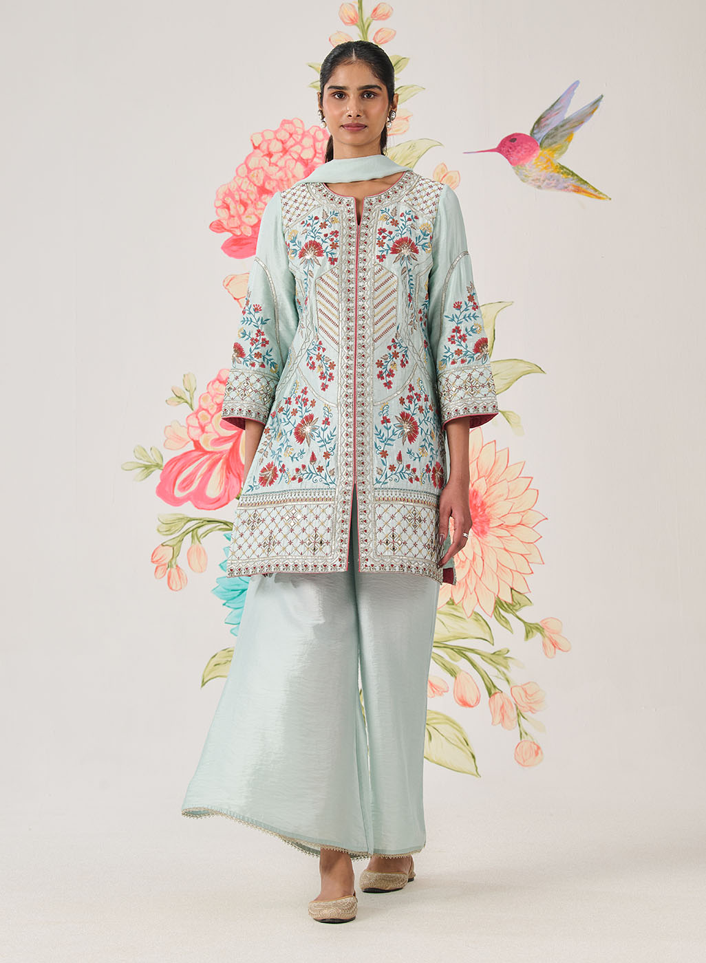 If your Ramadan calendar is dotted with large gatherings or festive dinners, then going for a sharara set is definitely the right choice. The combination of a structured kurta and flared sharara-style bottoms forms a celebratory silhouette that doesn't compromise on elegance. Besides, sharara sets, in contrast to heavier festive outfits, allow for movement and are comfortable, thereby making them ideal for evenings that go late with talks and desserts.