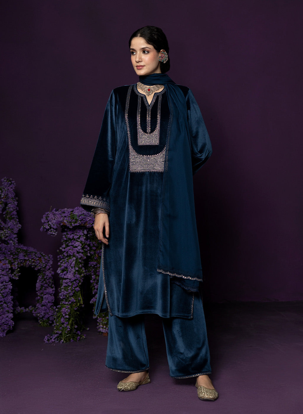 Teal Embroidered Velvet Suit Set with Dupatta