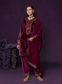 Maroon Embroidered Velvet Suit Set with Dupatta