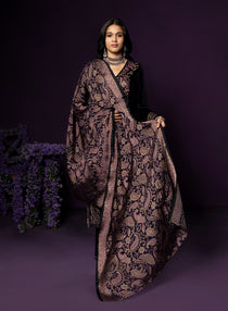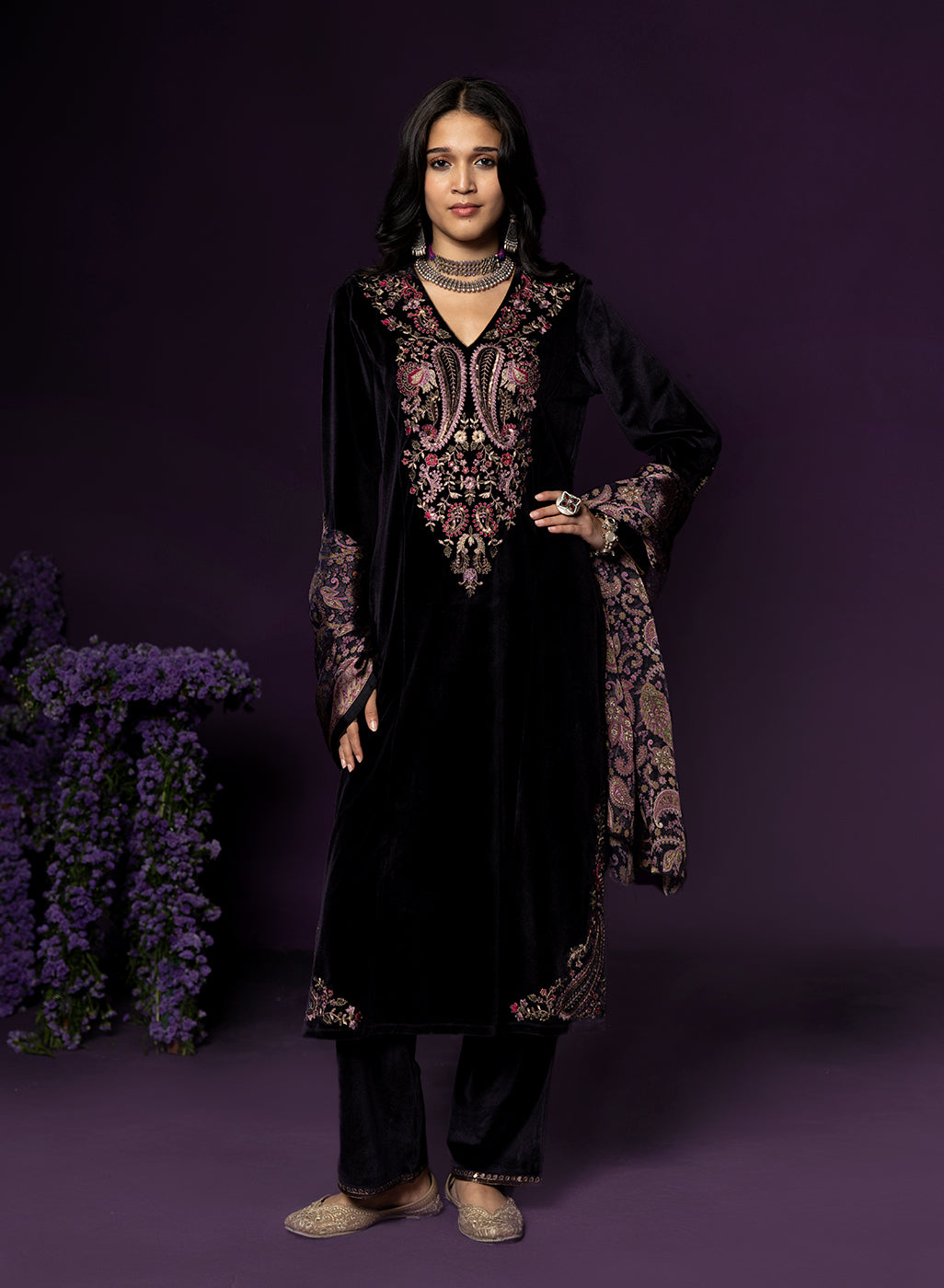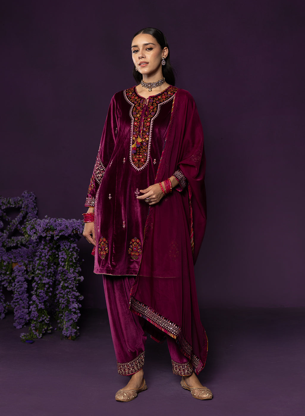 Purple Embroidered Velvet Suit Set with Brasso Dupatta