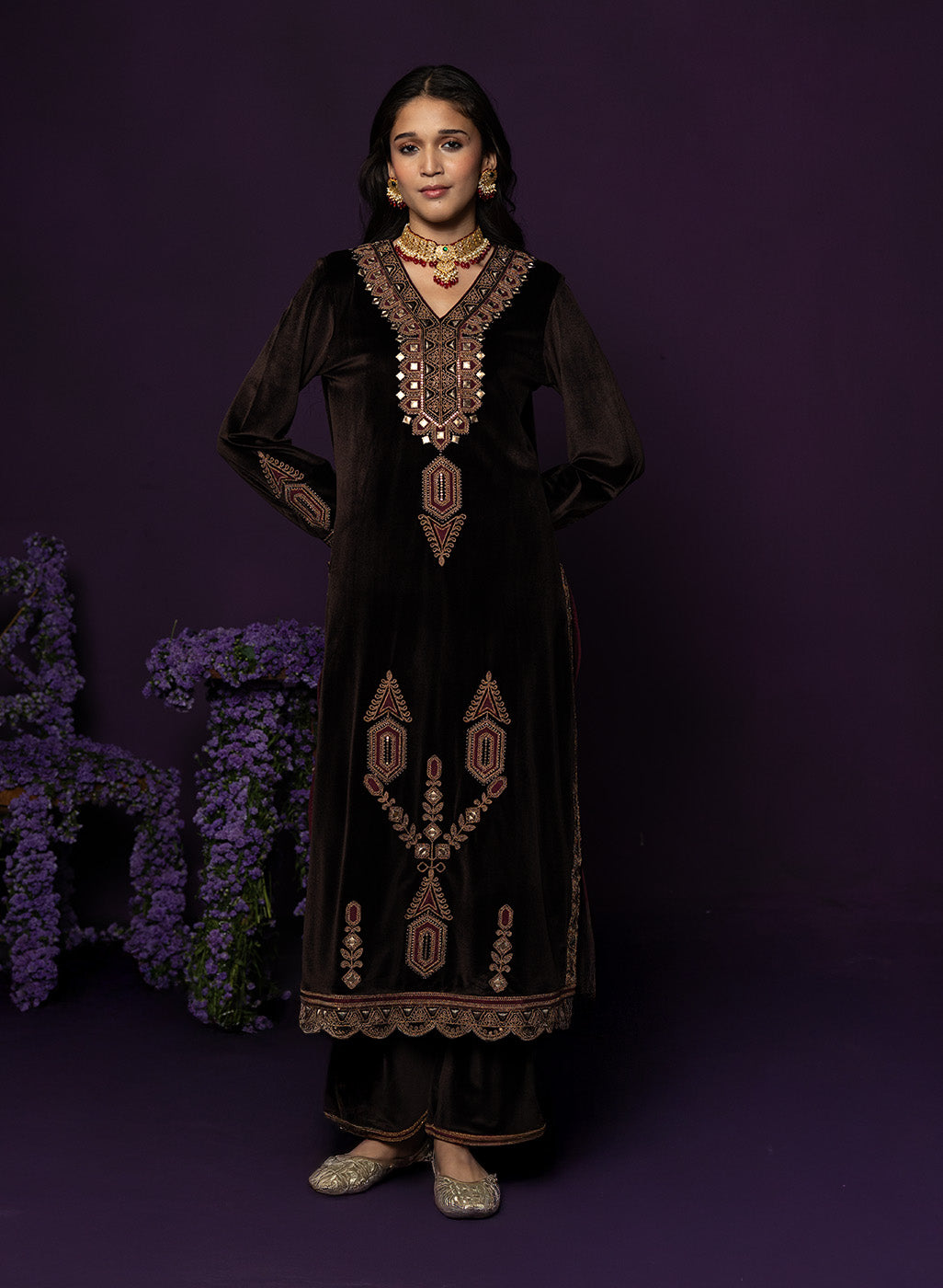 Brown Embroidered Velvet Suit Set with Banarasi Dupatta