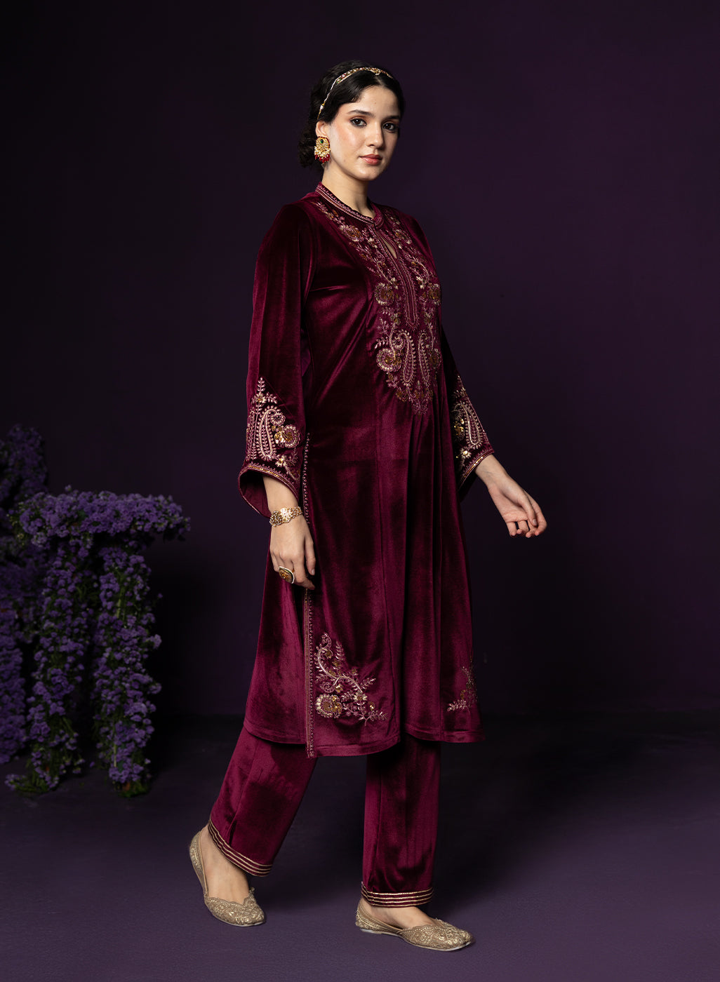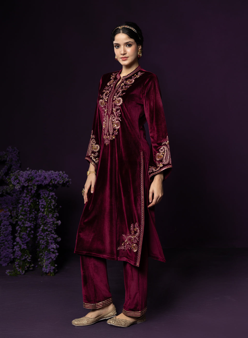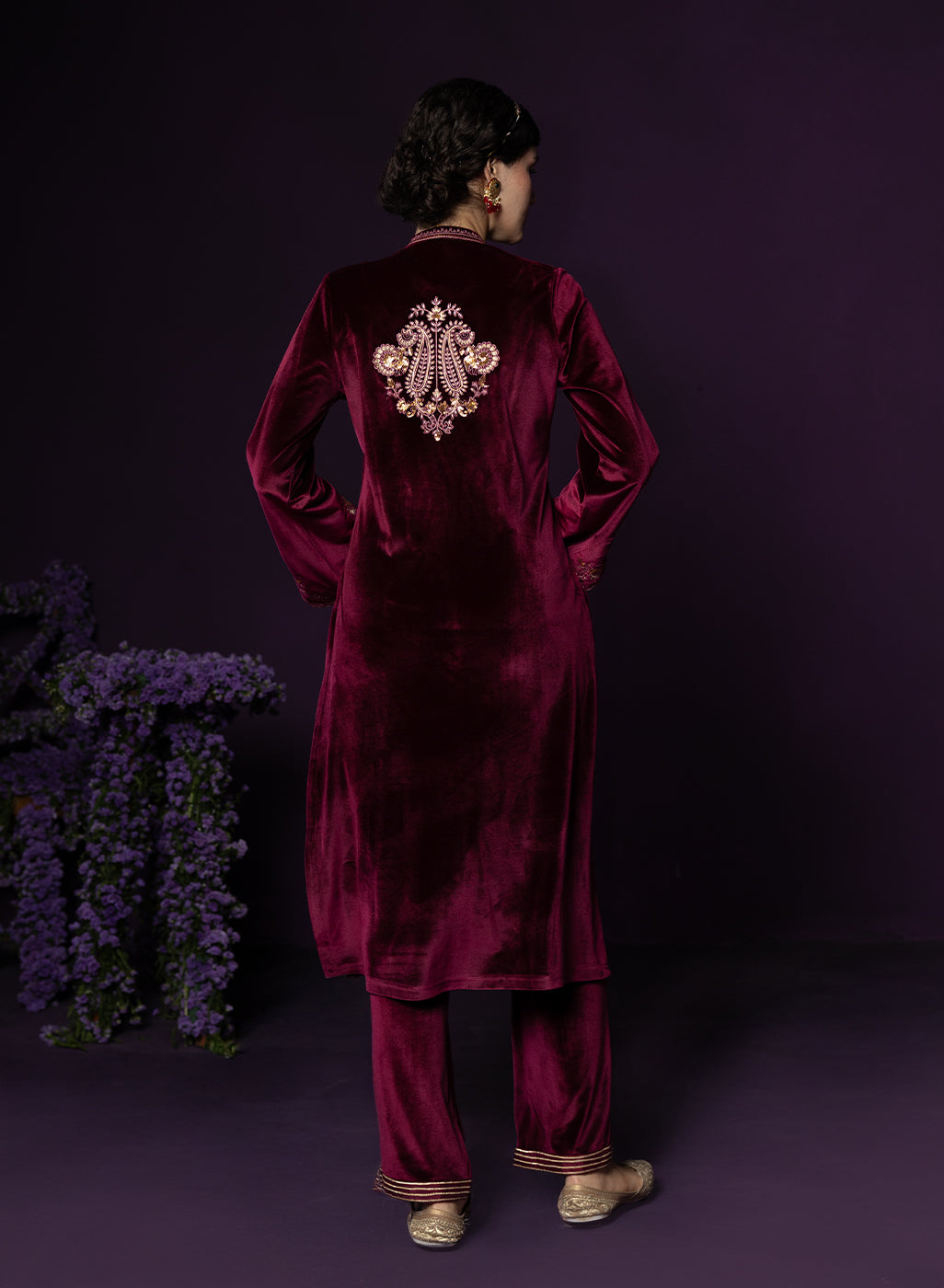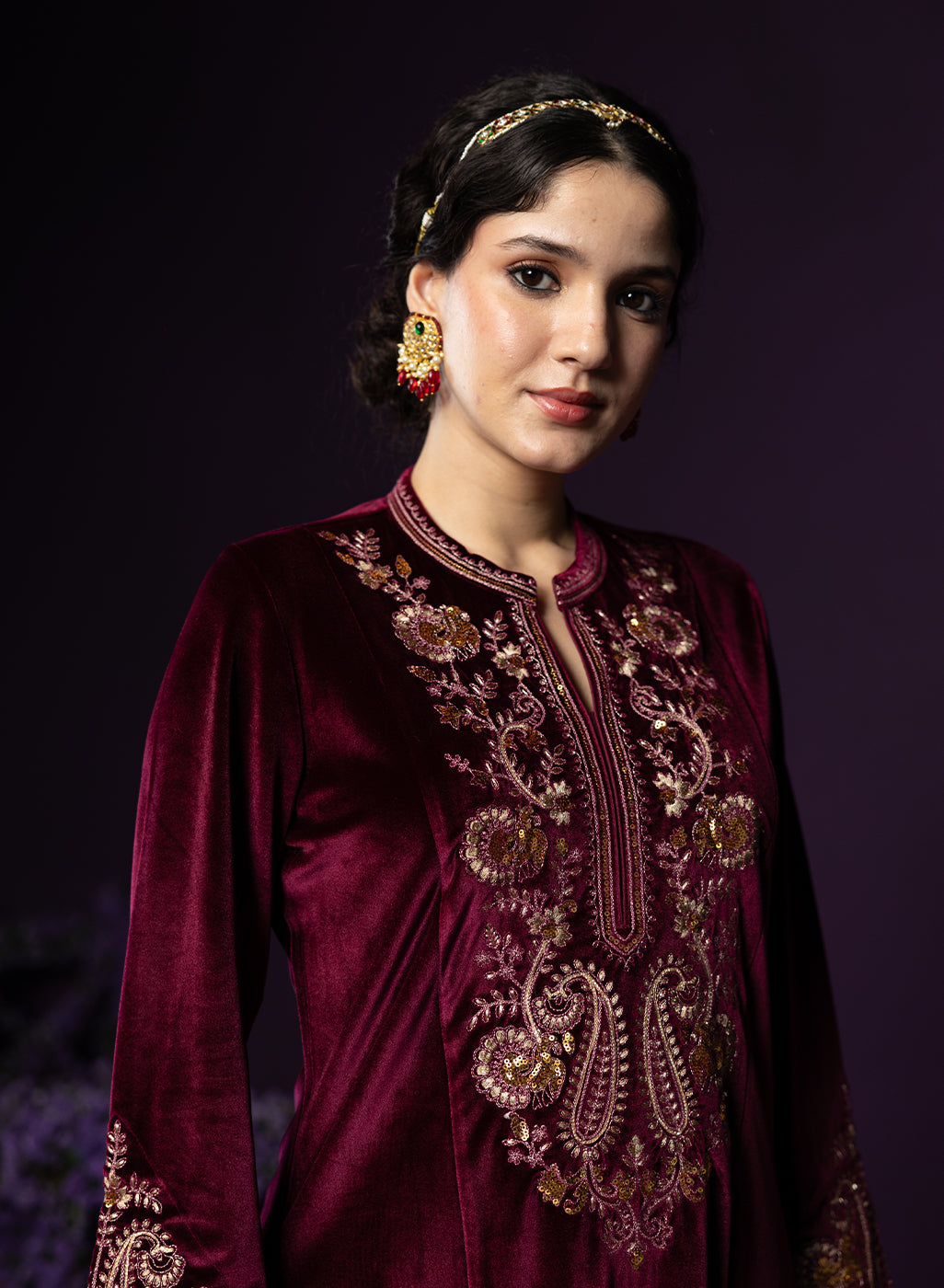 Style Tip: Opt for gold jewellery and a sleek bun—the maroon velvet pairs beautifully with warm-toned accessories.