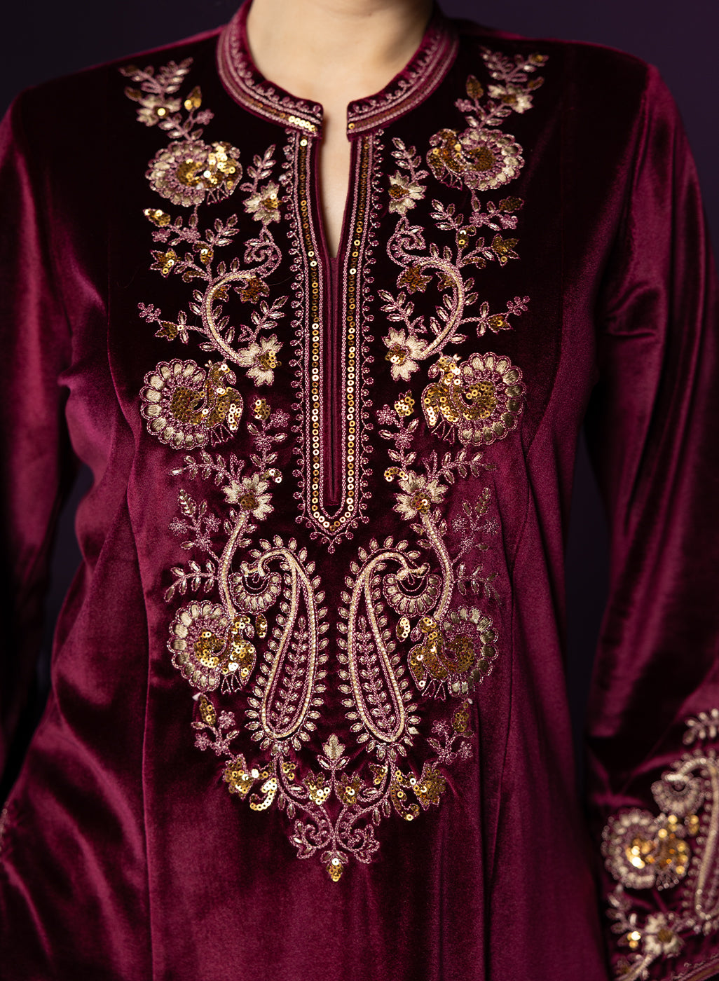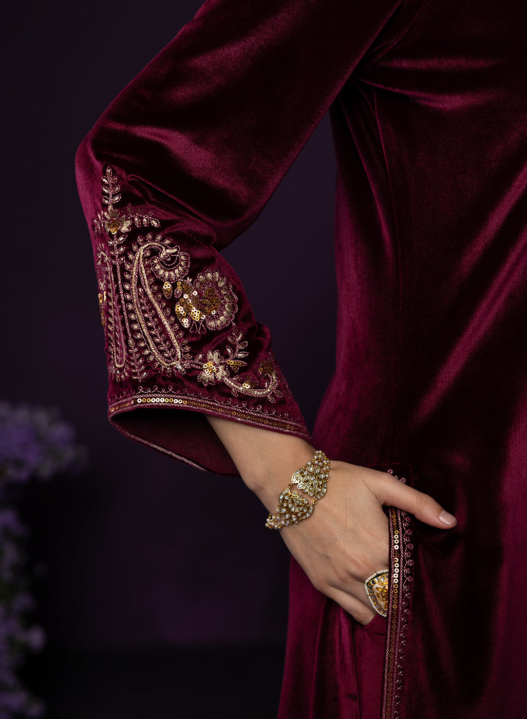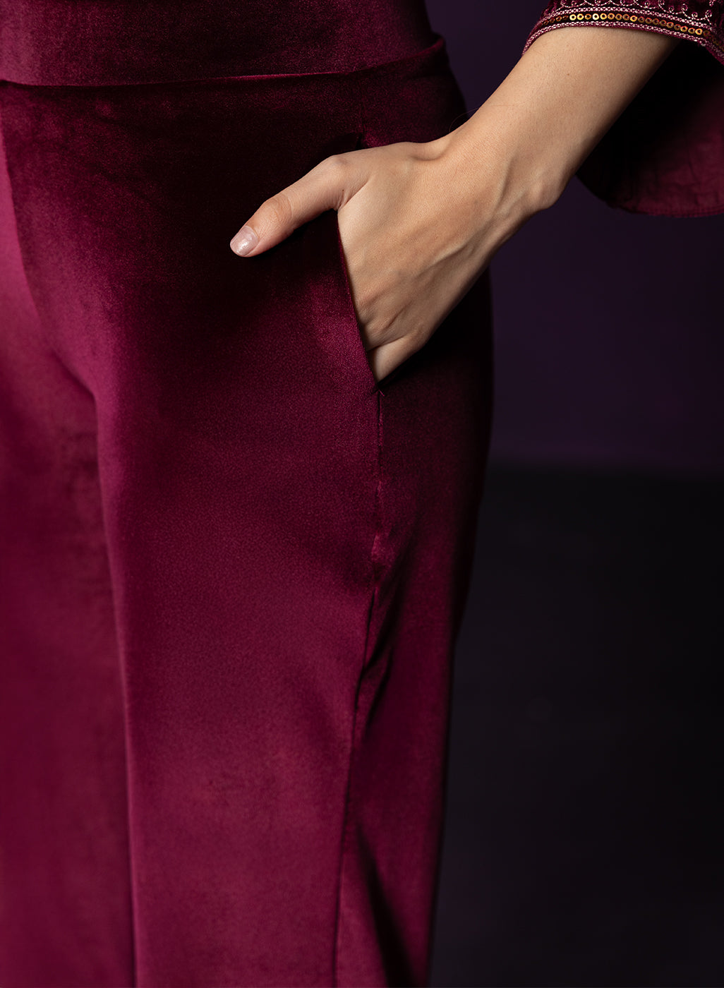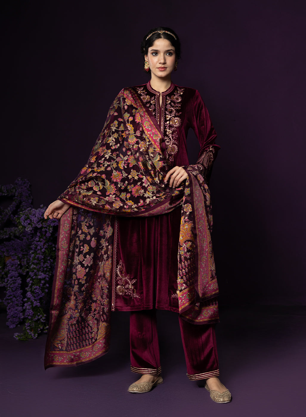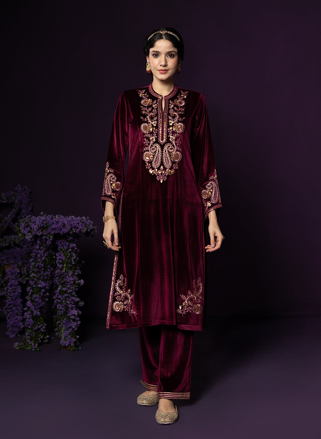 Style Tip: Opt for gold jewellery and a sleek bun—the maroon velvet pairs beautifully with warm-toned accessories.