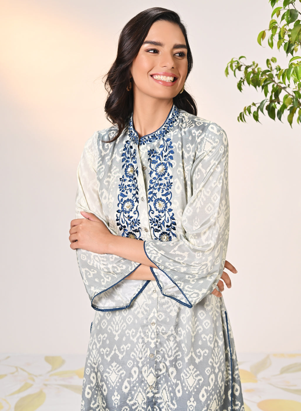 Side view of the model wearing Inaya ivory embroidered cotton linen slub kurta, highlighting detailed embroidery design.