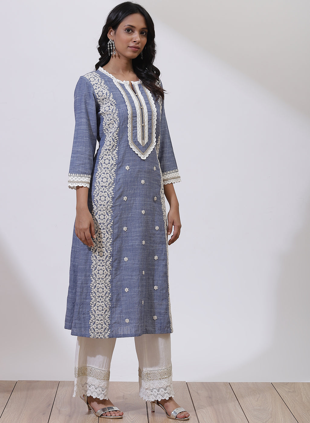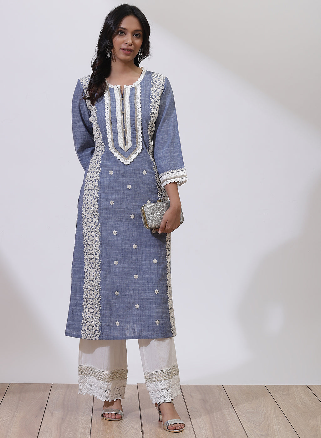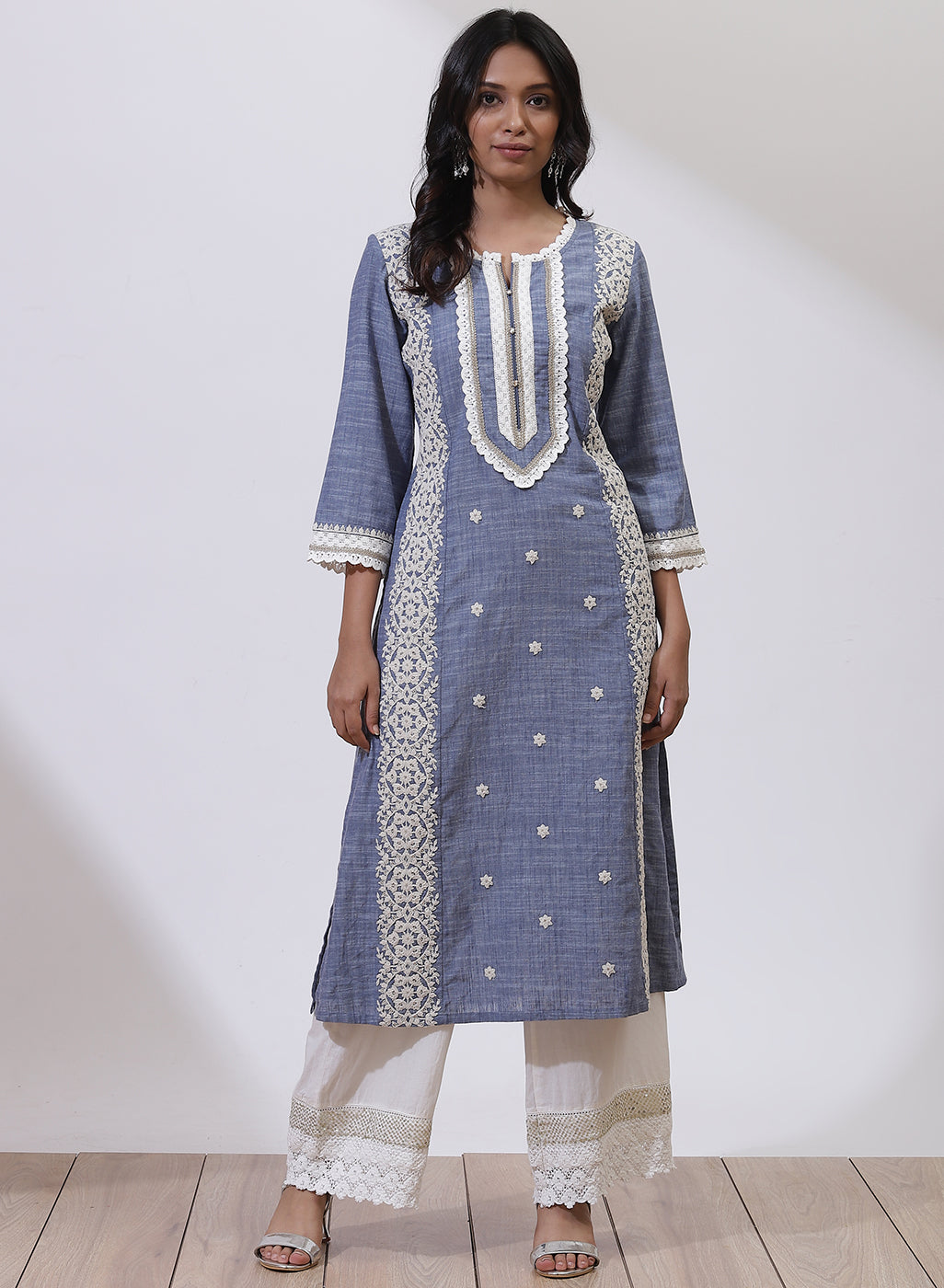 This season amp up your style game with the blue embroidered kurta by Lakshita. Featuring a round neck, 3/4th sleeves & a straight fit, pair this kurta with a pair of wide-legged palazzos or comfortable jeggings for a casual look.