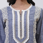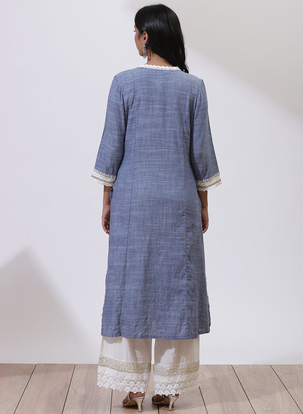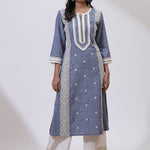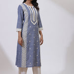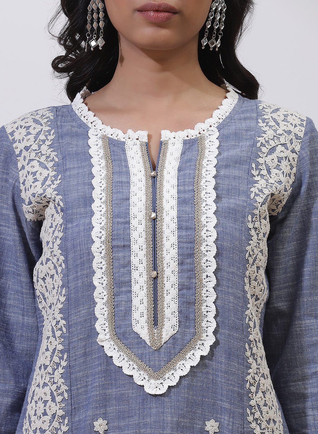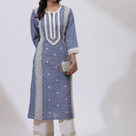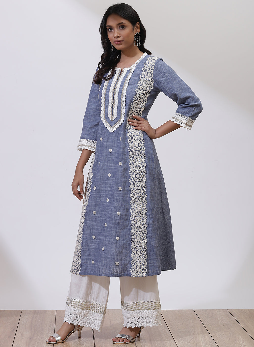 This season amp up your style game with the blue embroidered kurta by Lakshita. Featuring a round neck, 3/4th sleeves & a straight fit, pair this kurta with a pair of wide-legged palazzos or comfortable jeggings for a casual look.