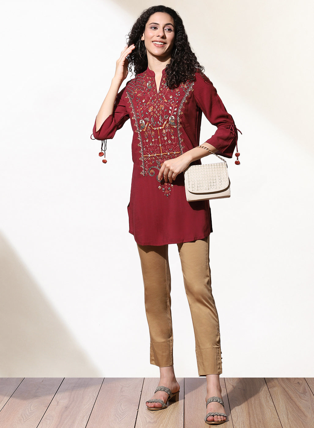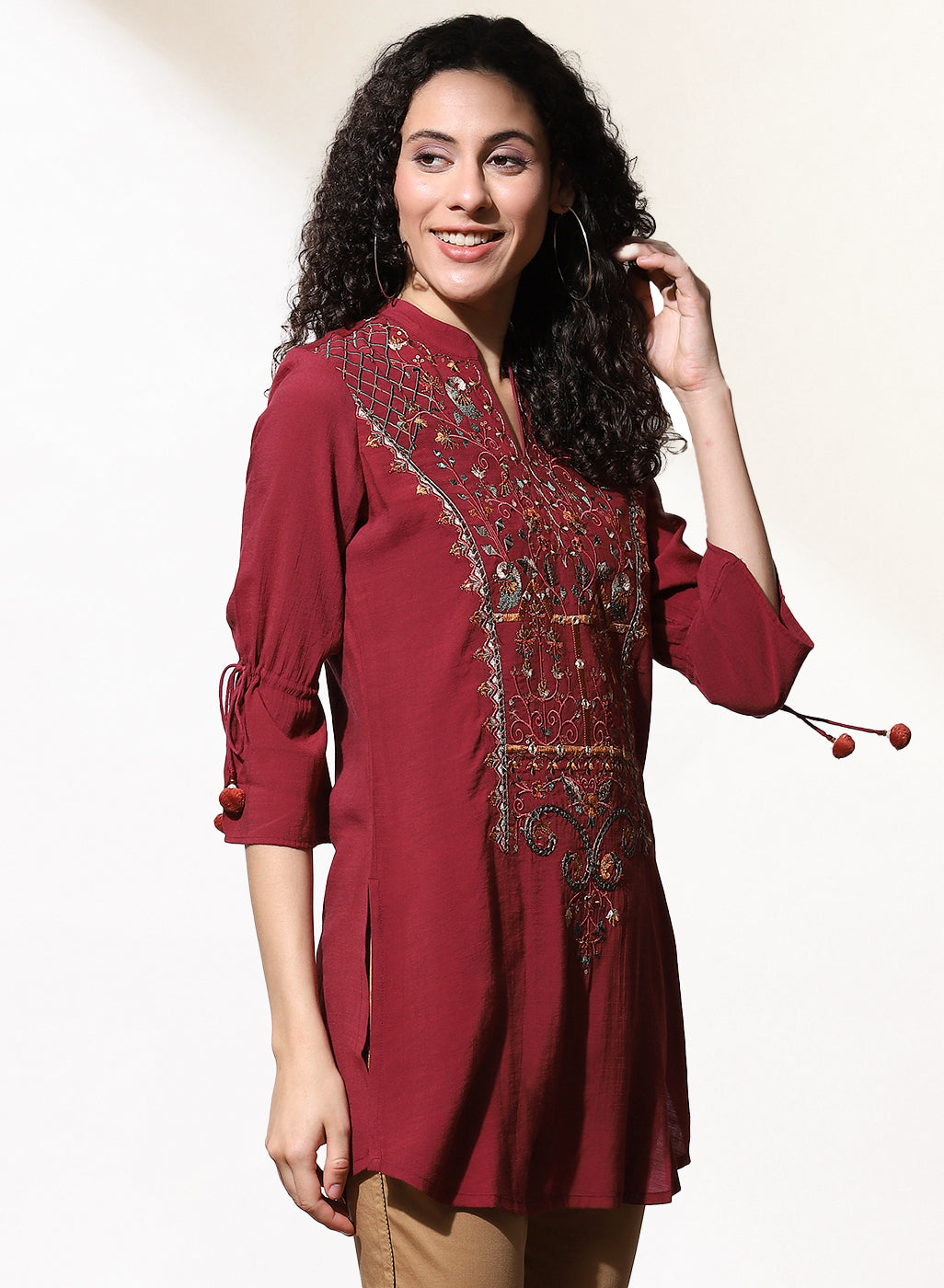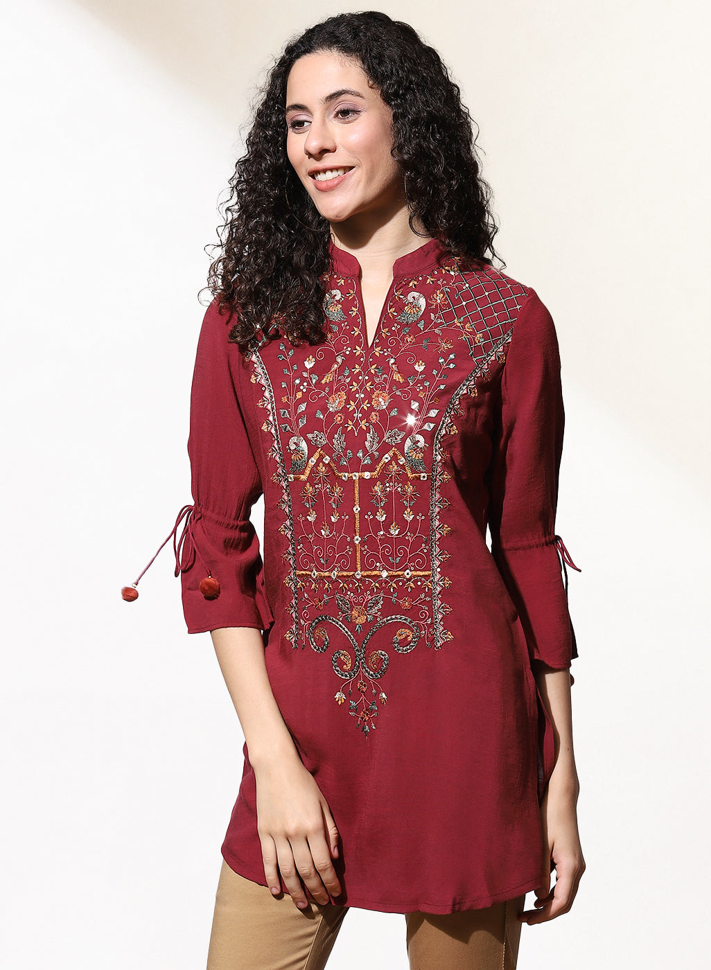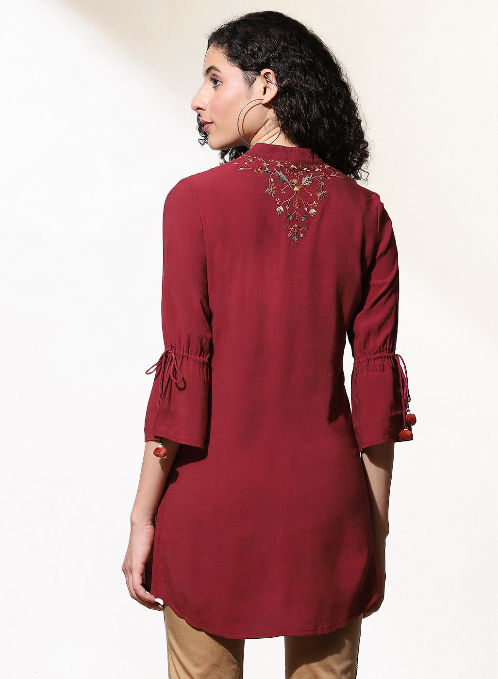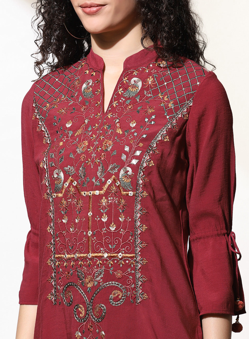 Featuring multi-colour embroidery at the bodice inspired by the tribes of India, this burgundy embroidered kurti by Lakshita is a must-have this season. Accentuated with tie-ups at the sleeve ends, pair this button-down kurti with a pair of wide-legged palazzos or comfortable jeans for a casual look.