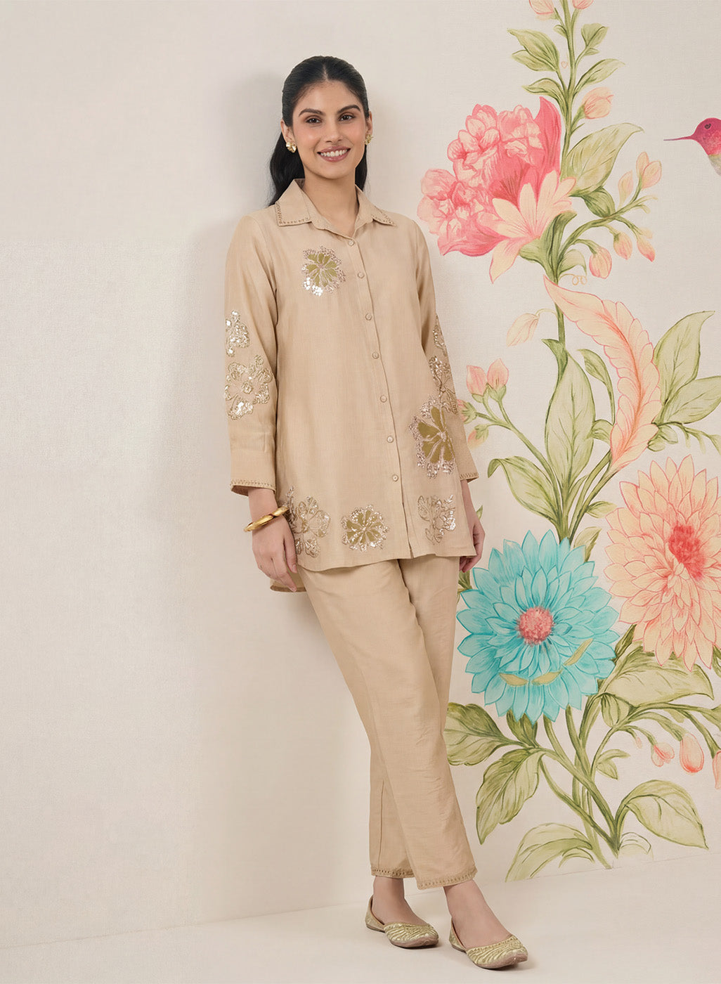 Beige Embroidered Linen Co-Ord Set
