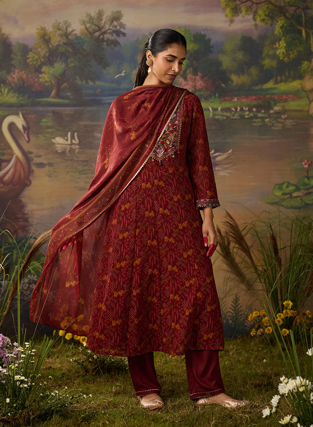 Kainat Maroon Traditional Floral Printed Viscose A-line Suit Set with Dupatta