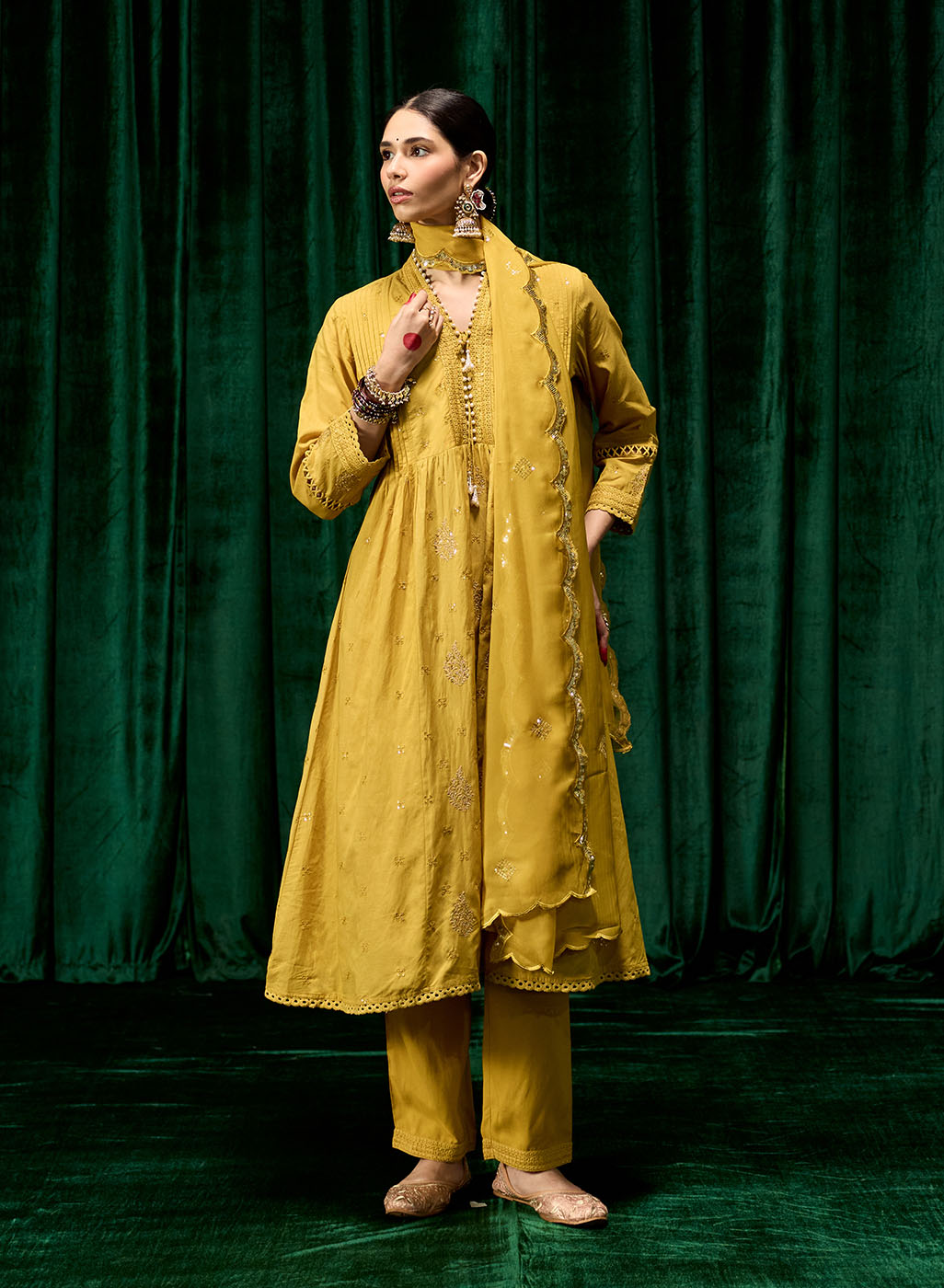 Svara Mustard Self Embroidered A-line Suit Set with Dupatta