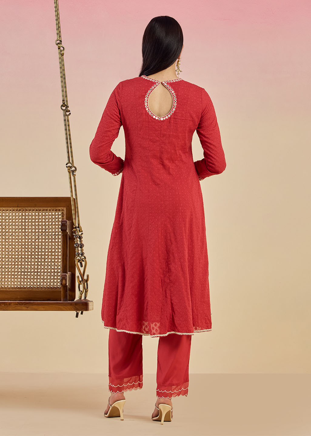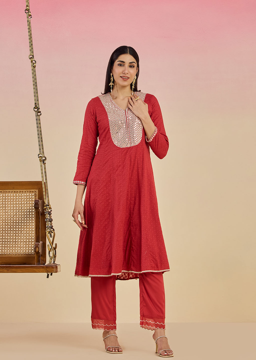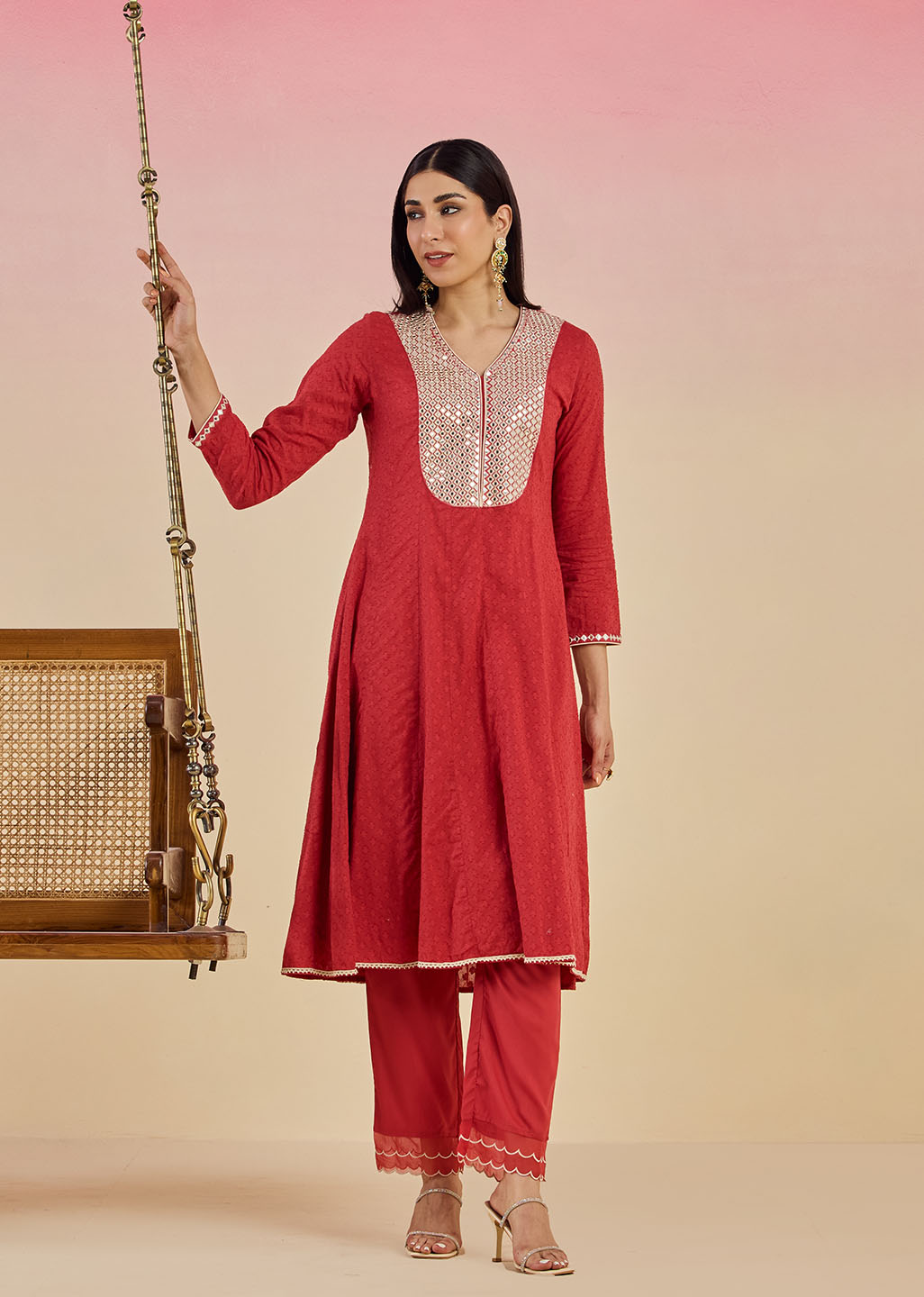This deep red cotton jacquard kurta is a perfect example of how less can be so much more. The solid flared kurta lets the fabric’s natural texture shine, while the neckline, sleeve cuffs, and back keyhole are brought to life with intricate mirrorwork that catches the light with every move. The contrast piping and lace detail on the hem add just the right finishing touch. Pair it with the matching straight bottoms with scalloped cuffs, edged with zariwork, making this outfit understated yet festive.