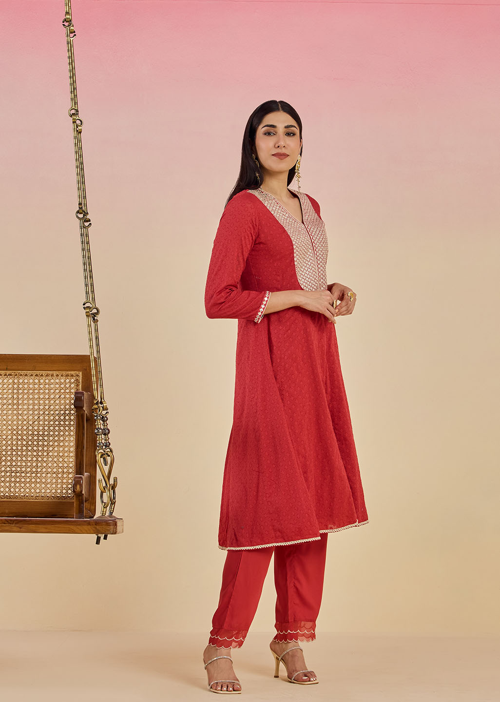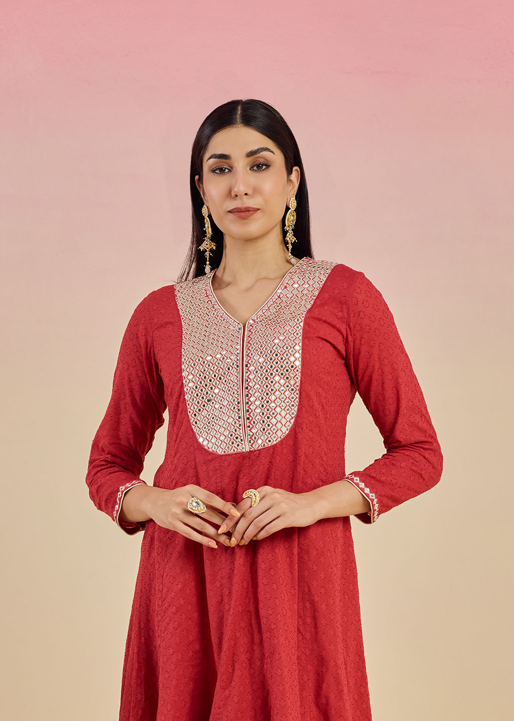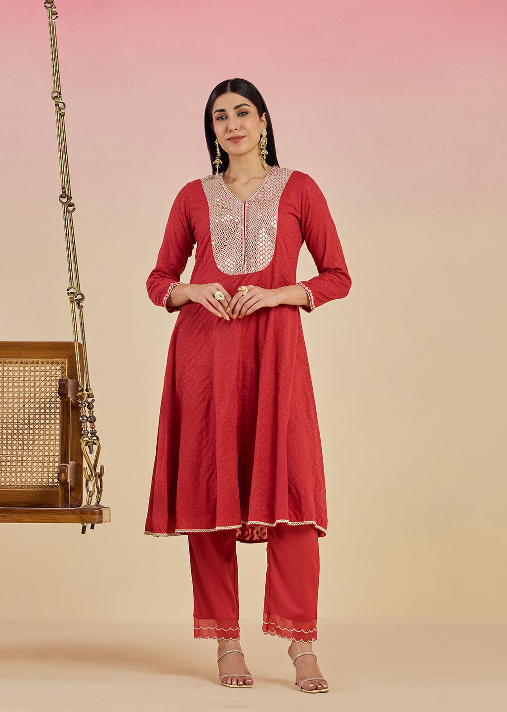 This deep red cotton jacquard kurta is a perfect example of how less can be so much more. The solid flared kurta lets the fabric’s natural texture shine, while the neckline, sleeve cuffs, and back keyhole are brought to life with intricate mirrorwork that catches the light with every move. The contrast piping and lace detail on the hem add just the right finishing touch. Pair it with the matching straight bottoms with scalloped cuffs, edged with zariwork, making this outfit understated yet festive.