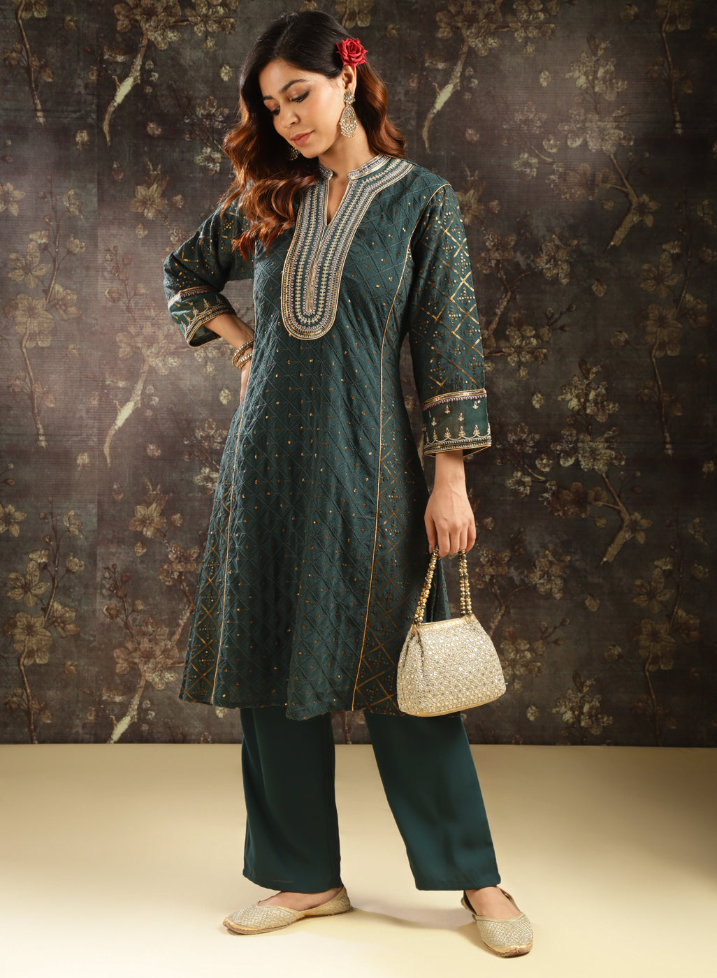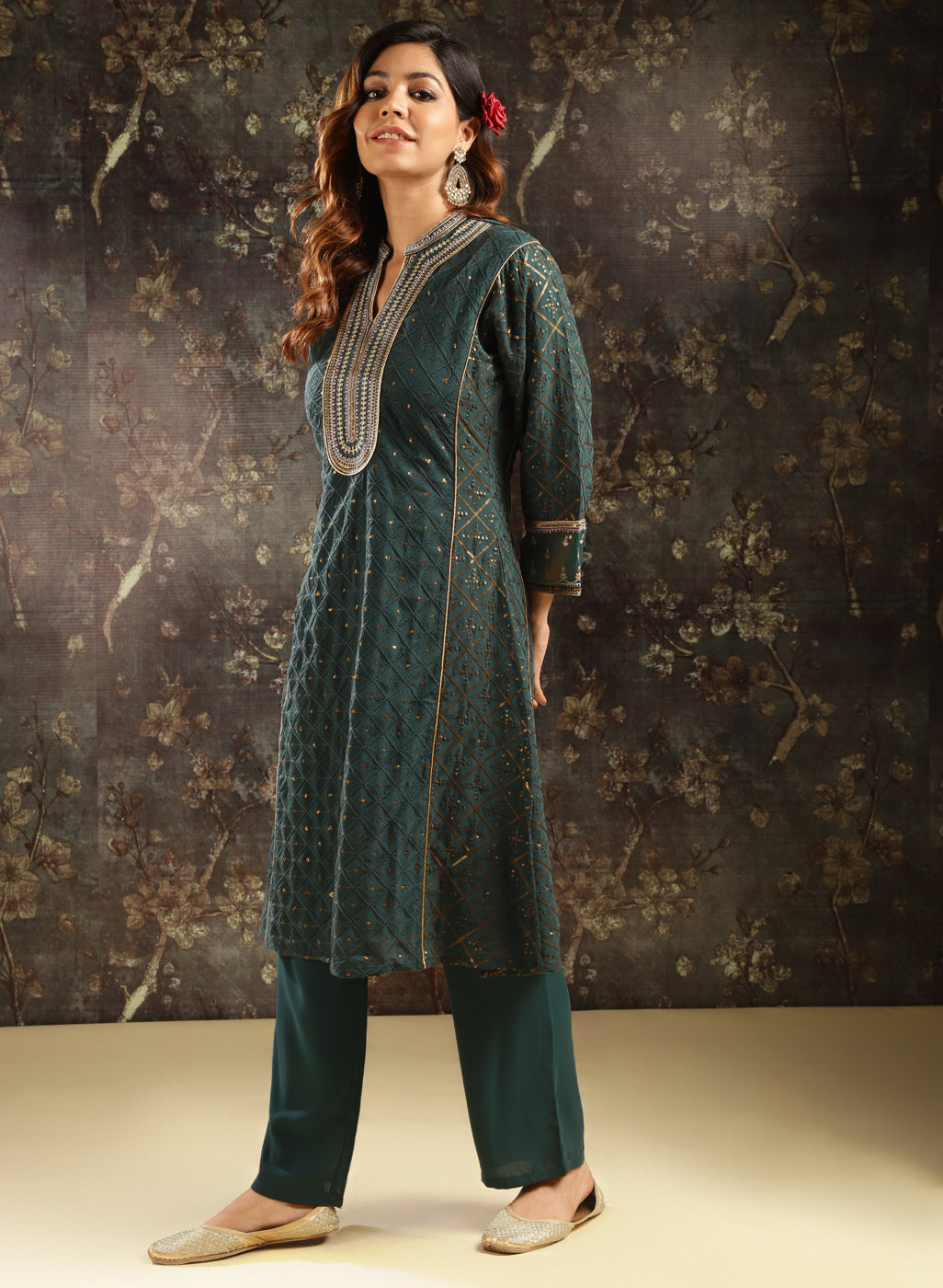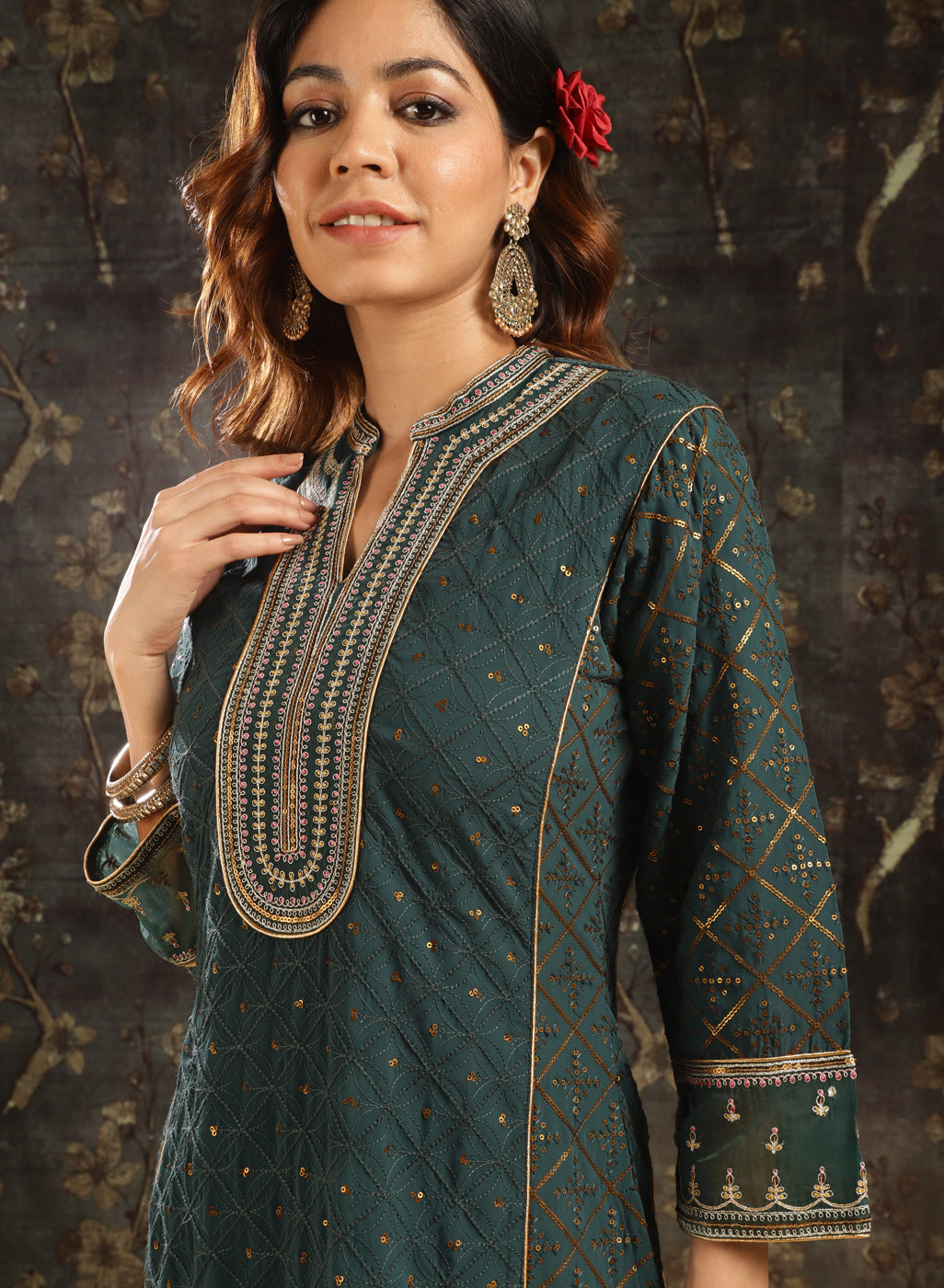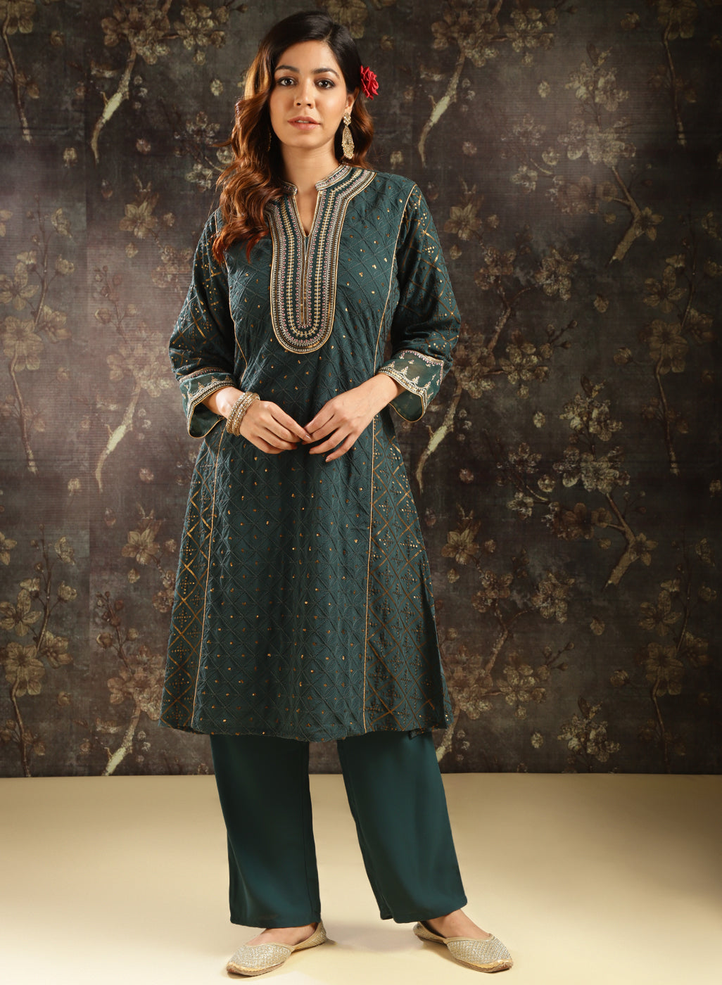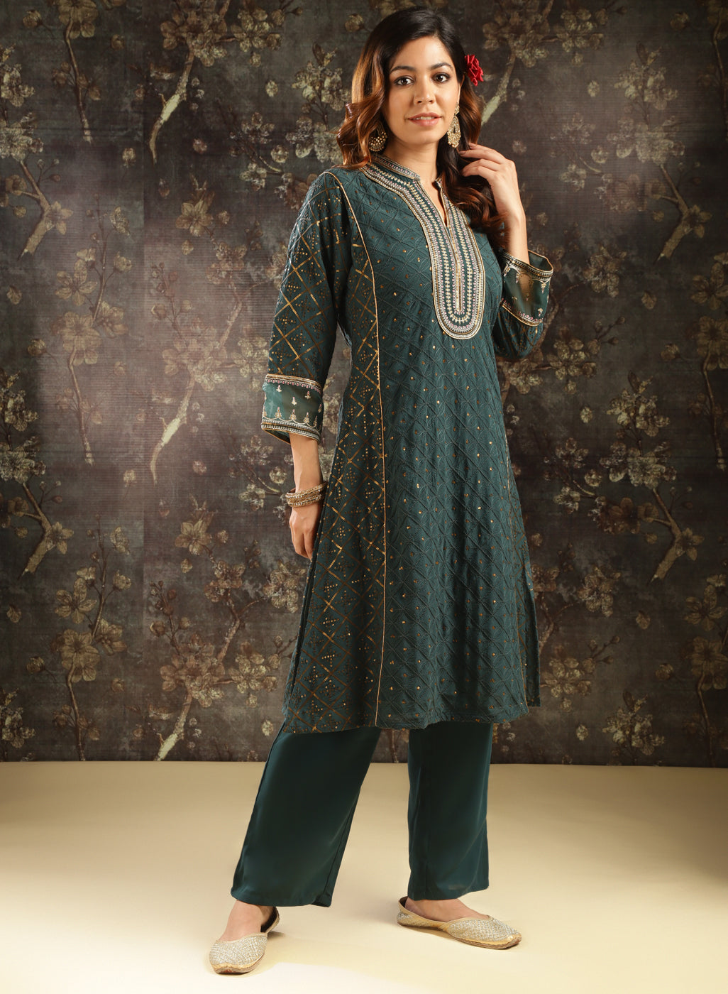 Green Monochrome Embroidery Rayon Slub Kurta Set