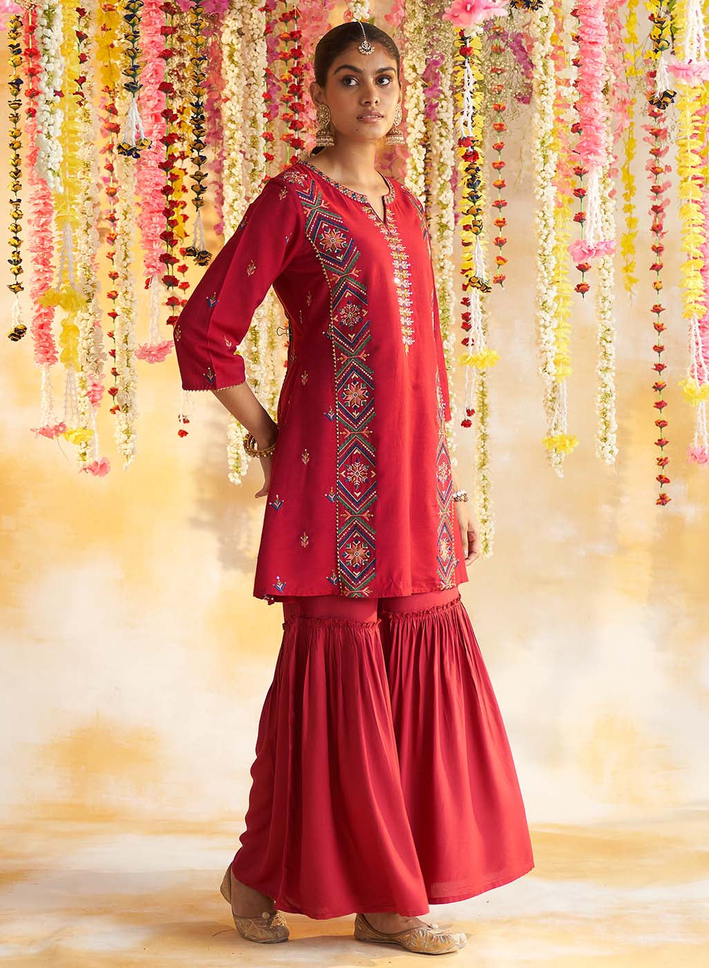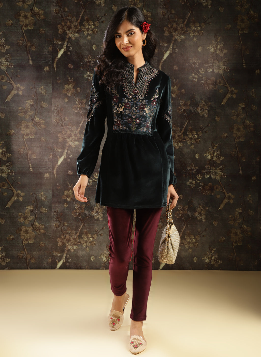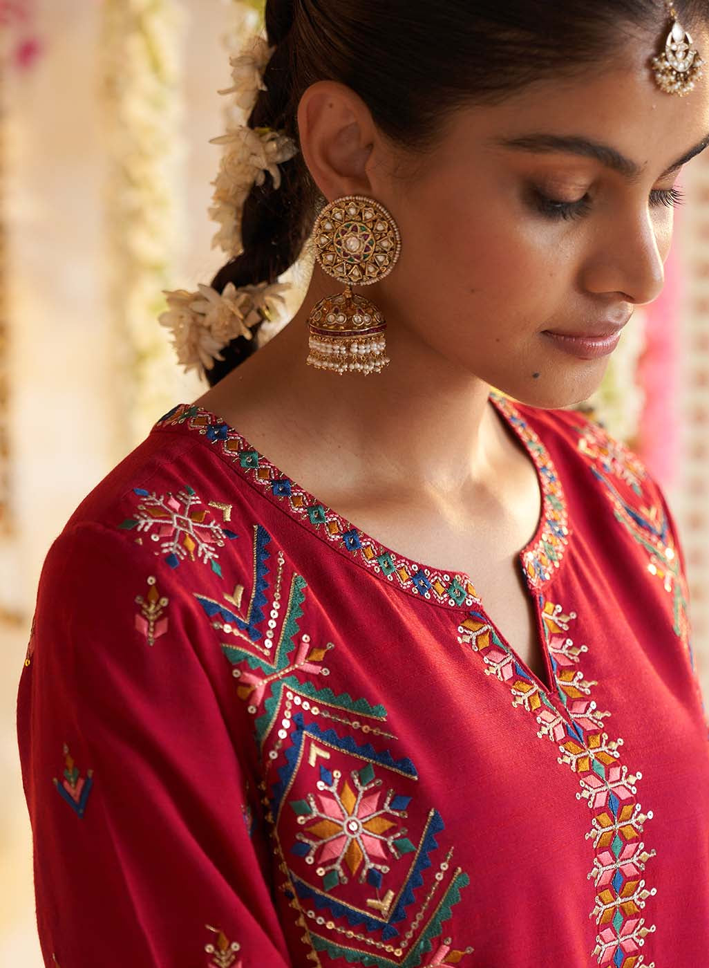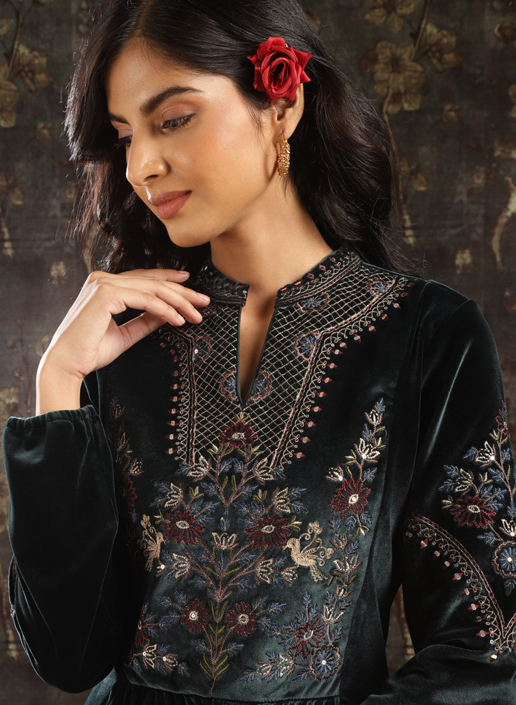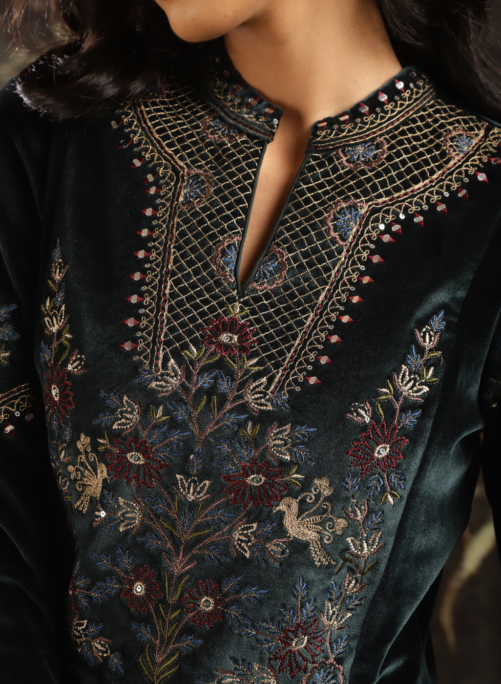 Green Monochrome Embroidery Rayon Slub Kurta Set
