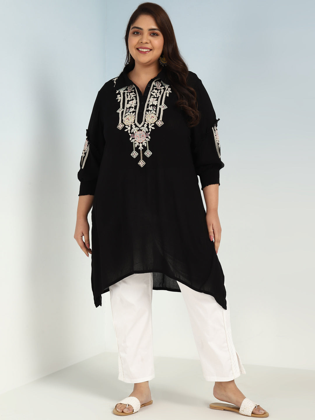 Black Mid-length Cotton Kurti for Women with Embroidery