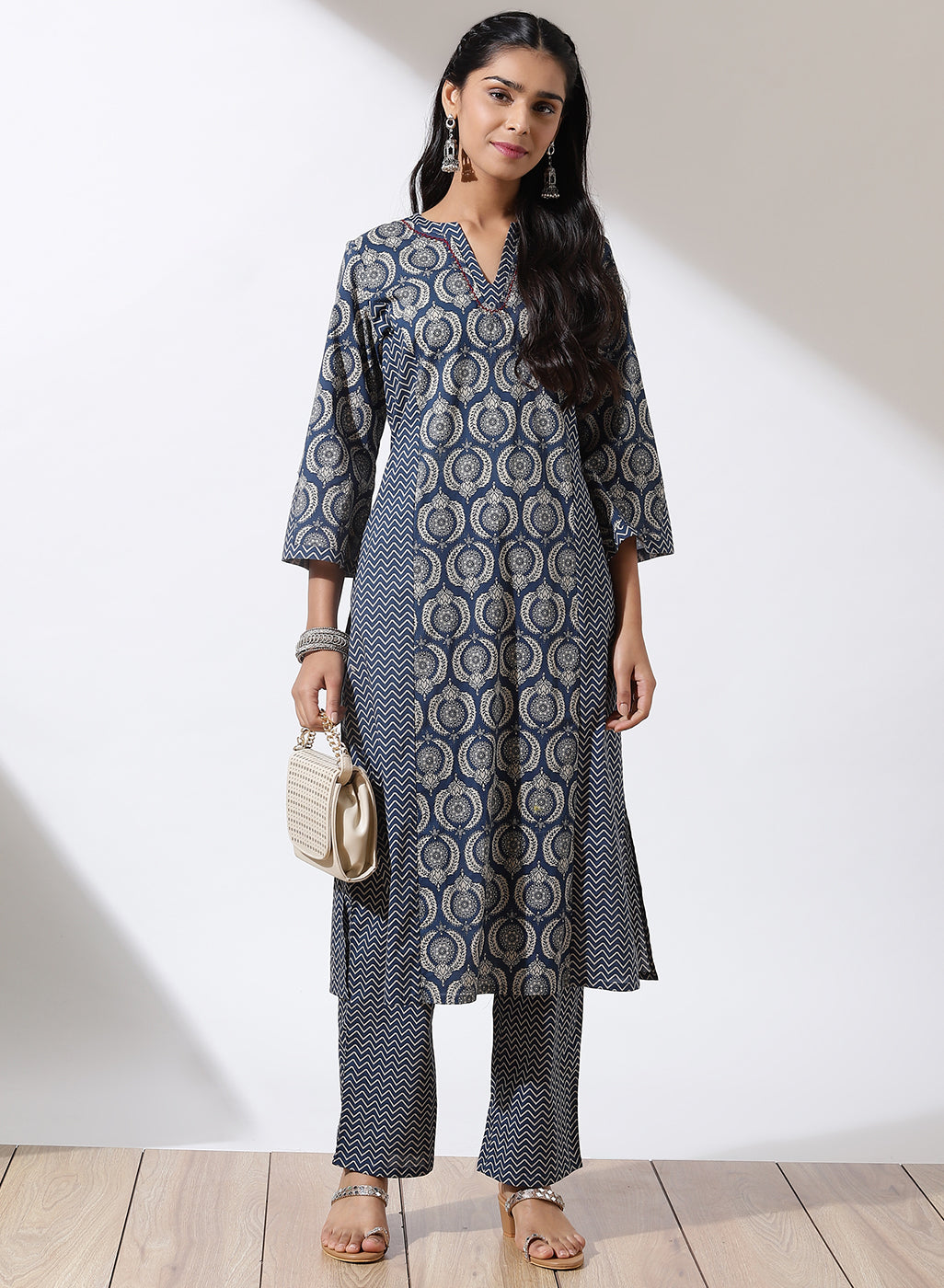 The straight fit printed kurta set in cotton by Lakshita is the perfect addition to your wardrobe this season. Paired with matching printed palazzos with a elasticated band, accessorize this kurta set with jhumkas & mojris to complete your look.
