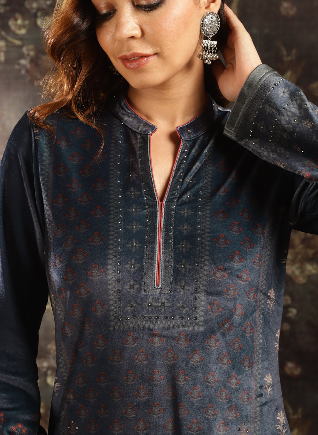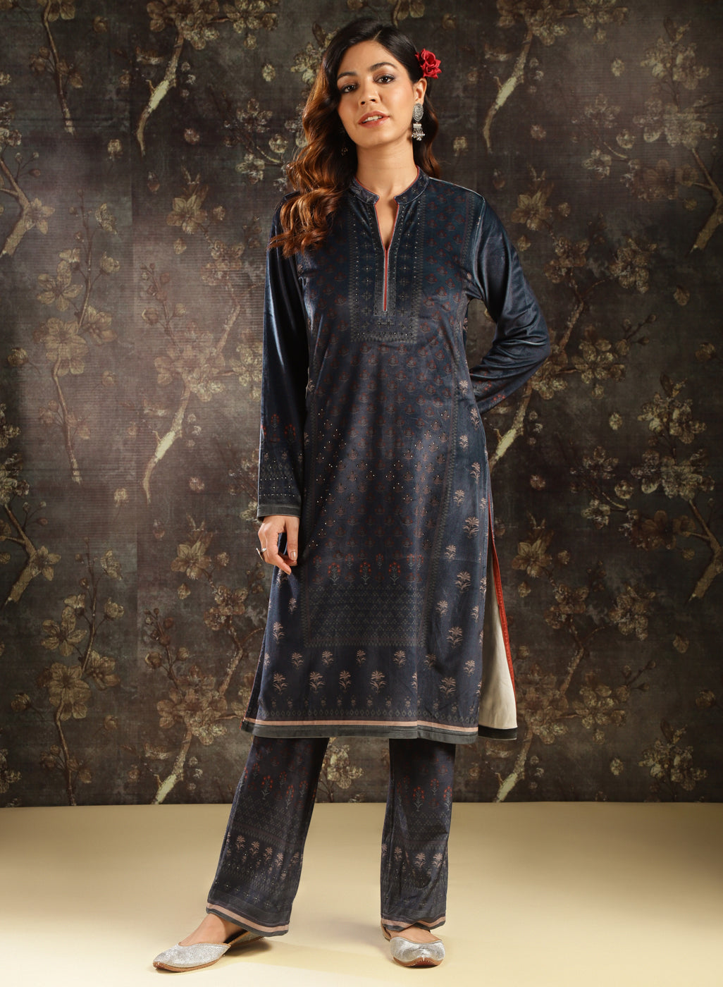 Navy Blue Printed Velvet Kurta Set with Swarovski Work