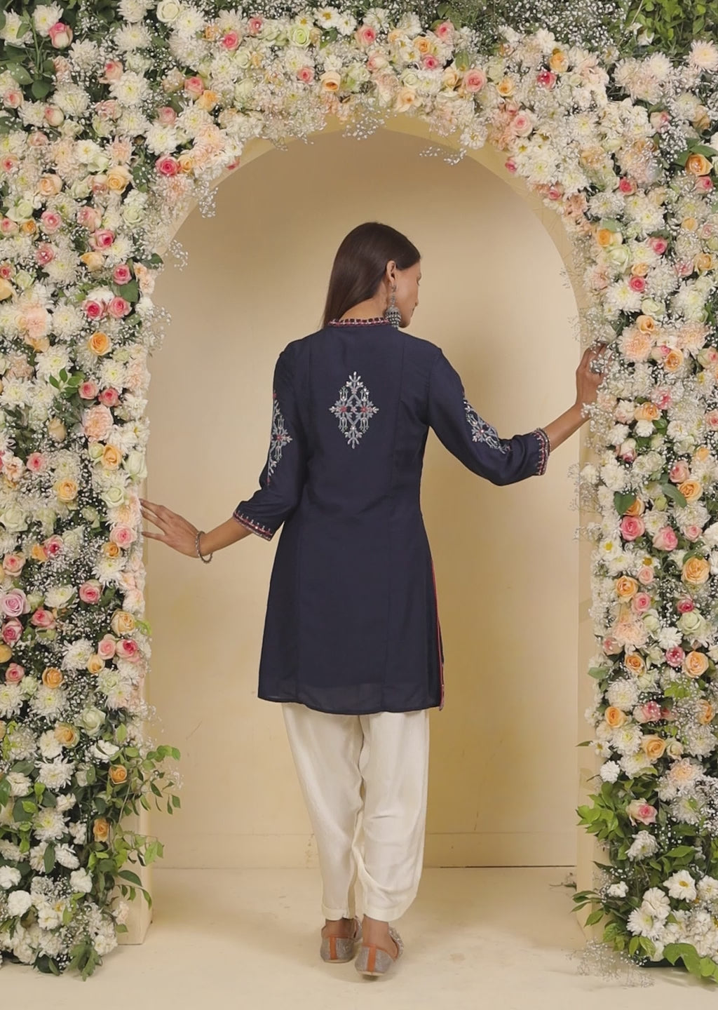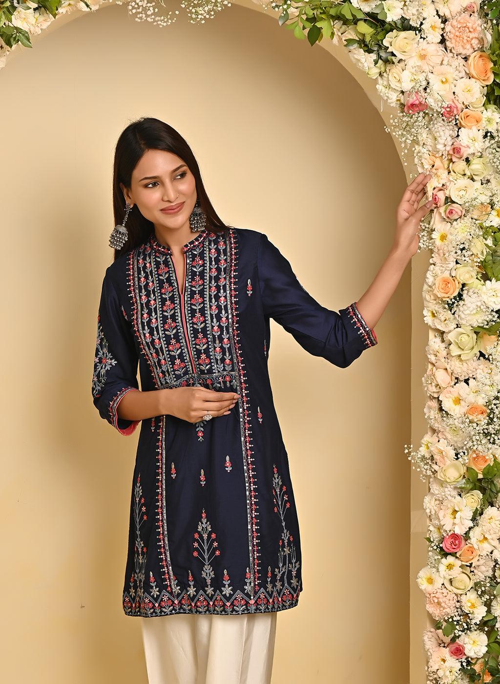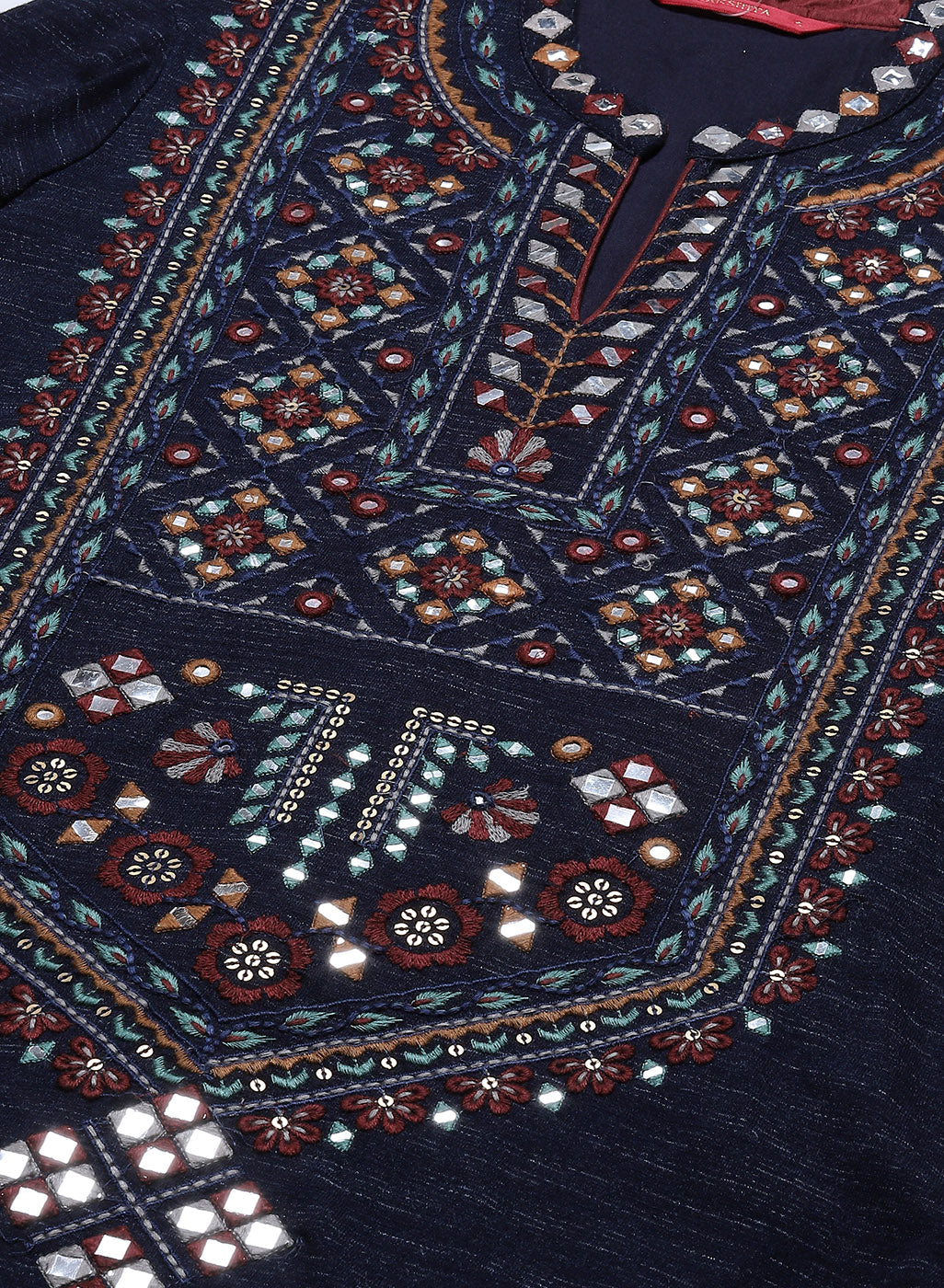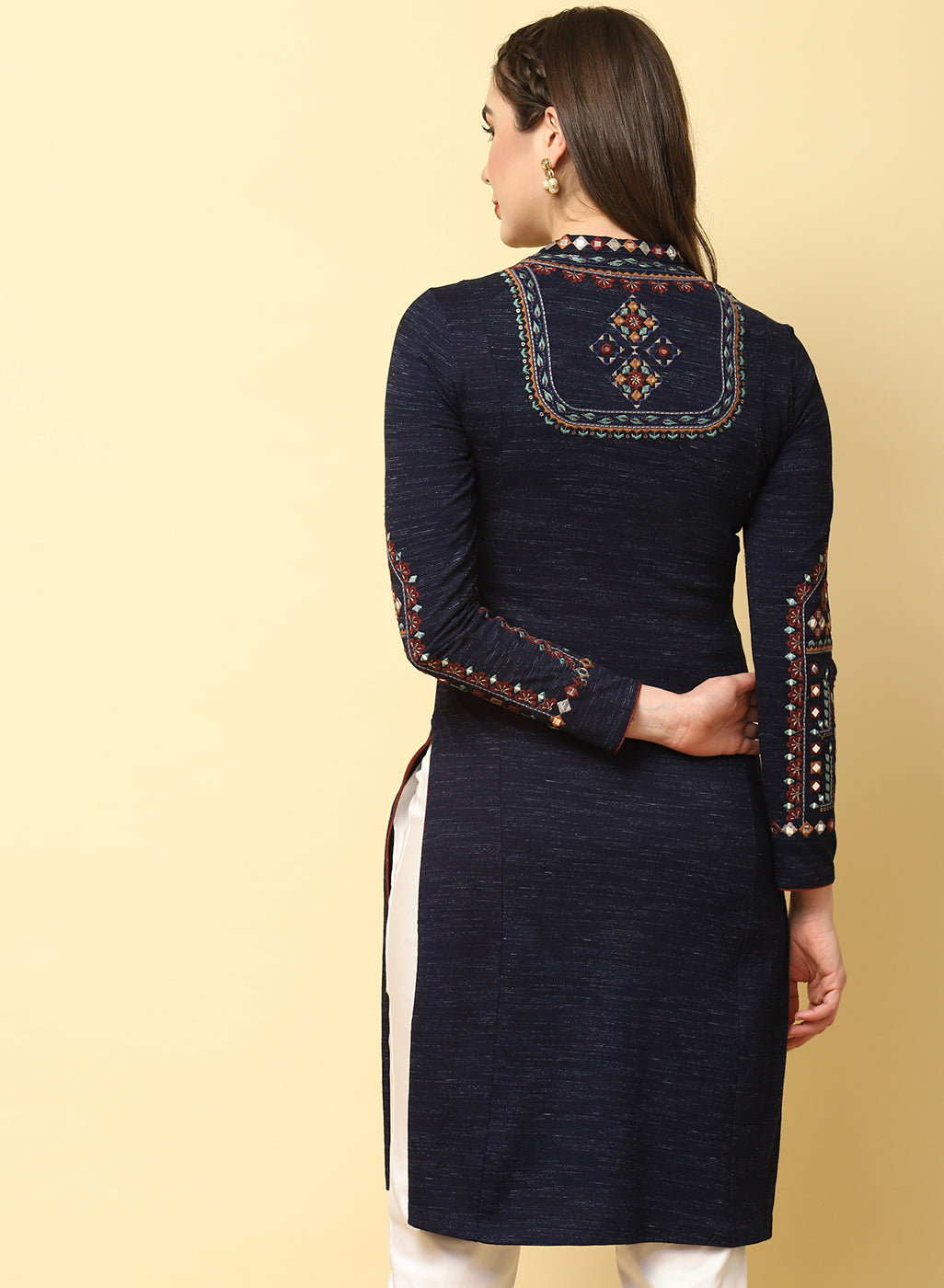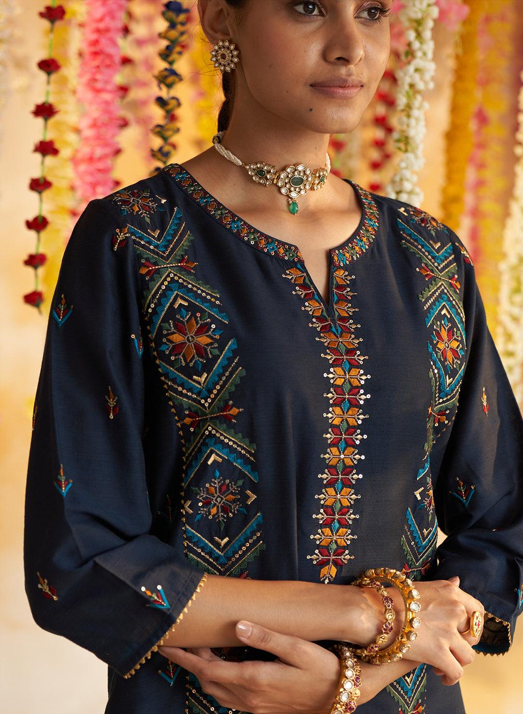 Navy Blue Embroidered Viscose Silk Slub Kurta