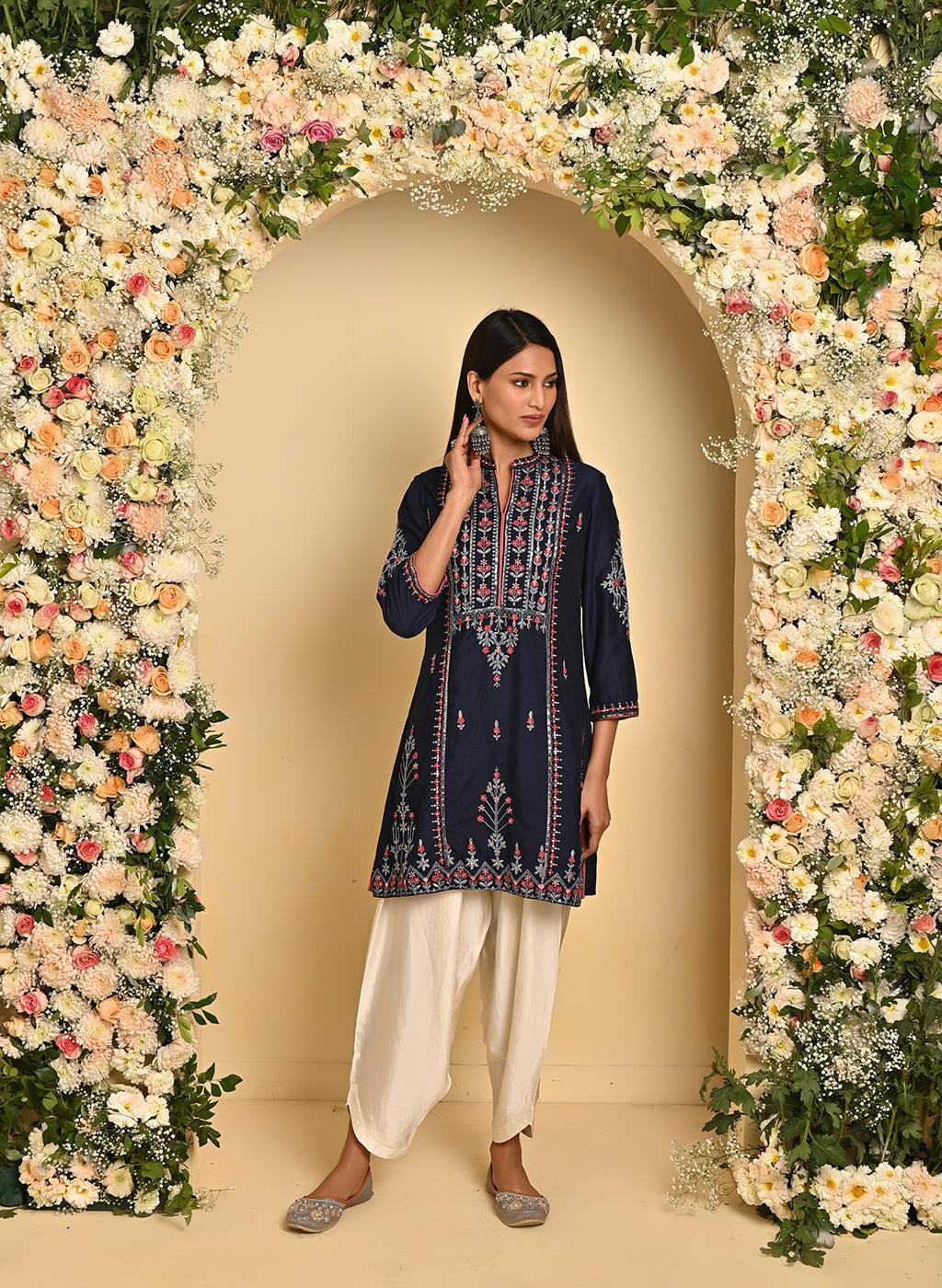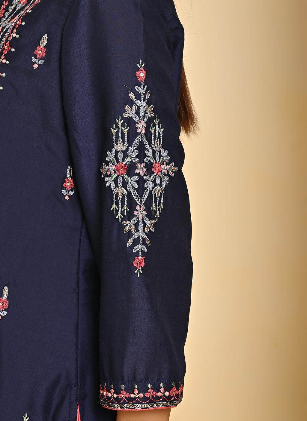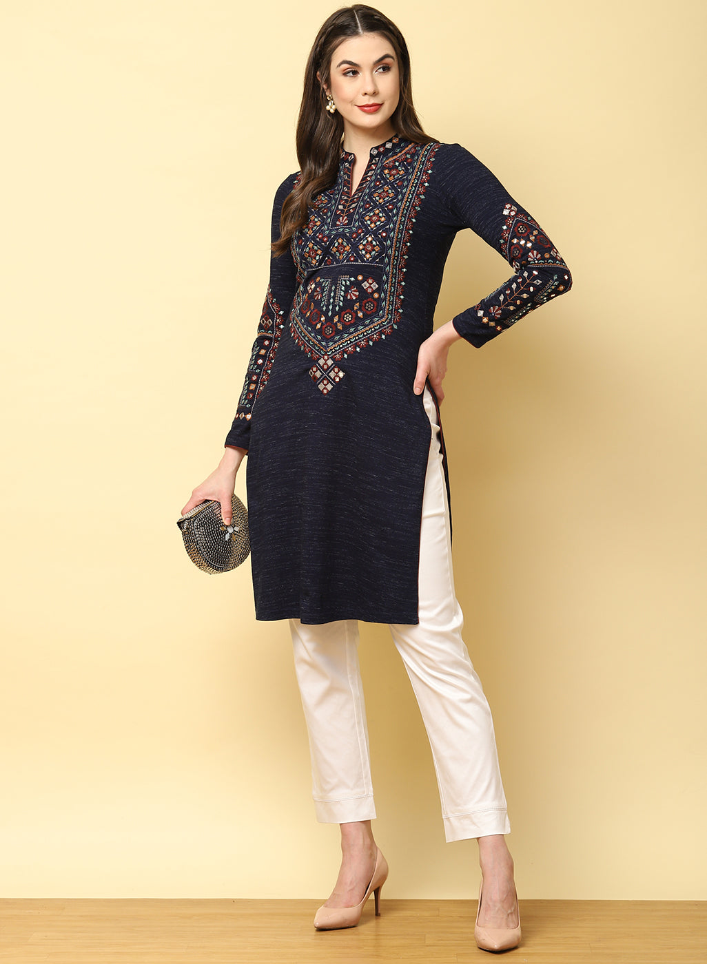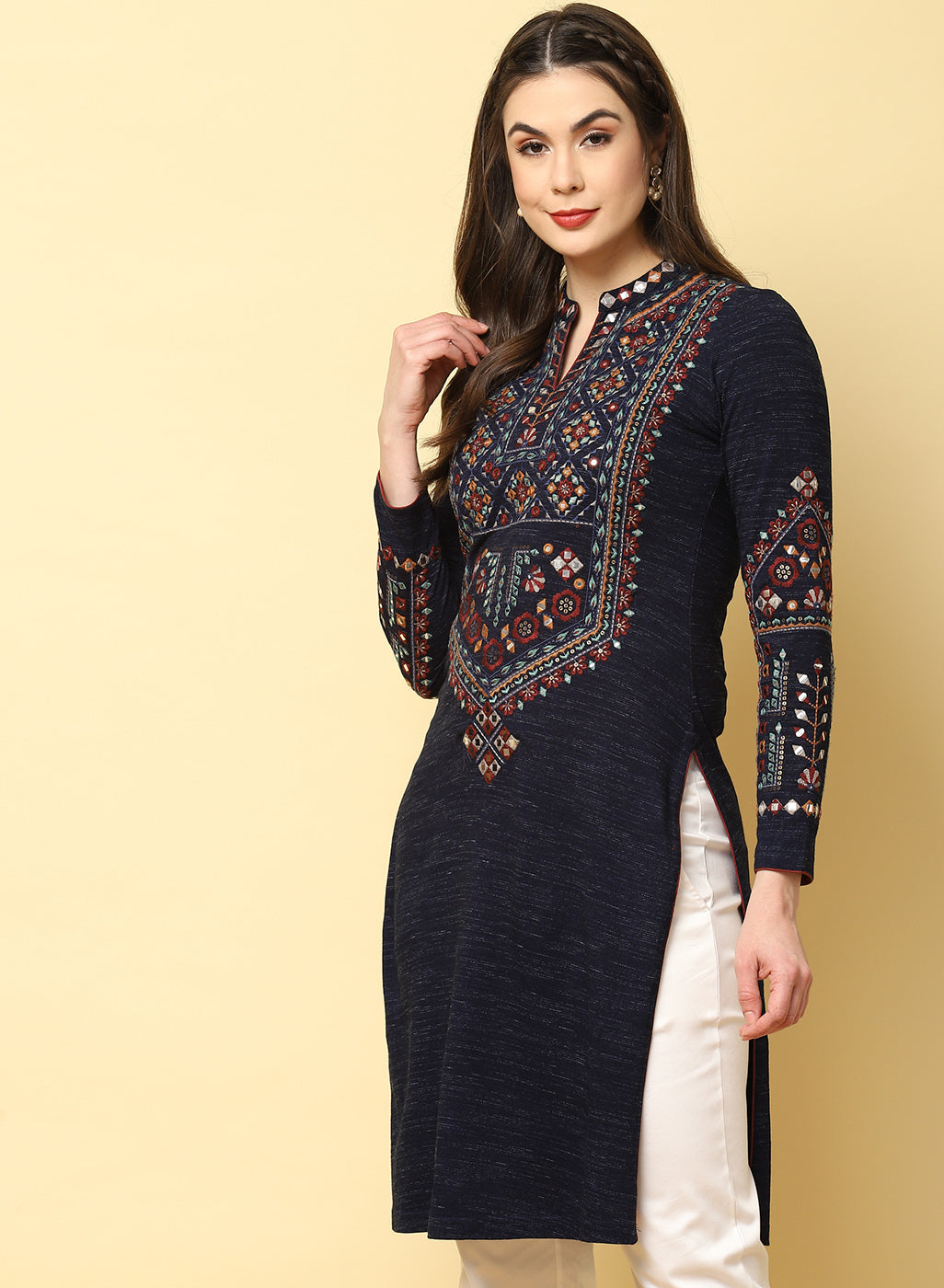 Navy Blue Embroidered Viscose Silk Slub Kurta