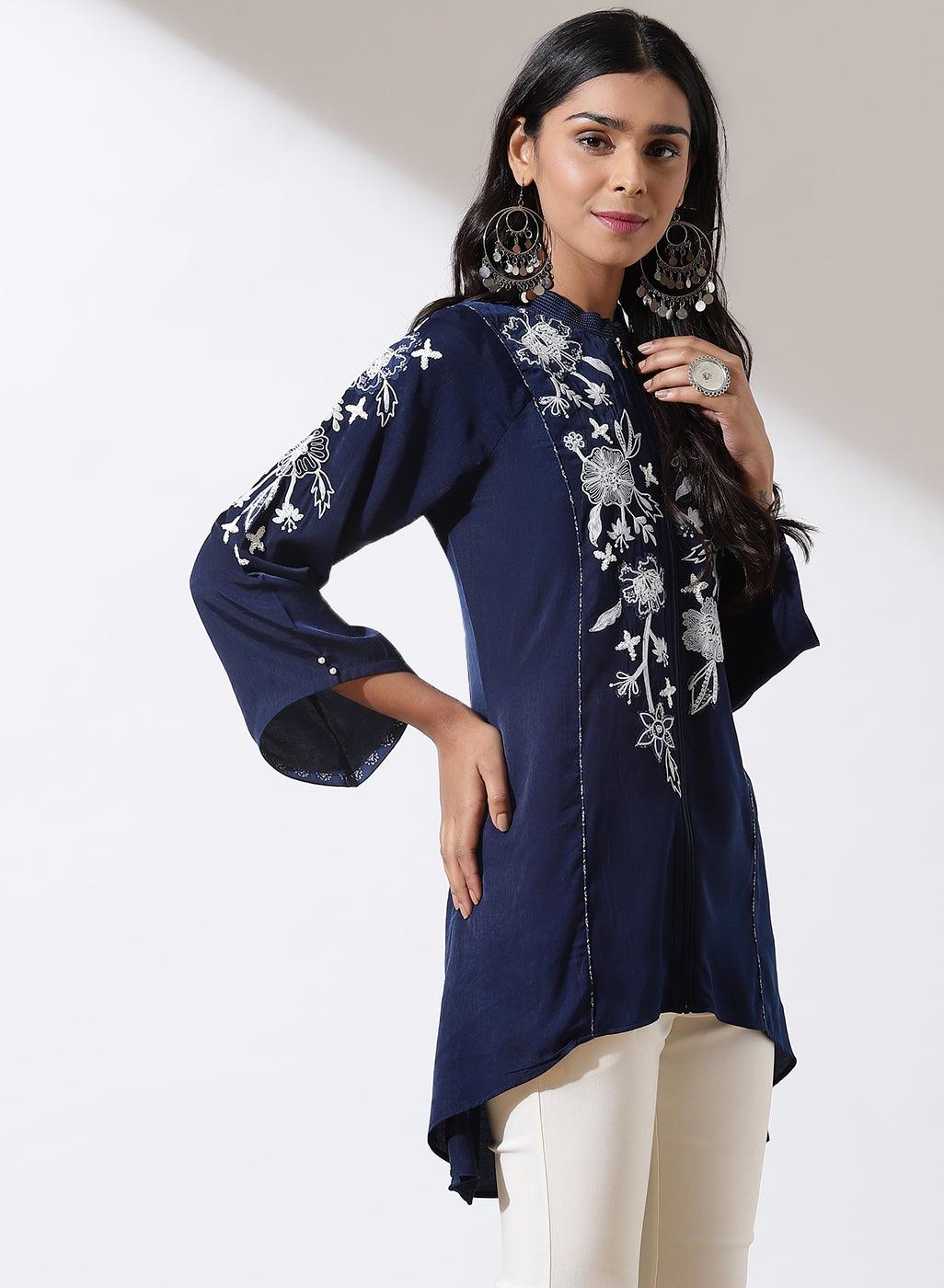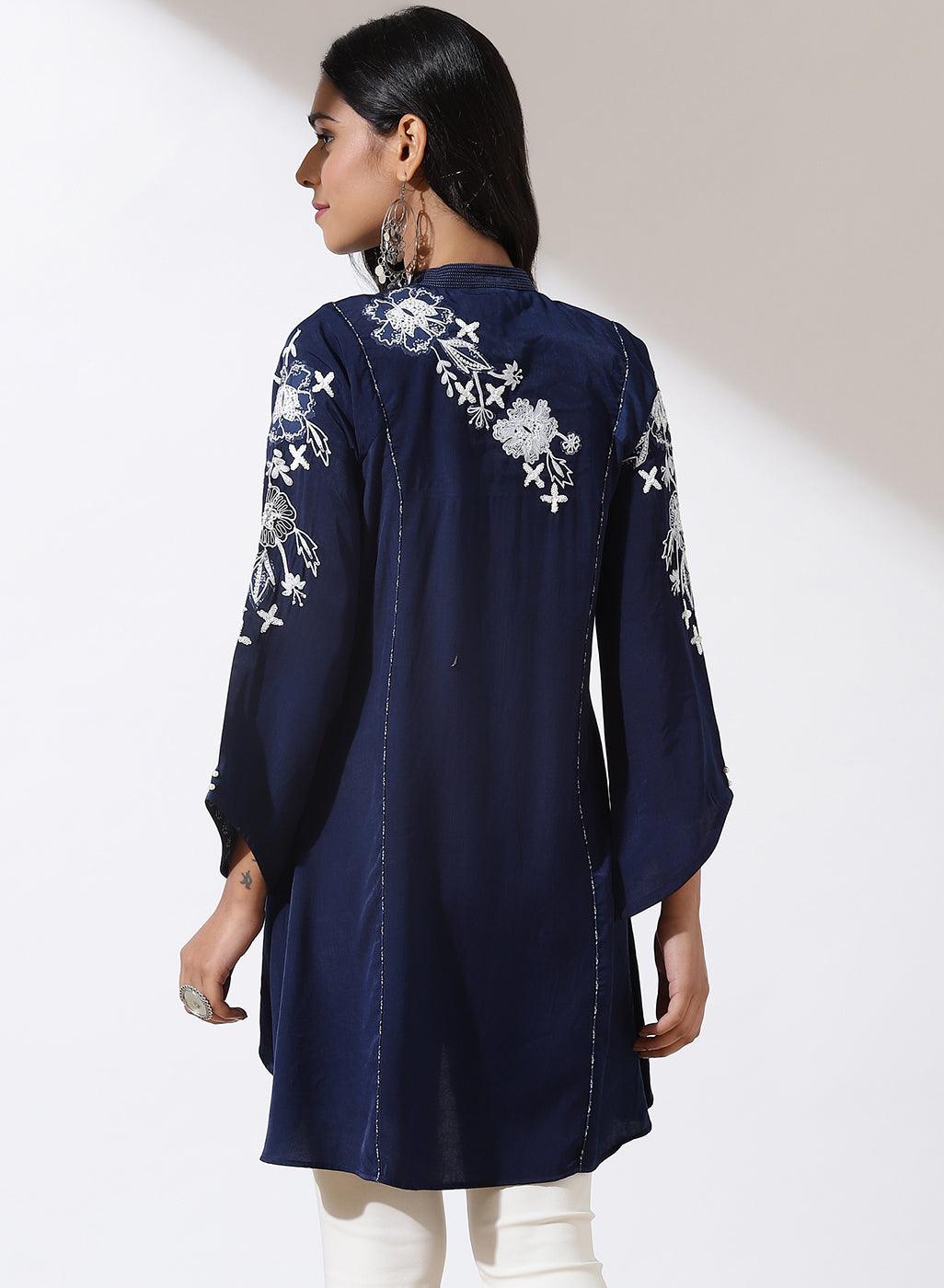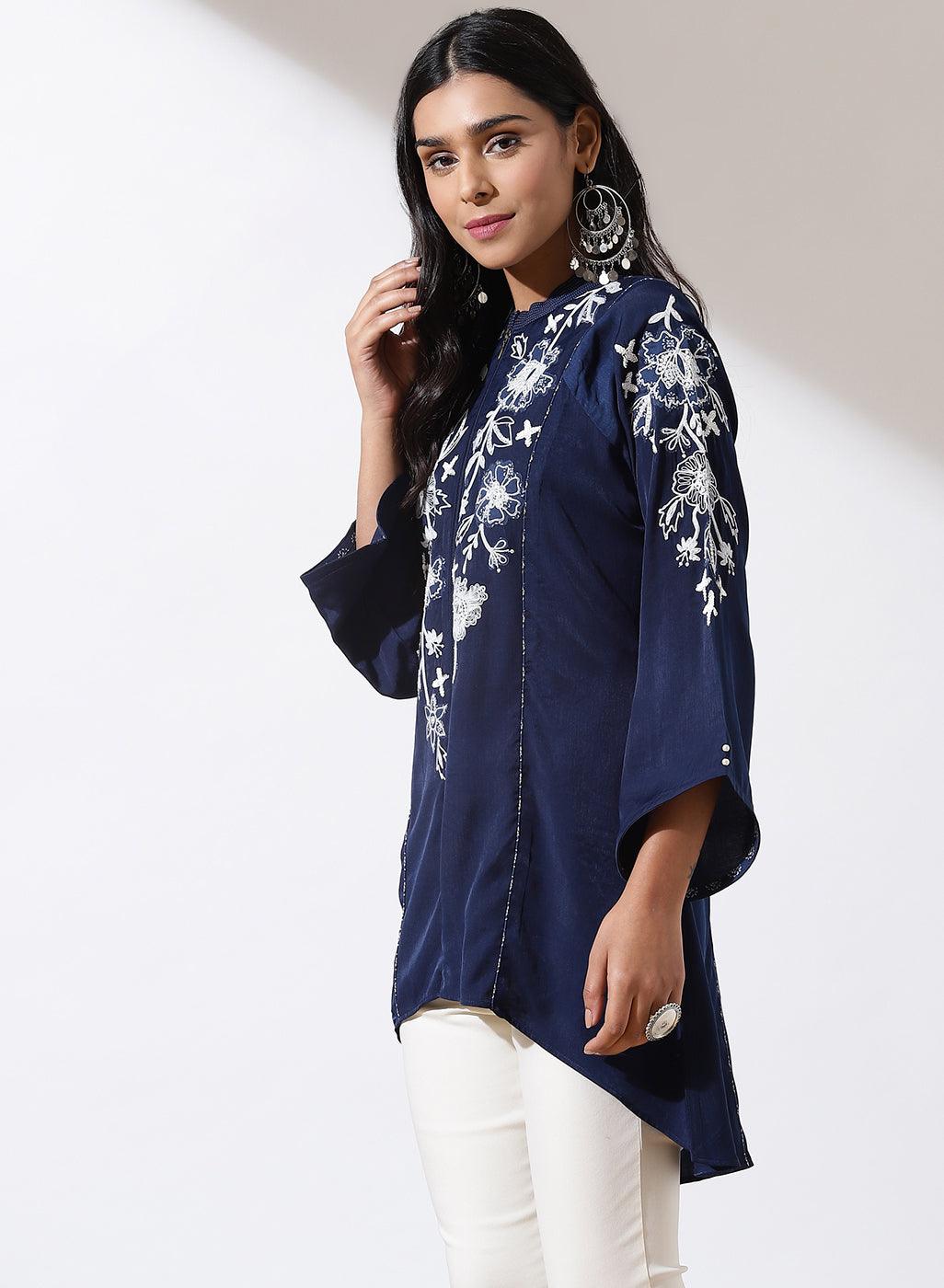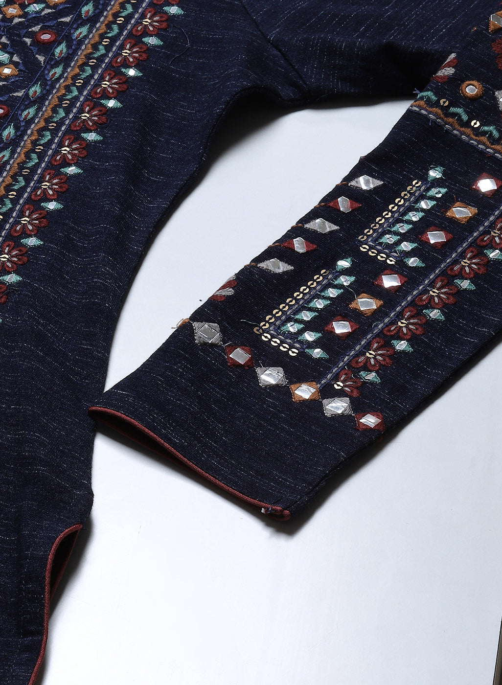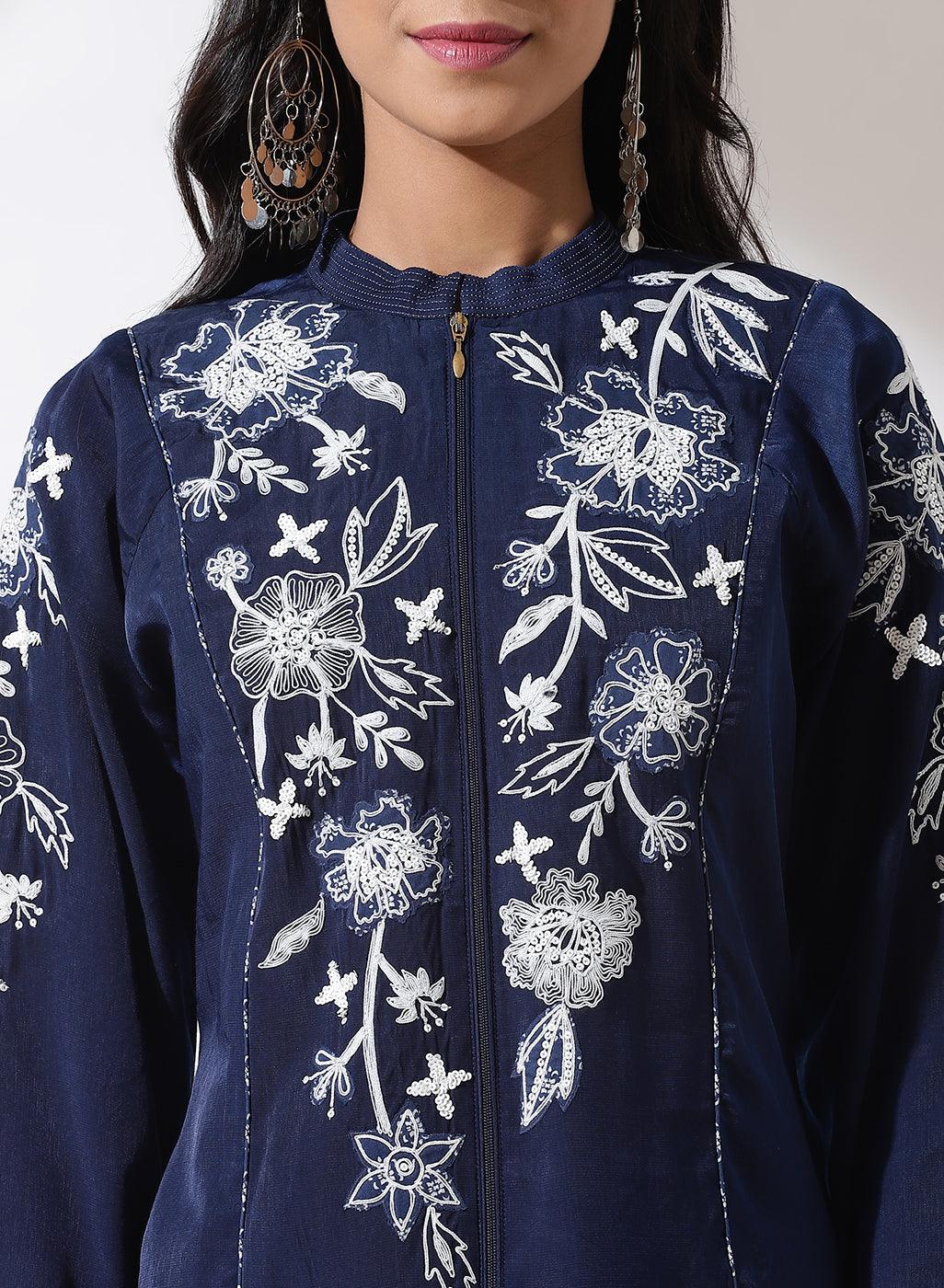 Navy Blue Embroidered Viscose Silk Slub Kurta