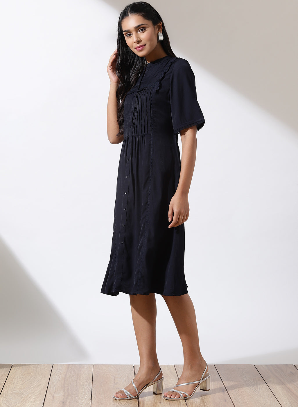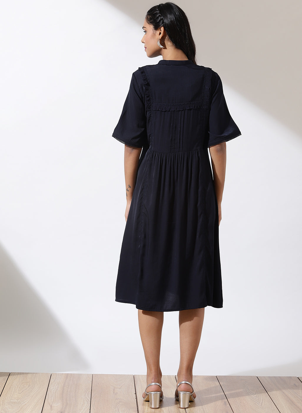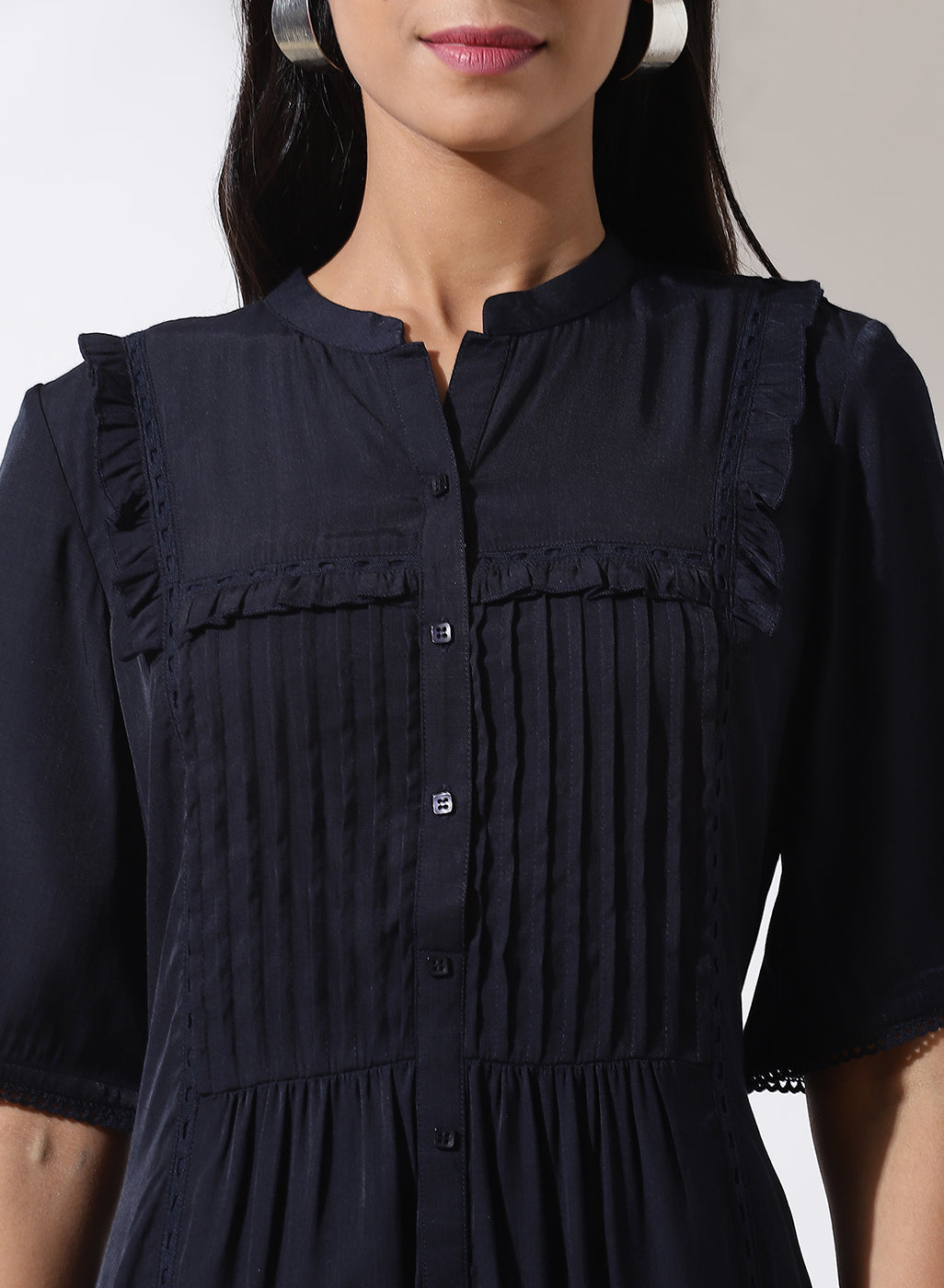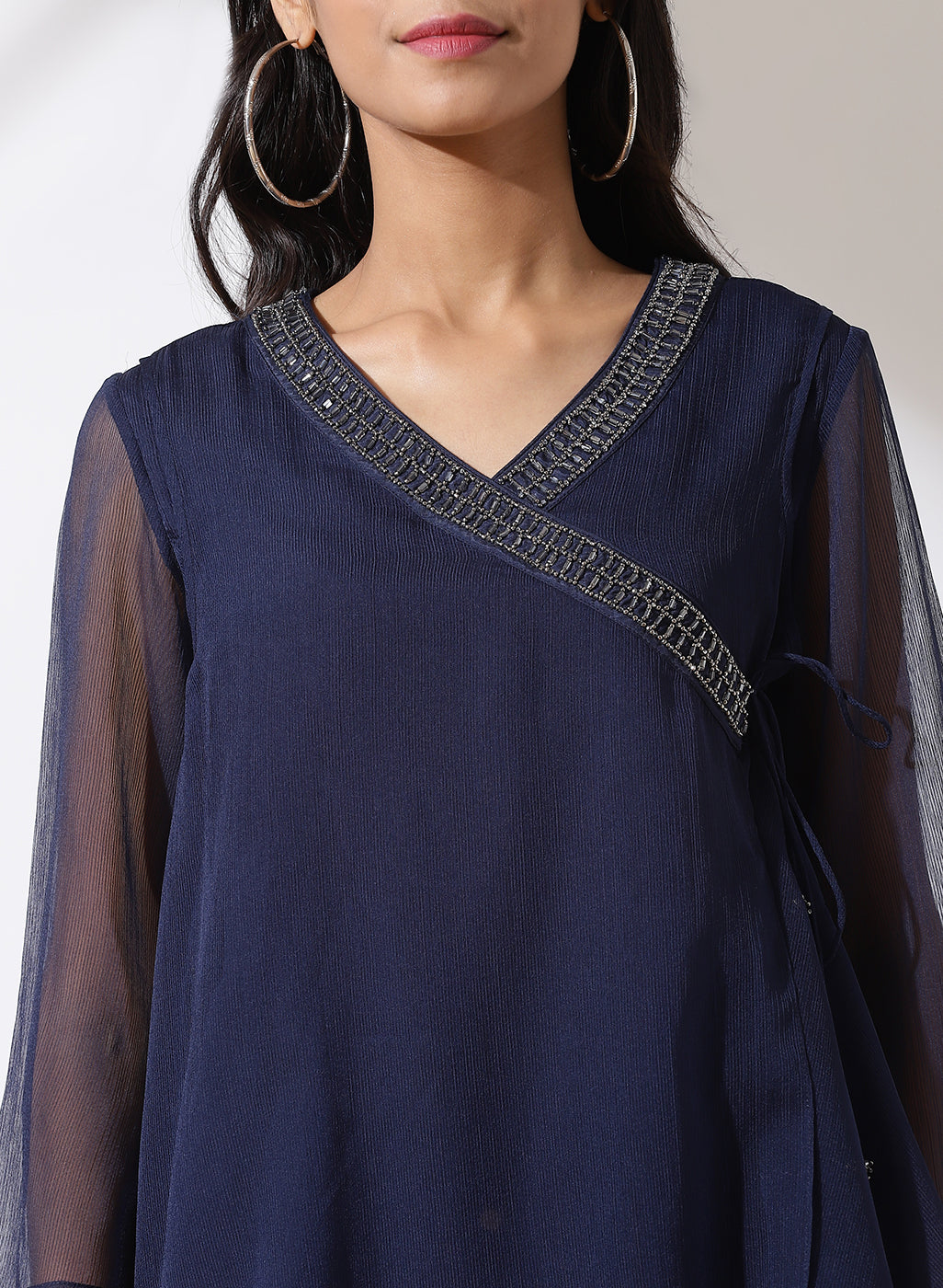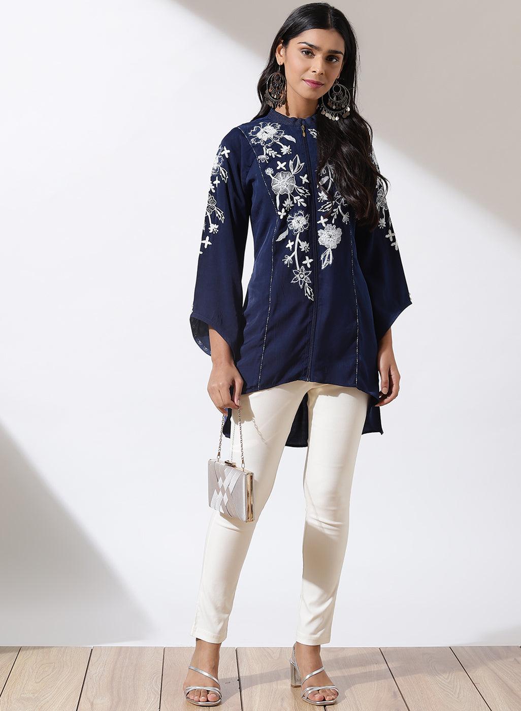 Navy Blue Embroidered Viscose Silk Slub Kurta