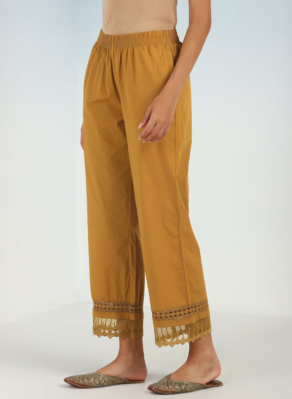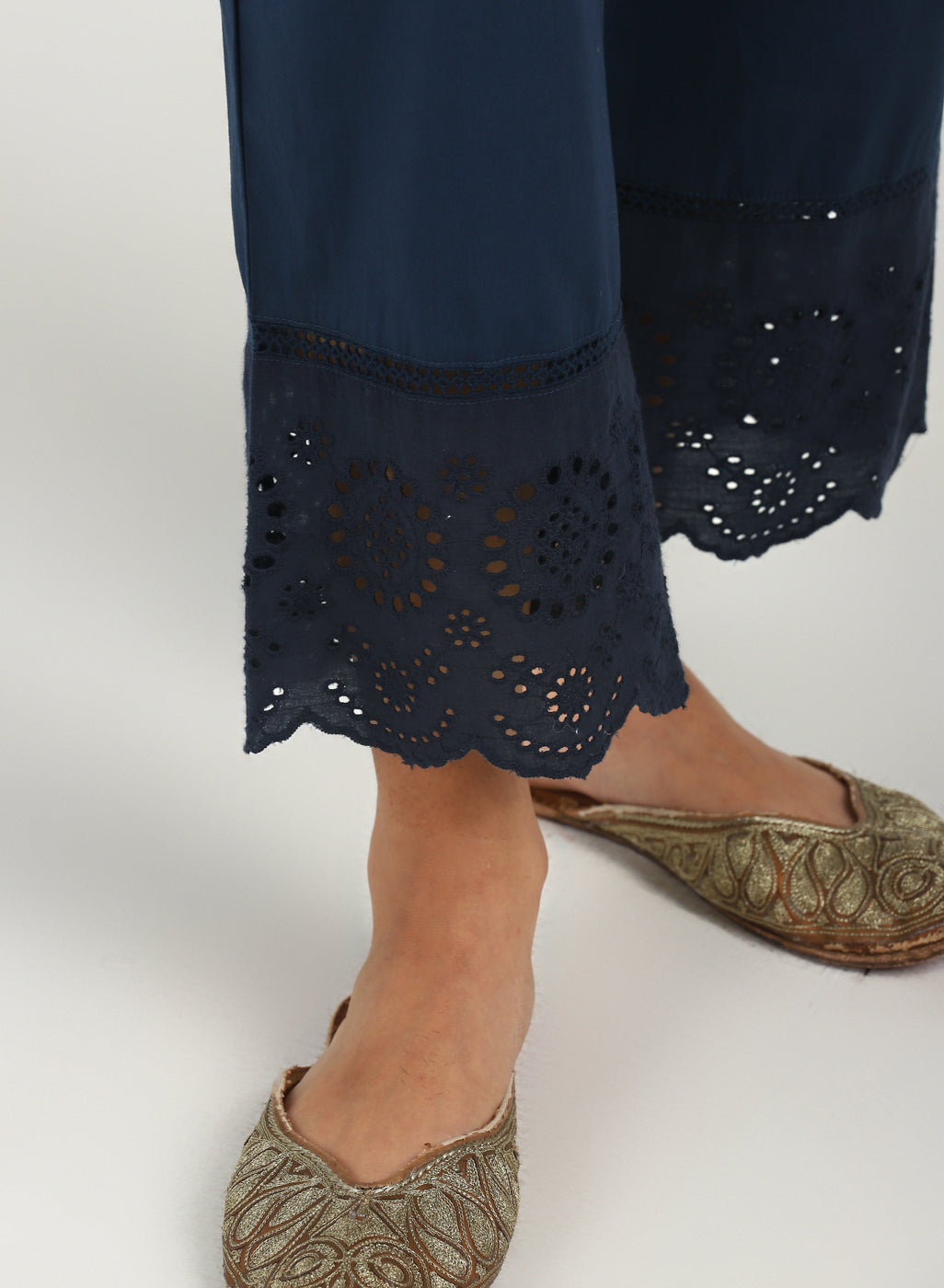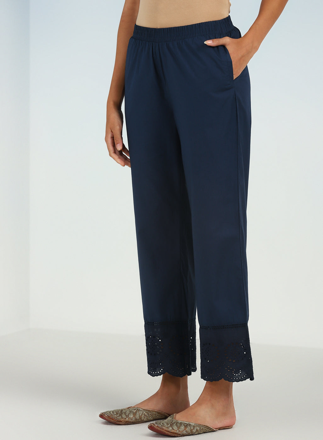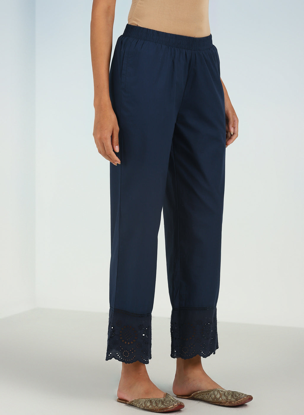 Blue Pure Cotton Ankle-length Palazzo for Women with Detailing on the Hem