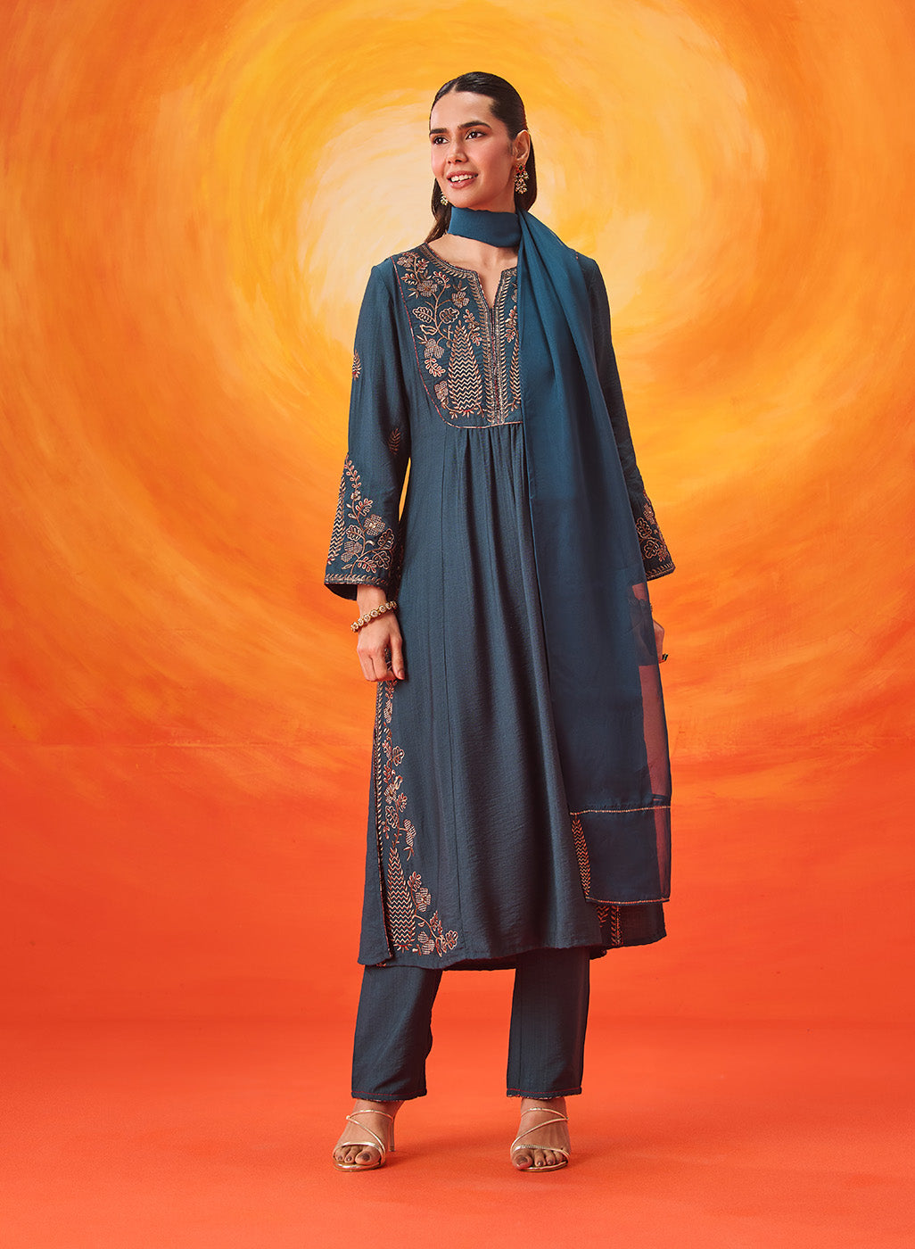 D. Teal Embroidered Nylon Viscose Kurta Set