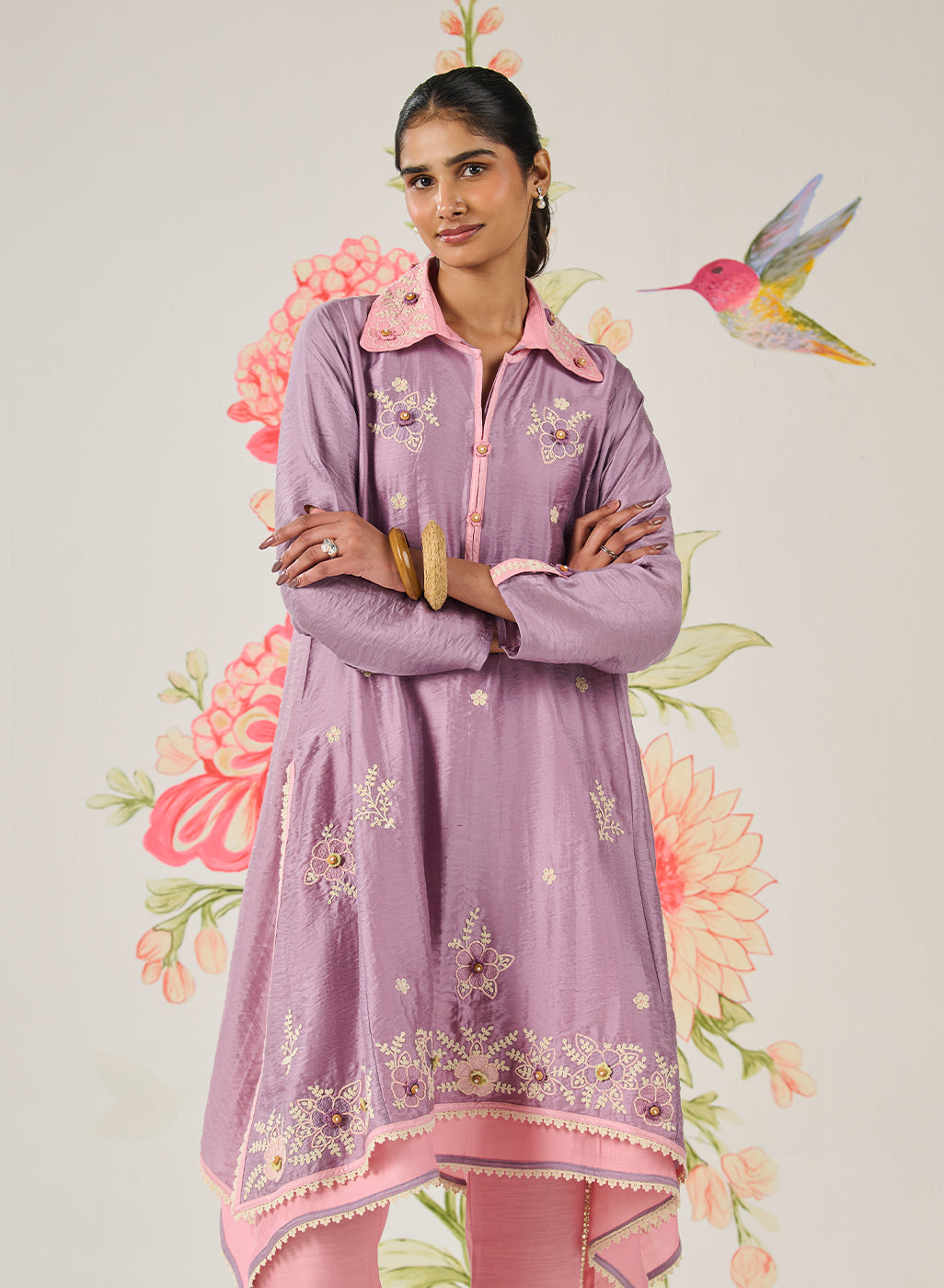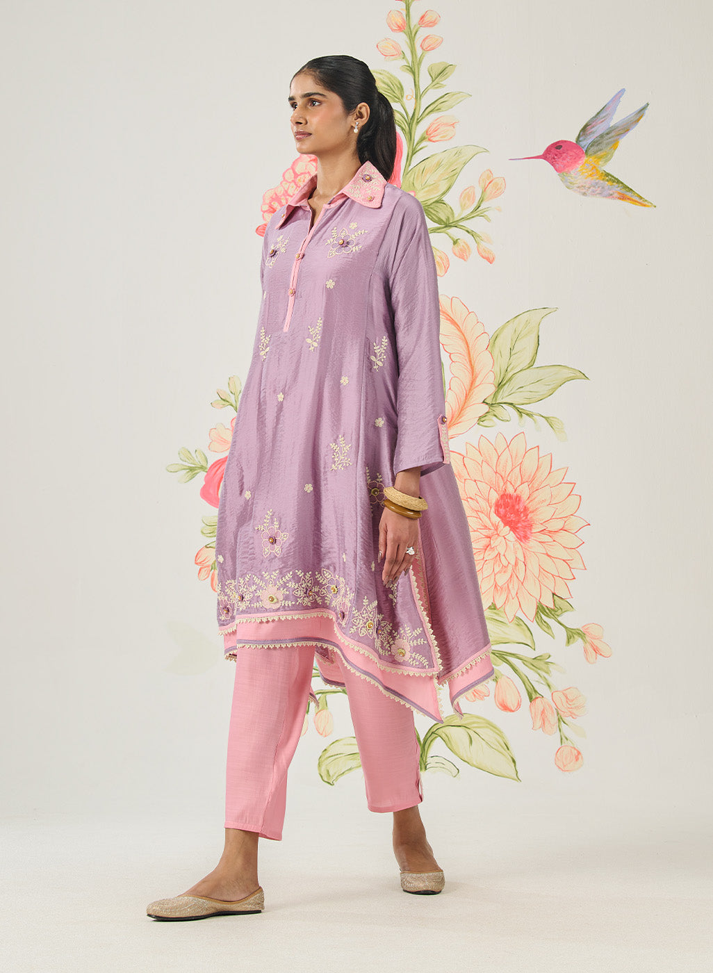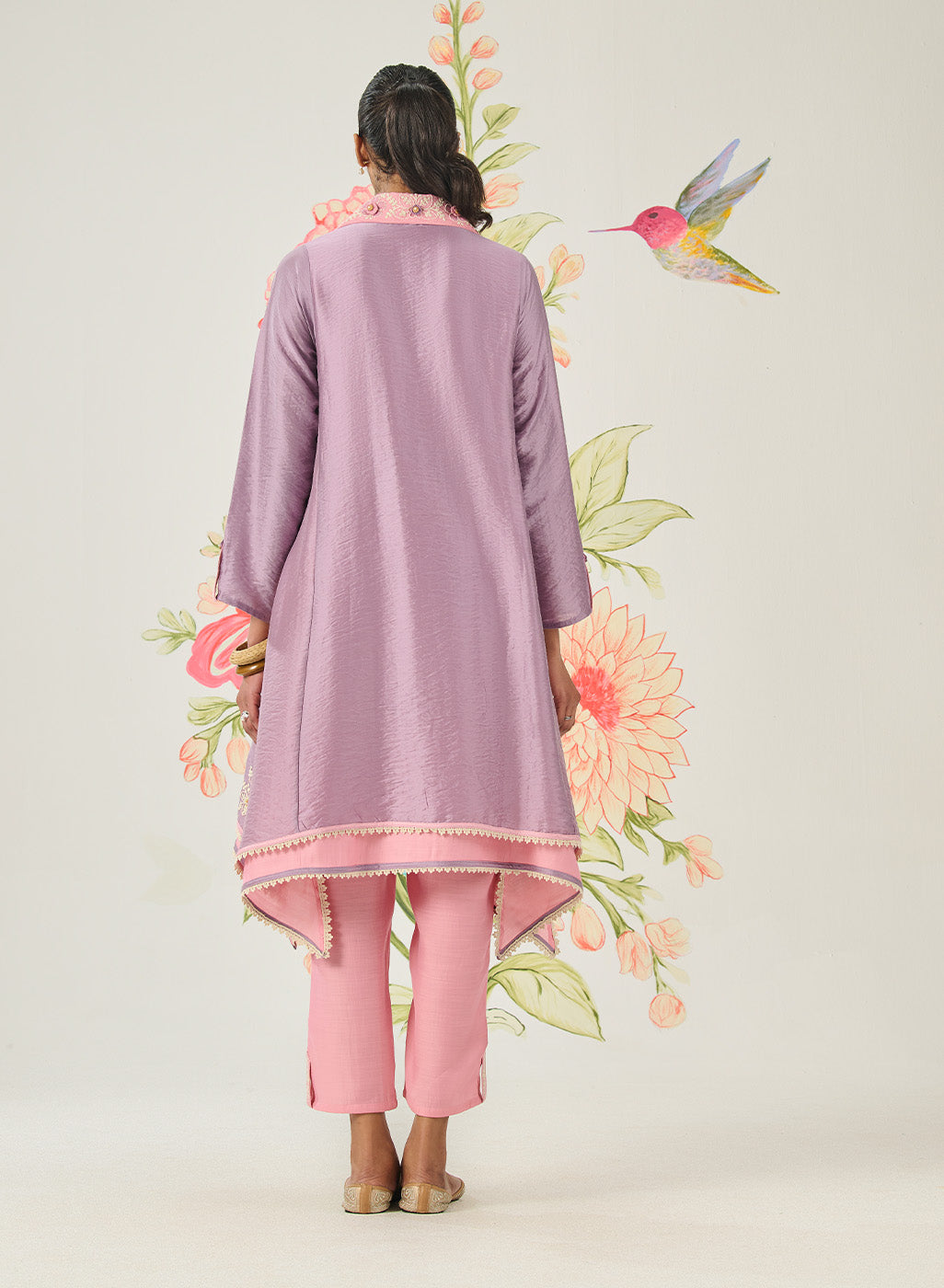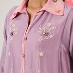 A deep tone, rich with artisanal expression, this purple kurta set feels bold yet balanced. The architectural neckline and asymmetrical hemline bring modern structure, while hand-finished embroidery and crochet florals soften the look with artisanal warmth.