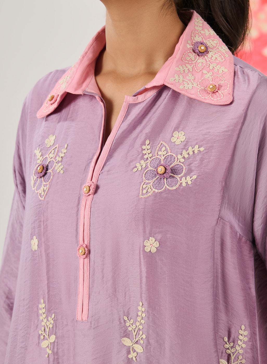 - Intricate thread embroidery with crochet flower highlights on the front, sleeves and collar.