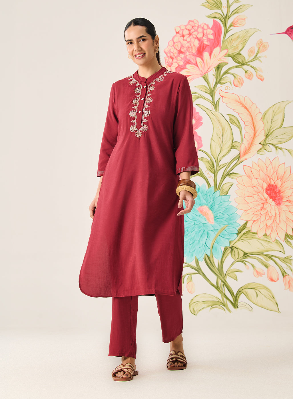 Maroon Embroidered Rayon Dobby Kurta Set