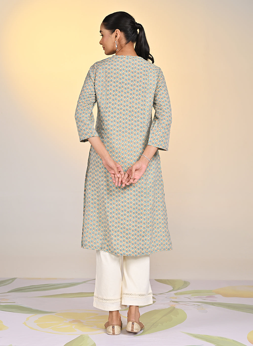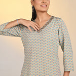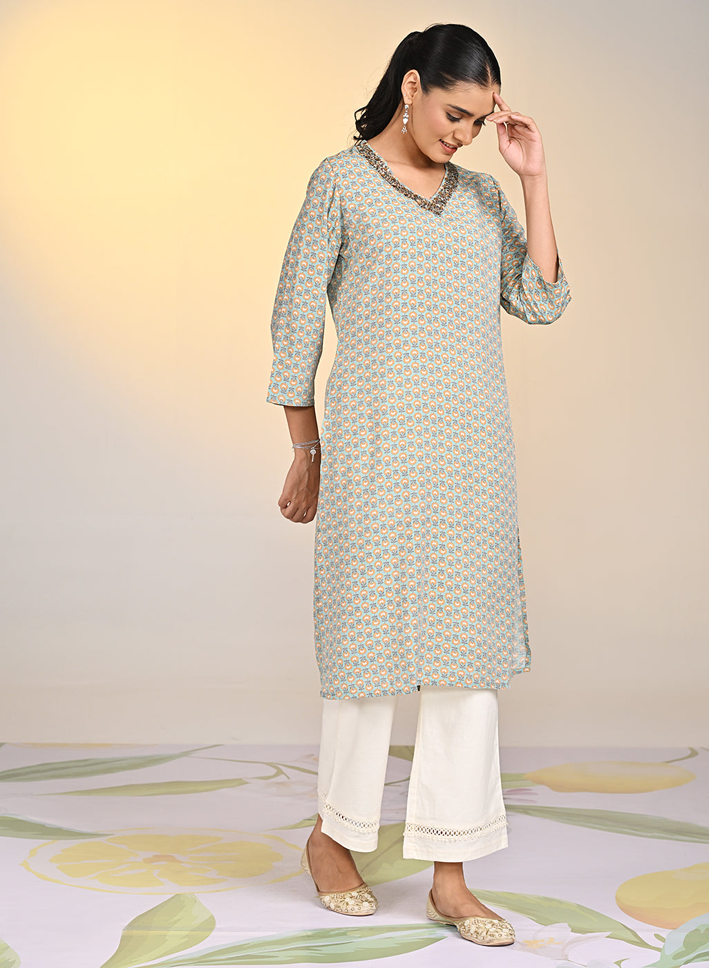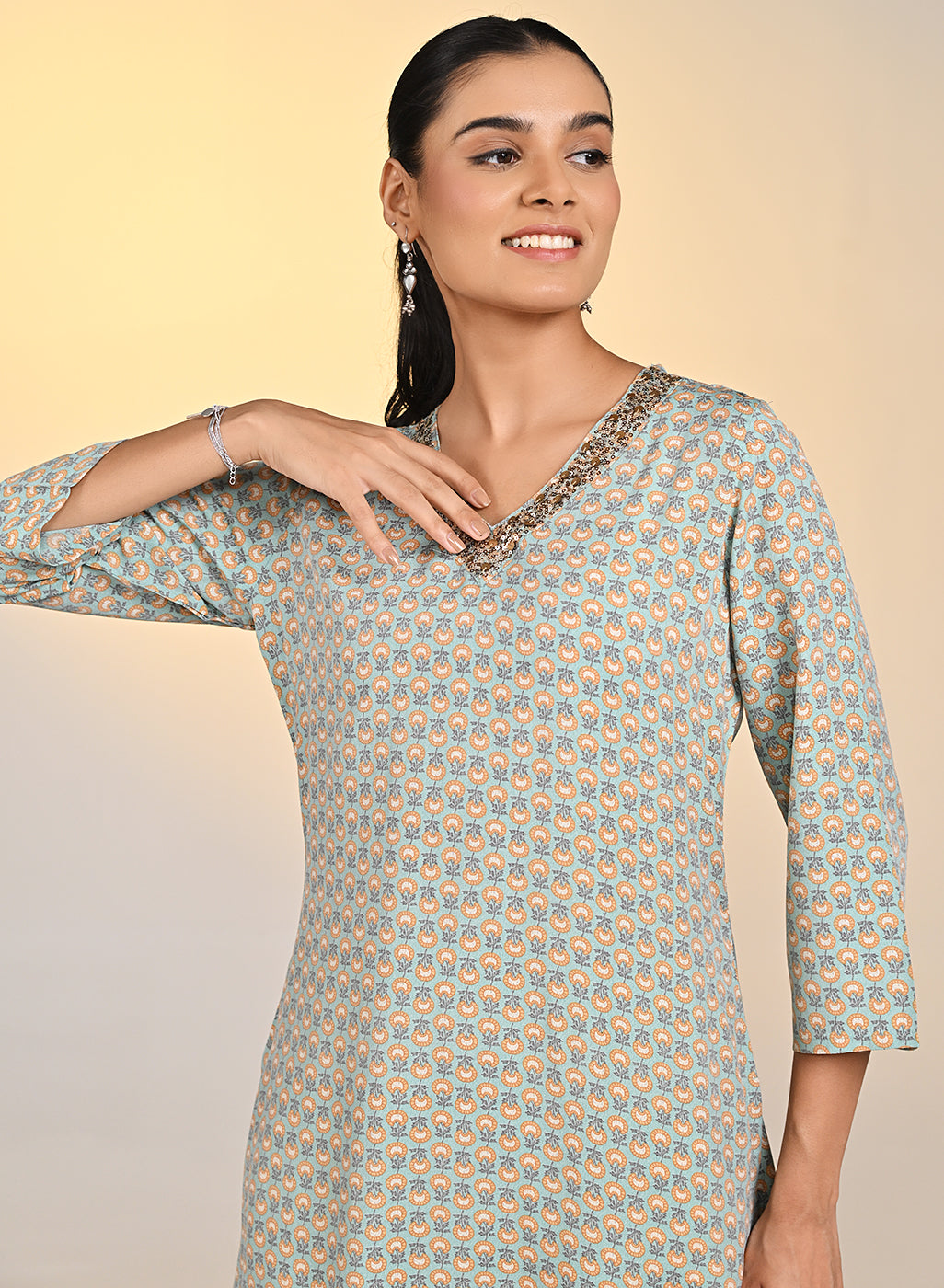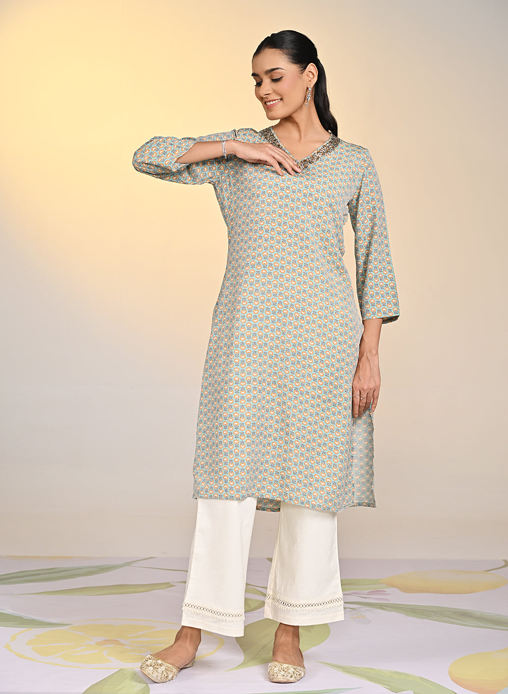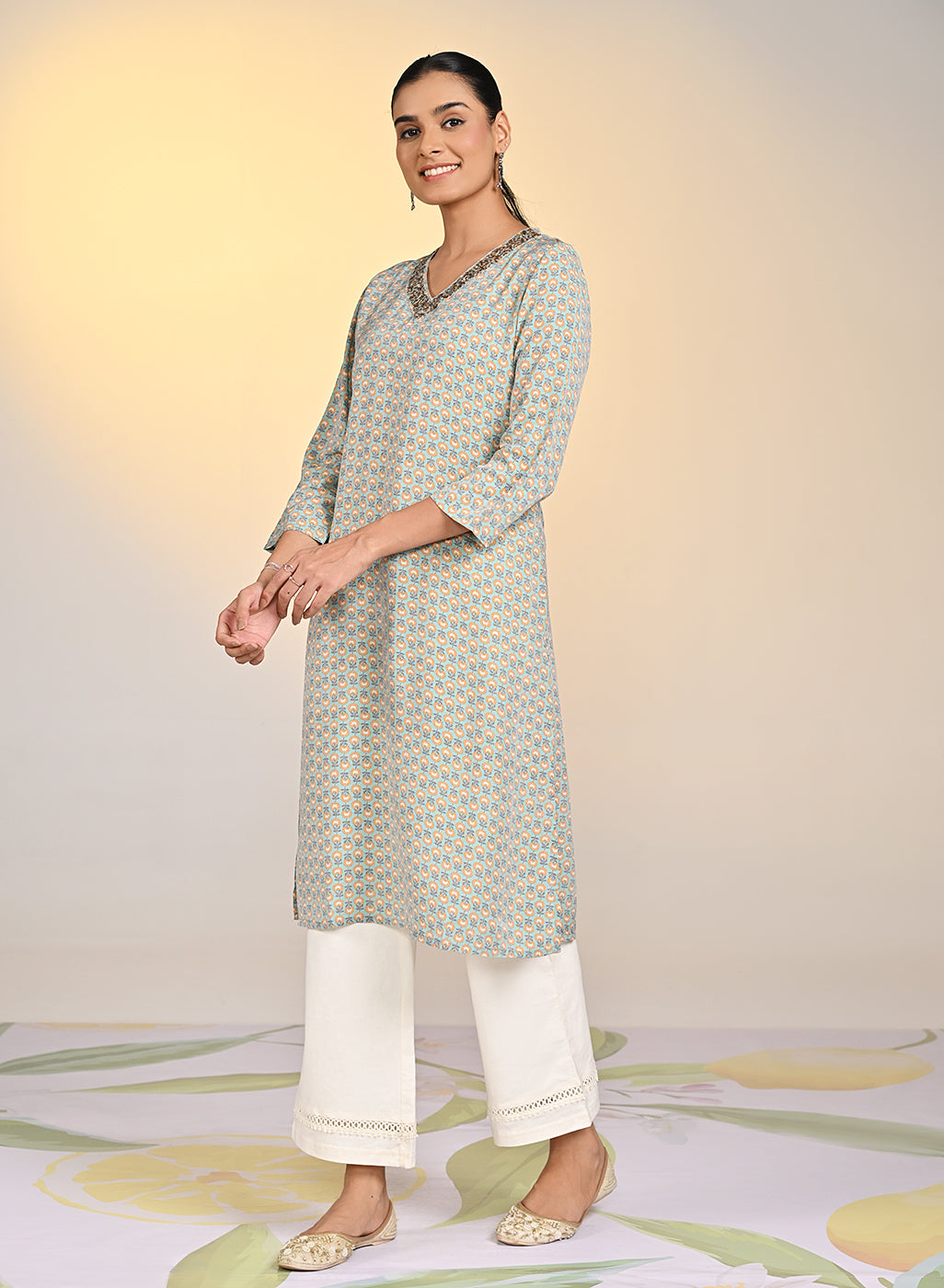 •The Nadia kurta features an enchanting all-over print that beautifully blends beautiful shades.