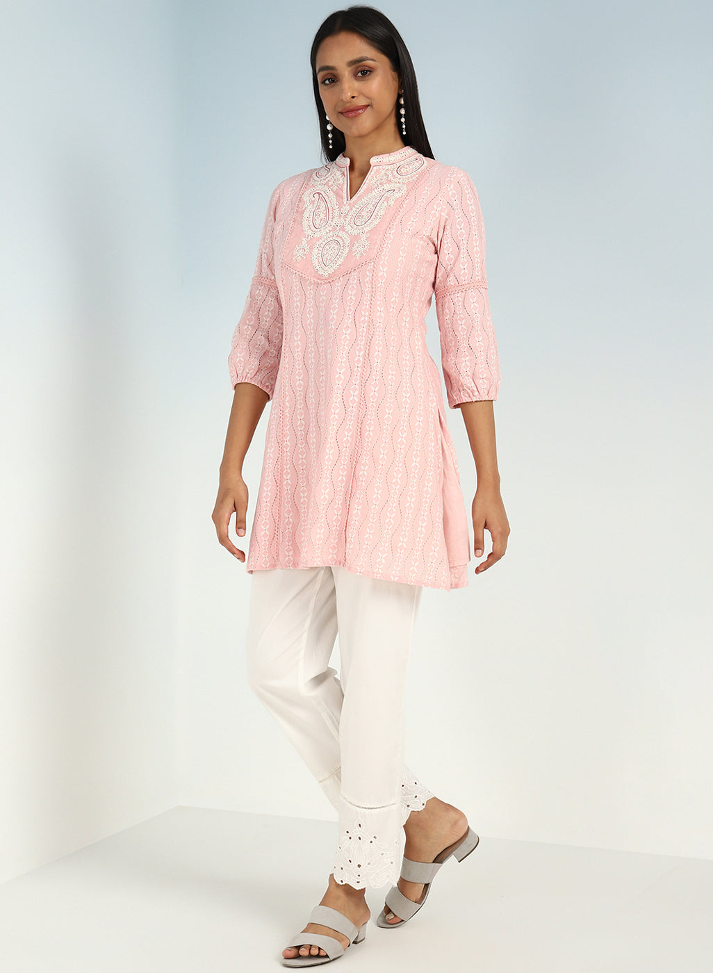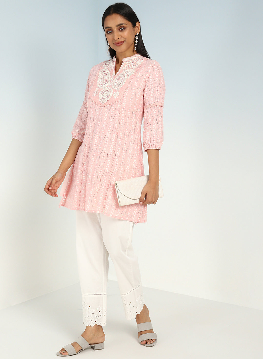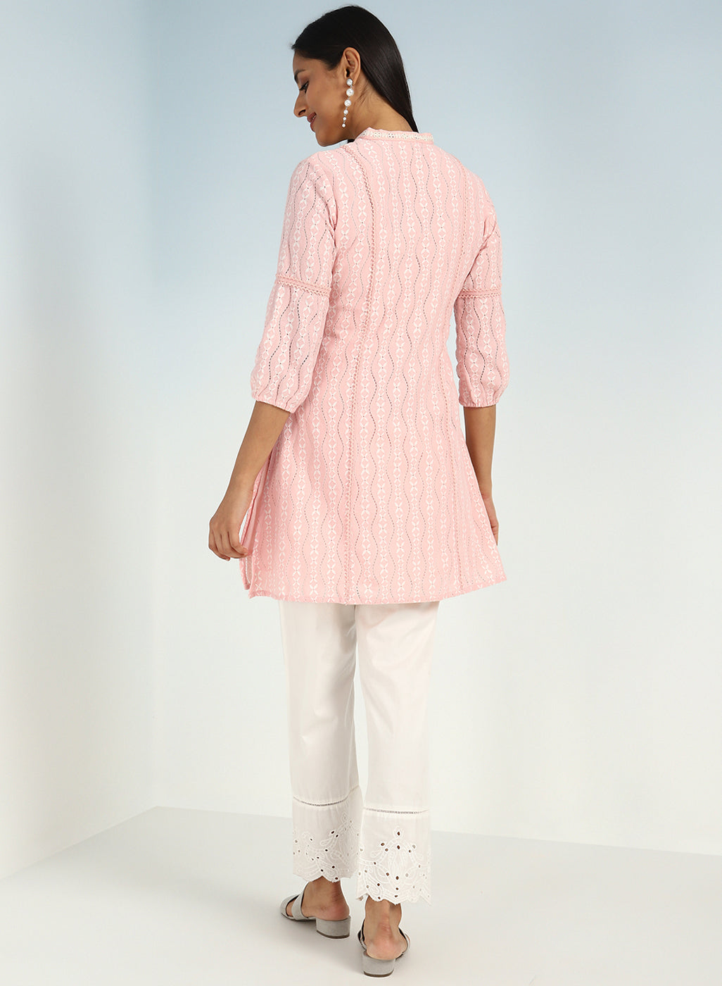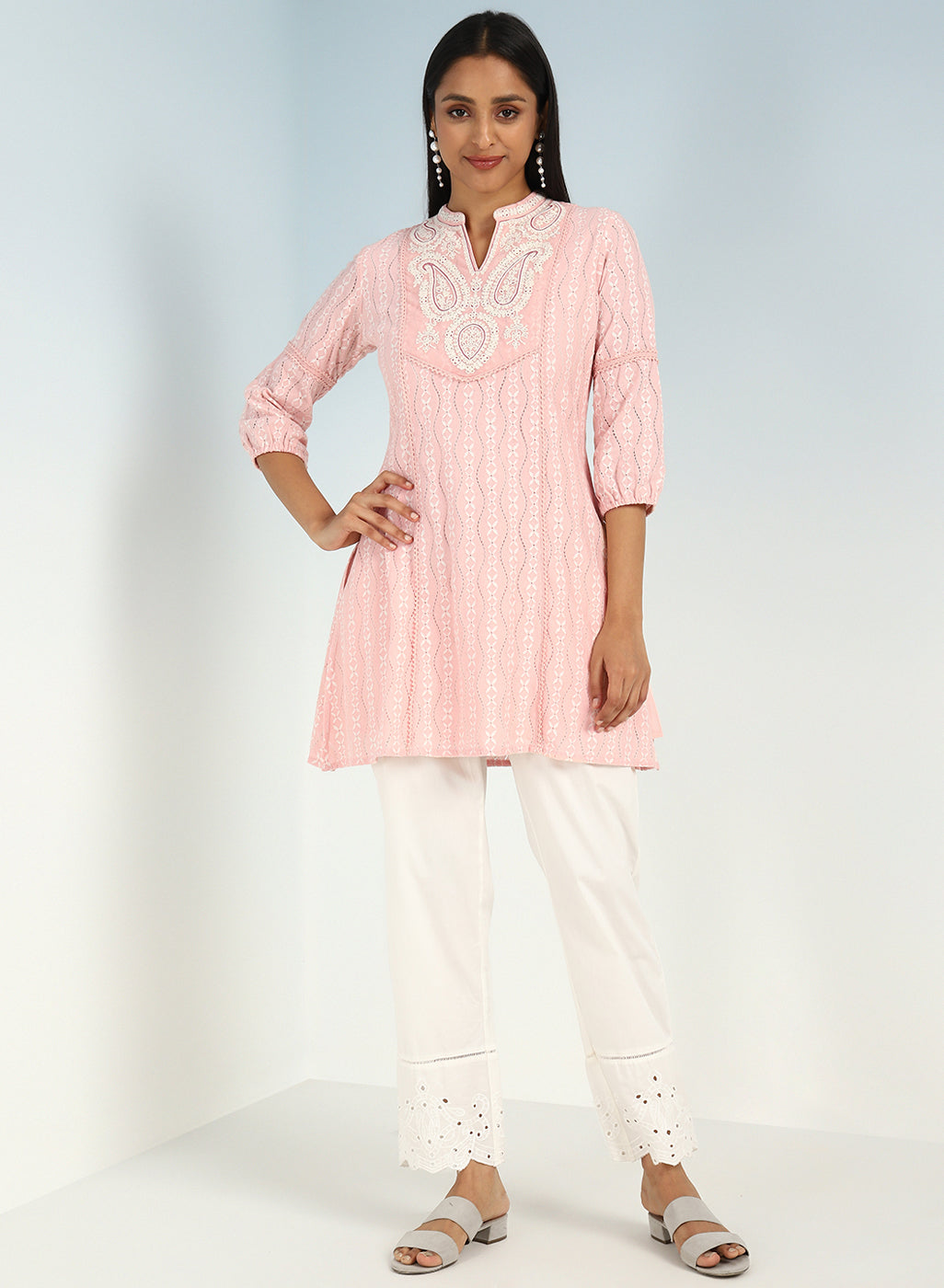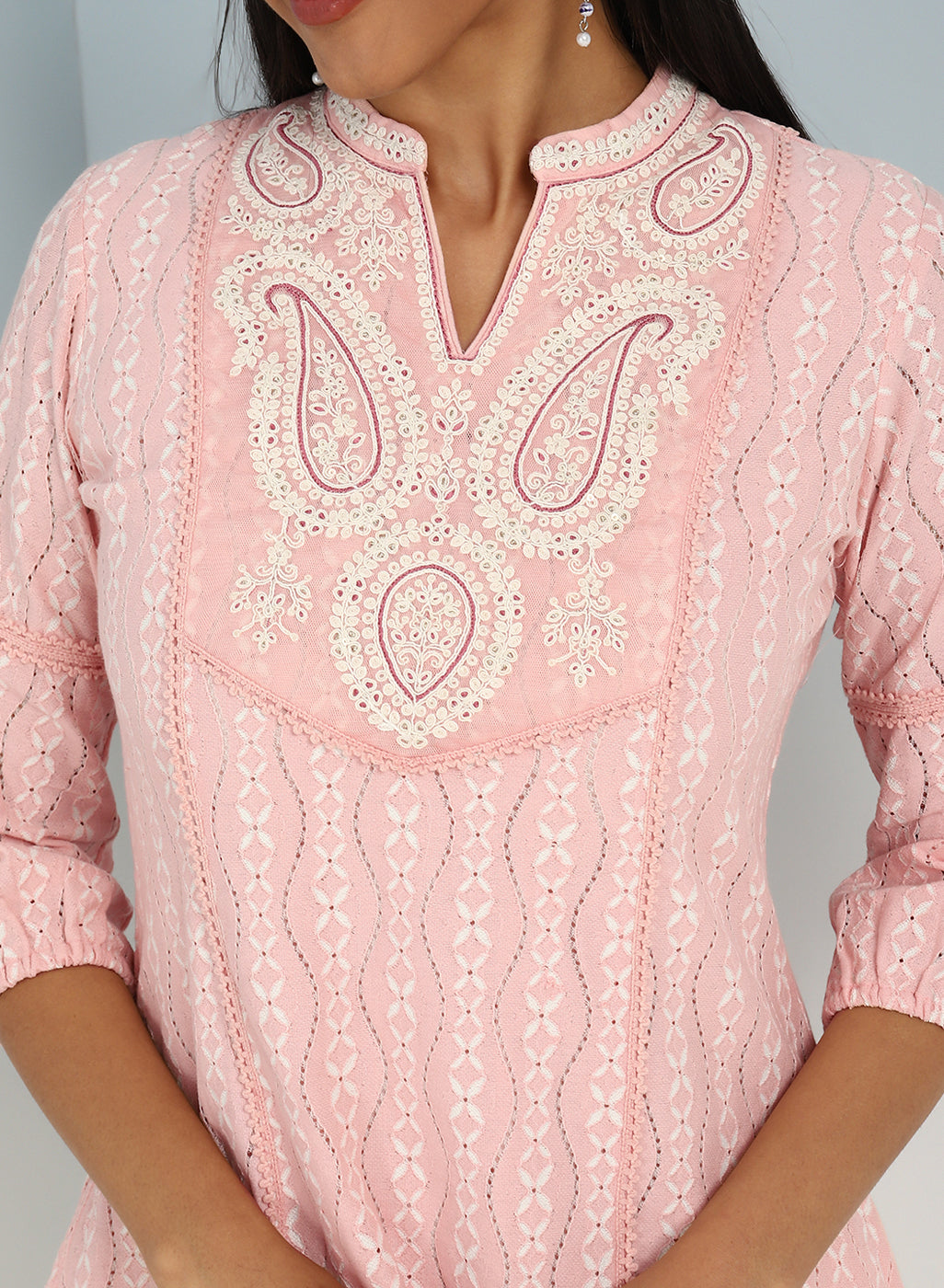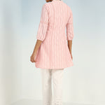 - Step into a world of ethereal beauty and artistic finesse with this Pink raschel net embroidered kurti.