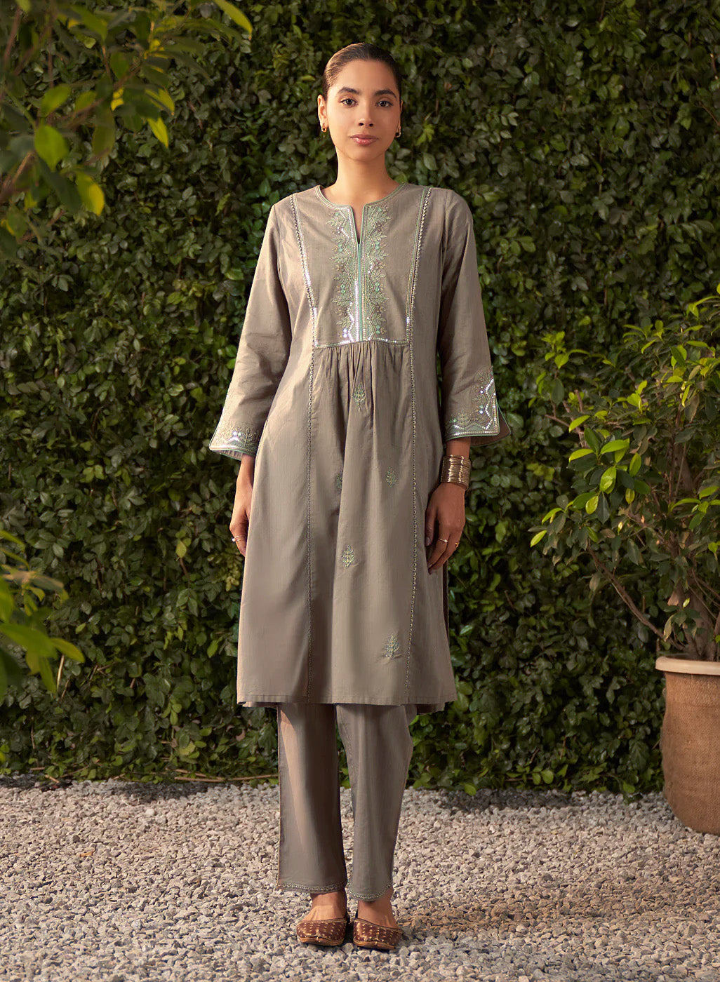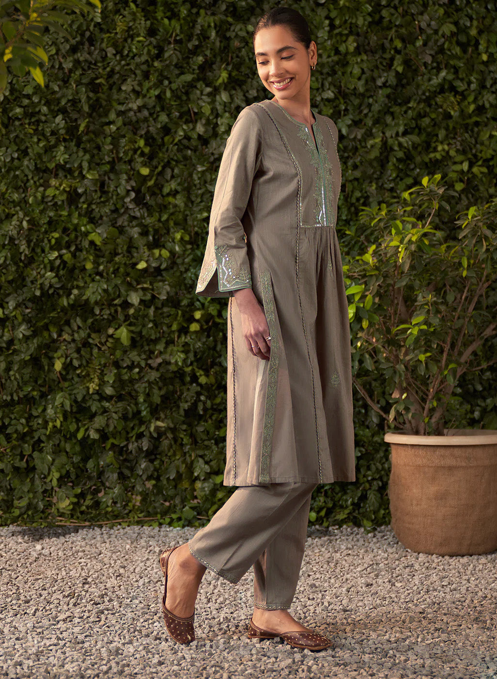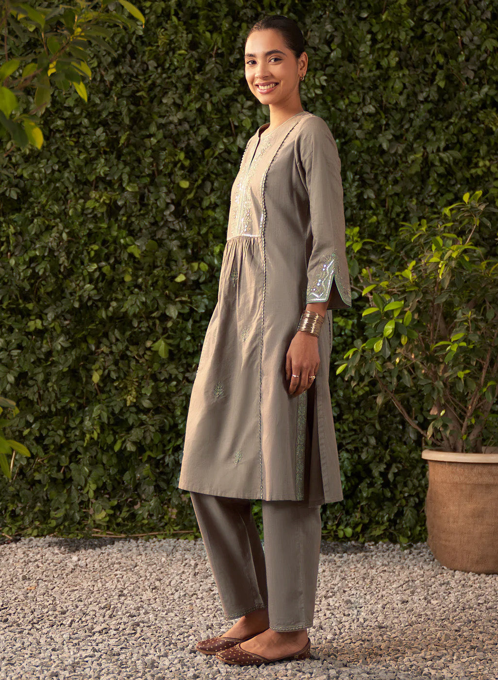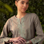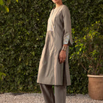 This grey kurta set in a soft, breathable fabric brings a modern twist to traditional design. The A-line kurta features intricate zari work with mirror embroidery and subtle sequin highlights. Mughal floral-inspired motifs flow seamlessly across the fabric.