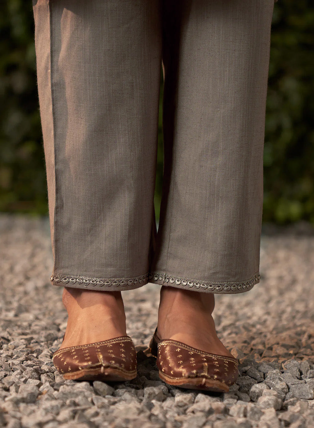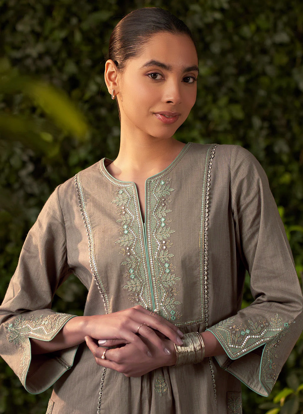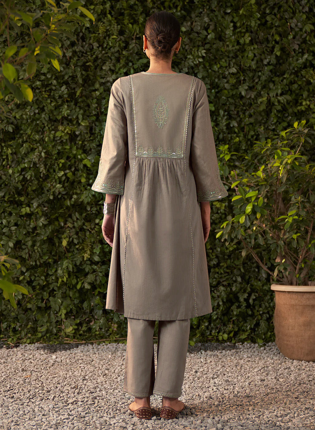 This grey kurta set in a soft, breathable fabric brings a modern twist to traditional design. The A-line kurta features intricate zari work with mirror embroidery and subtle sequin highlights. Mughal floral-inspired motifs flow seamlessly across the fabric.