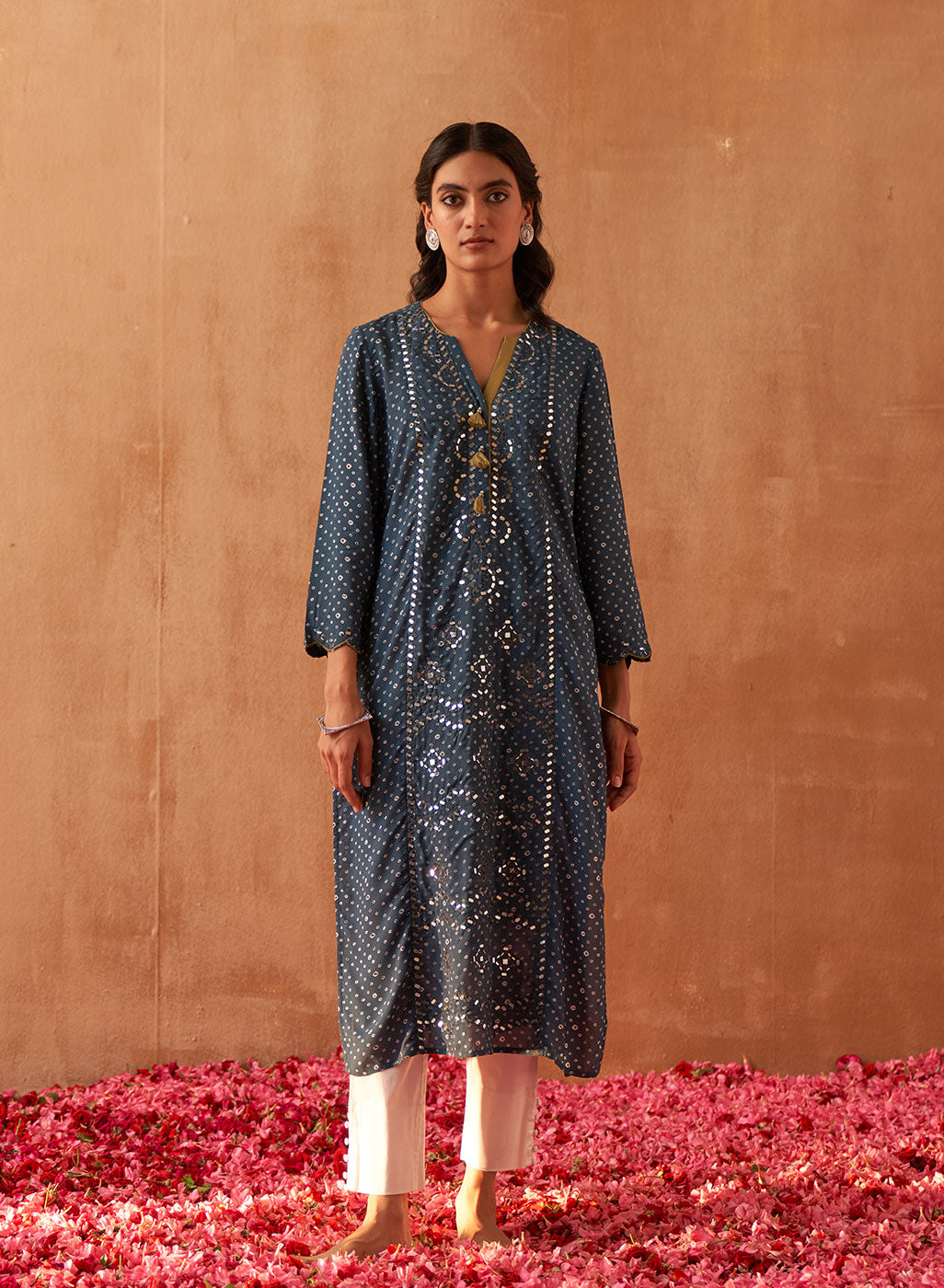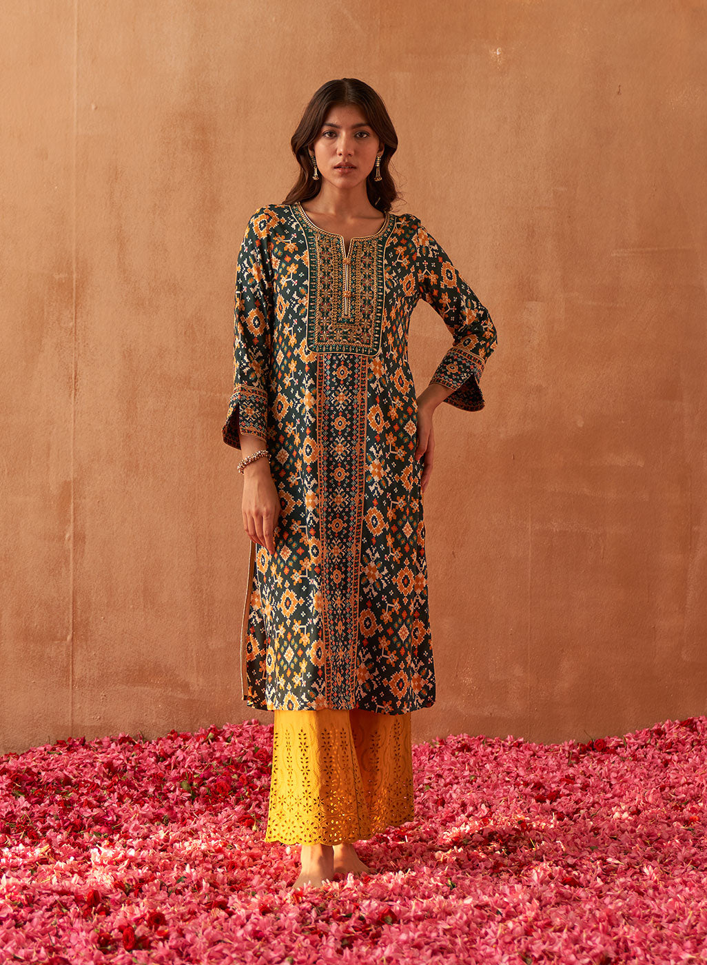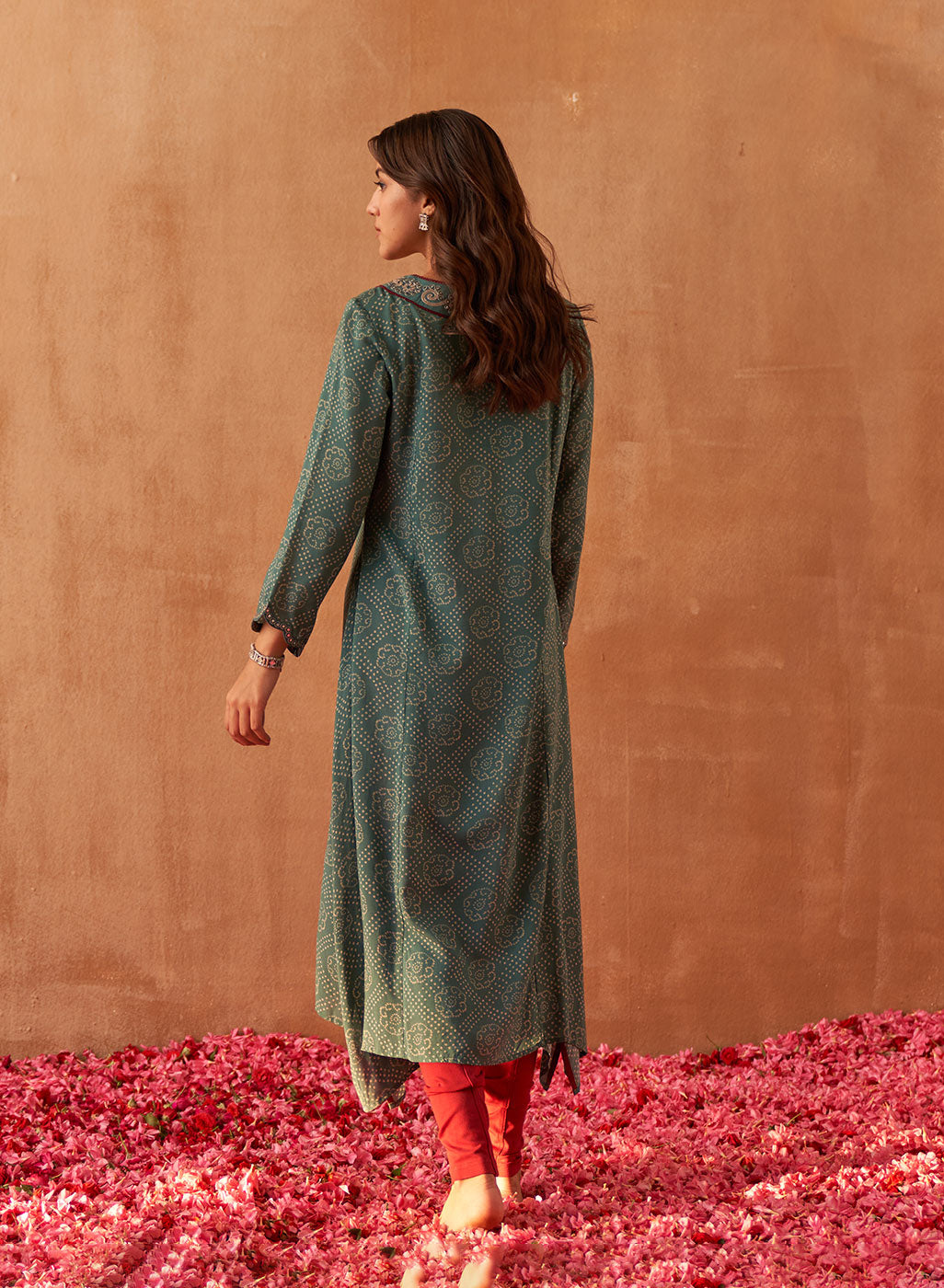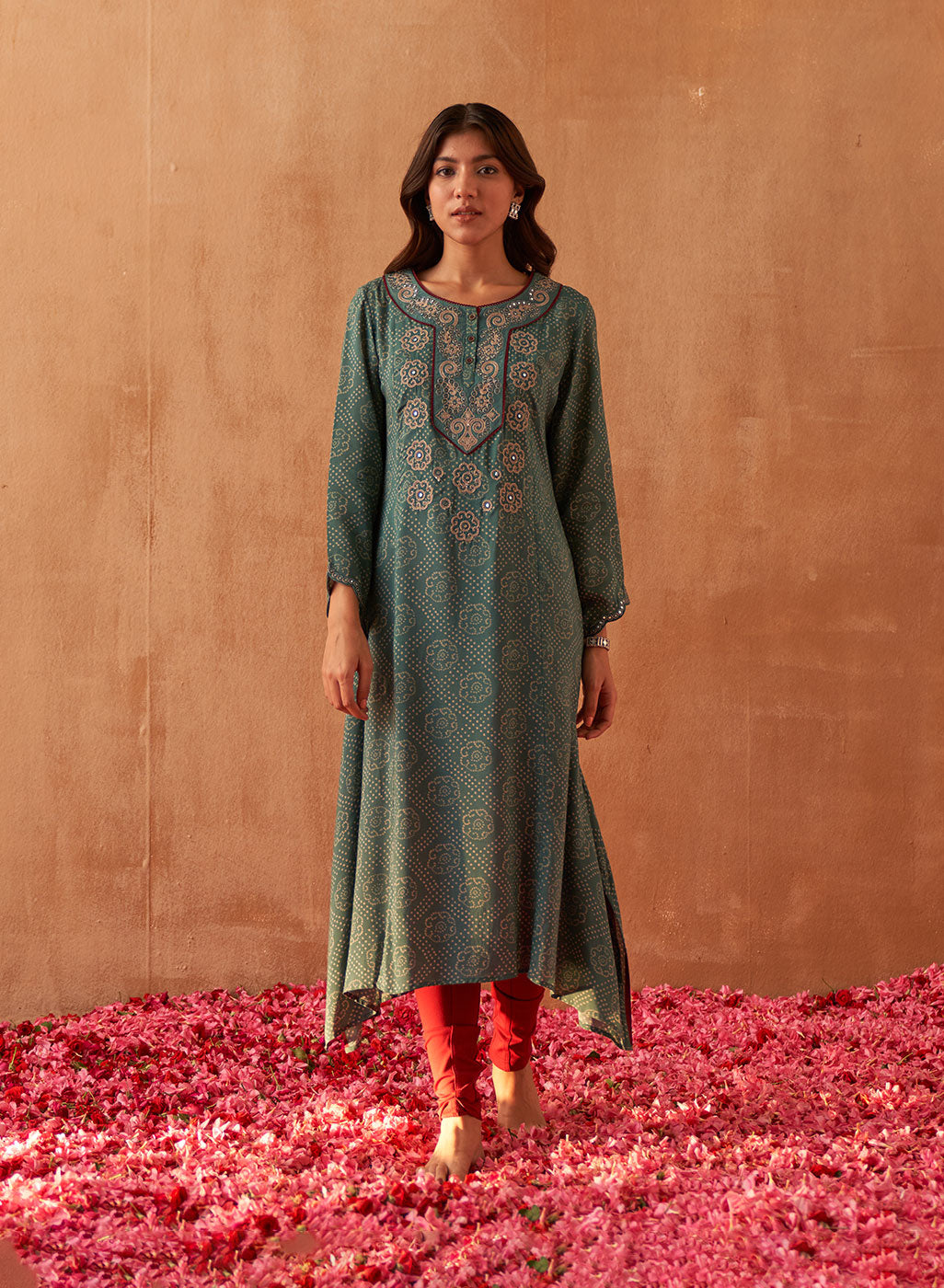 Teal Floral Print Dhaage Collection Kurta With Embroidery