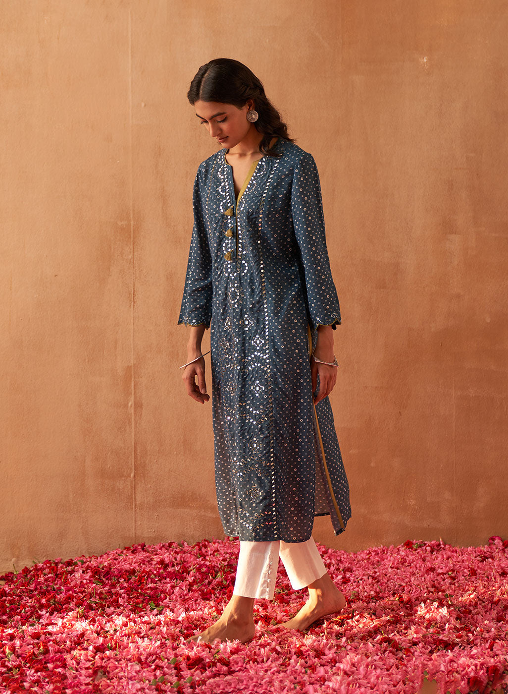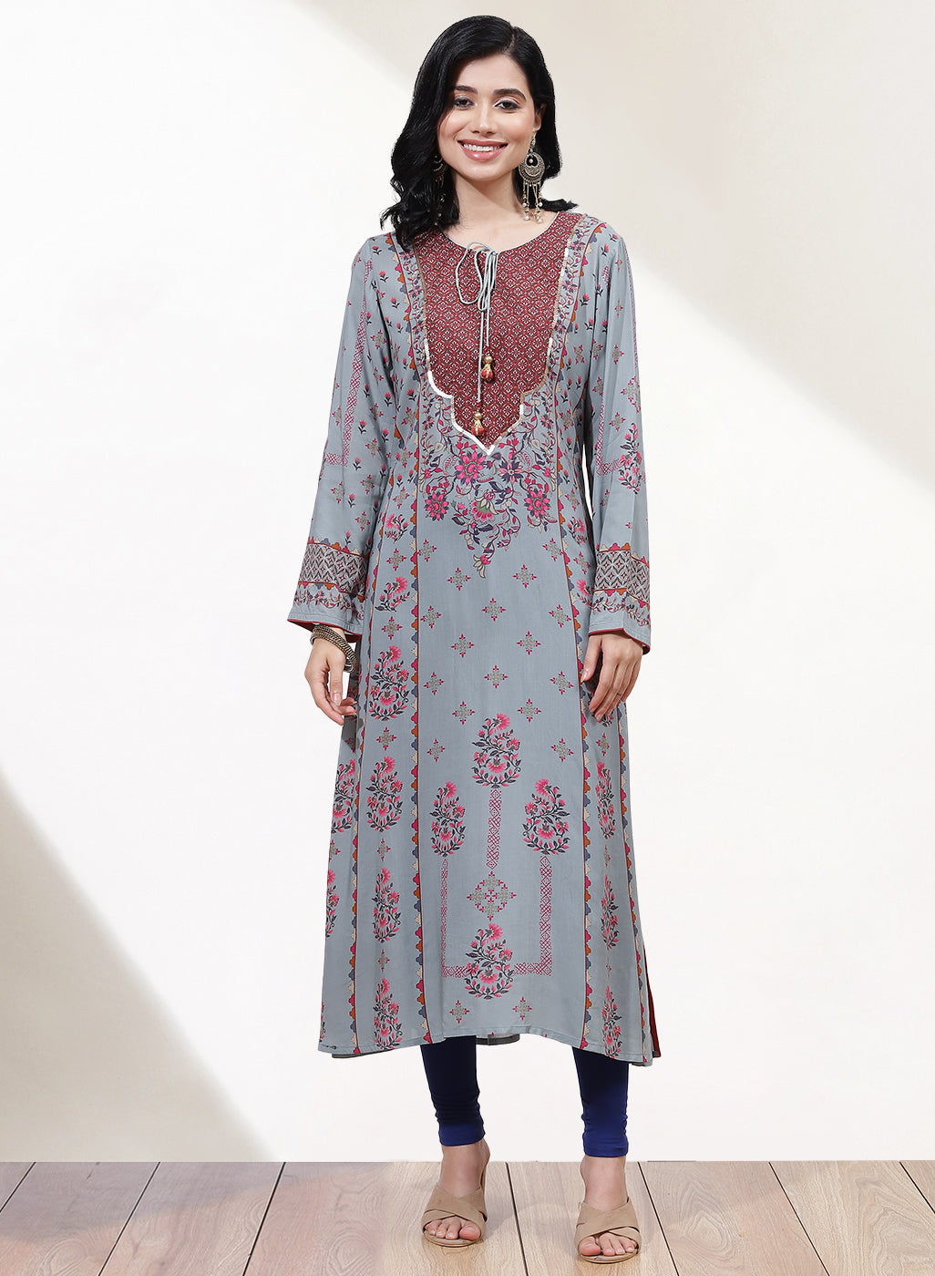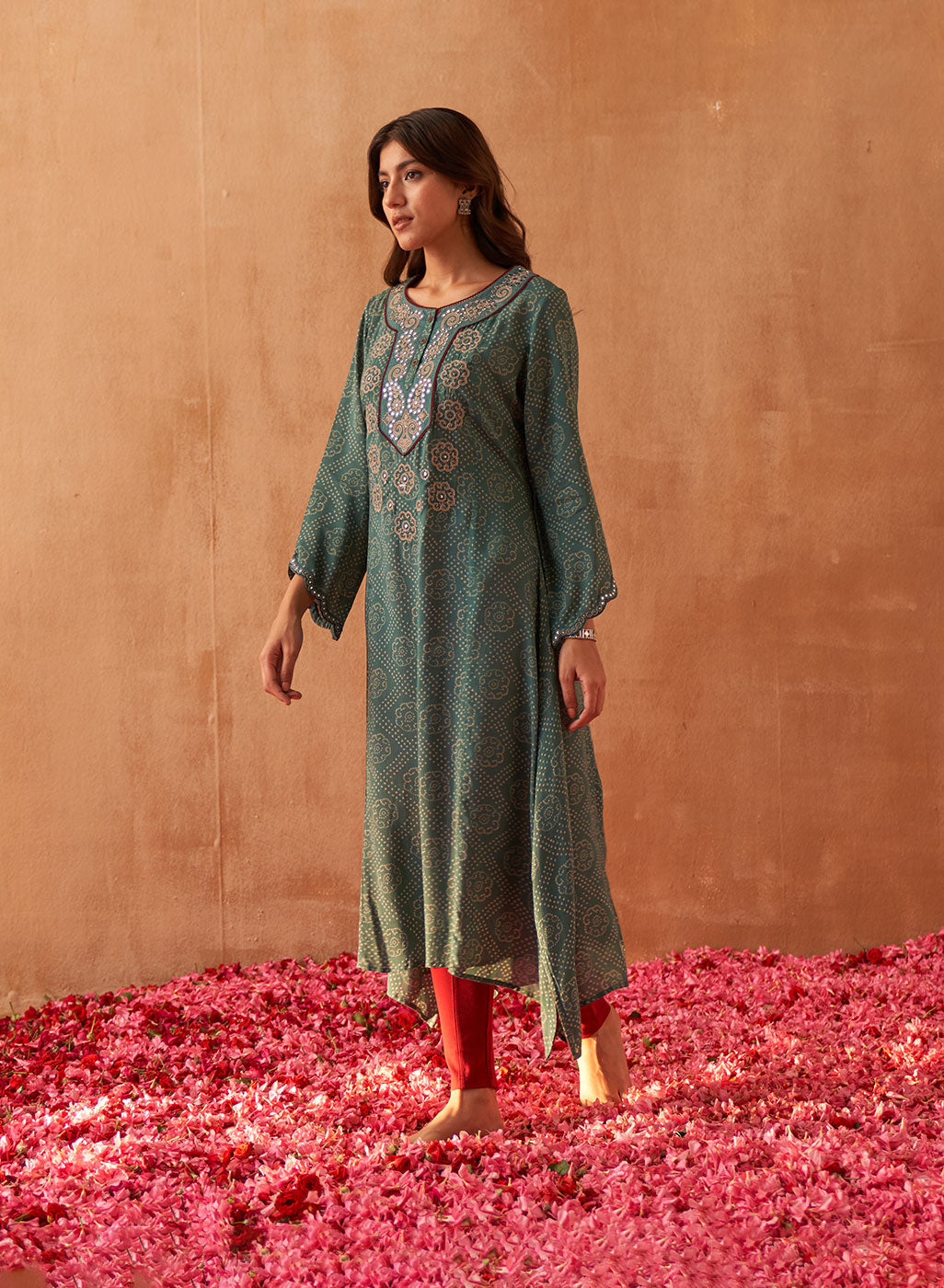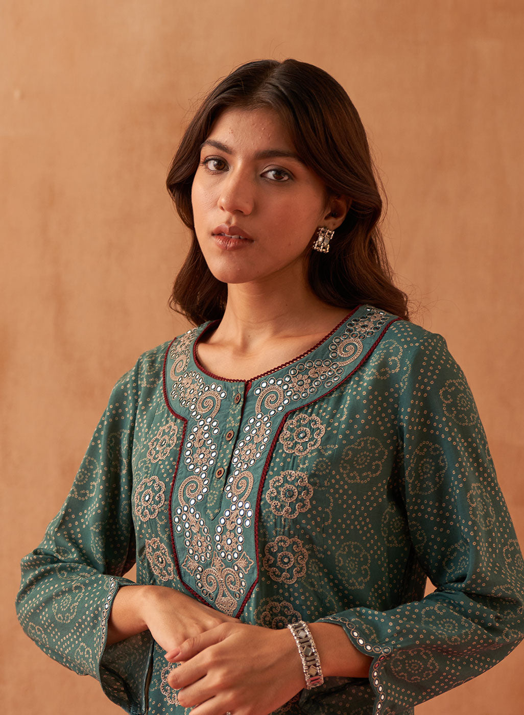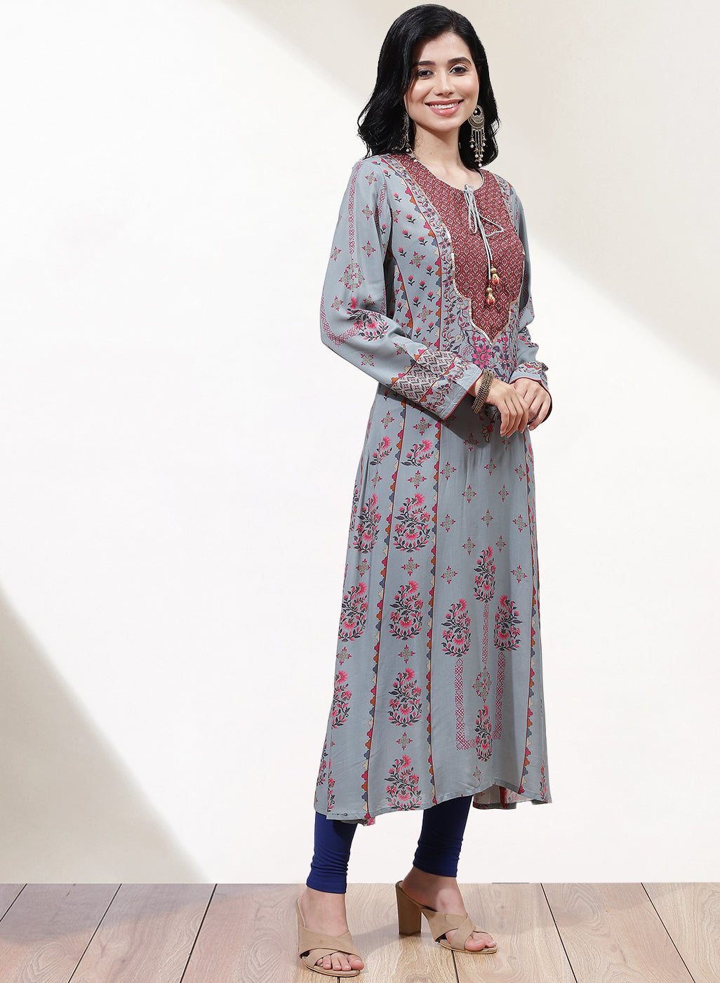 Teal Floral Print Dhaage Collection Kurta With Embroidery