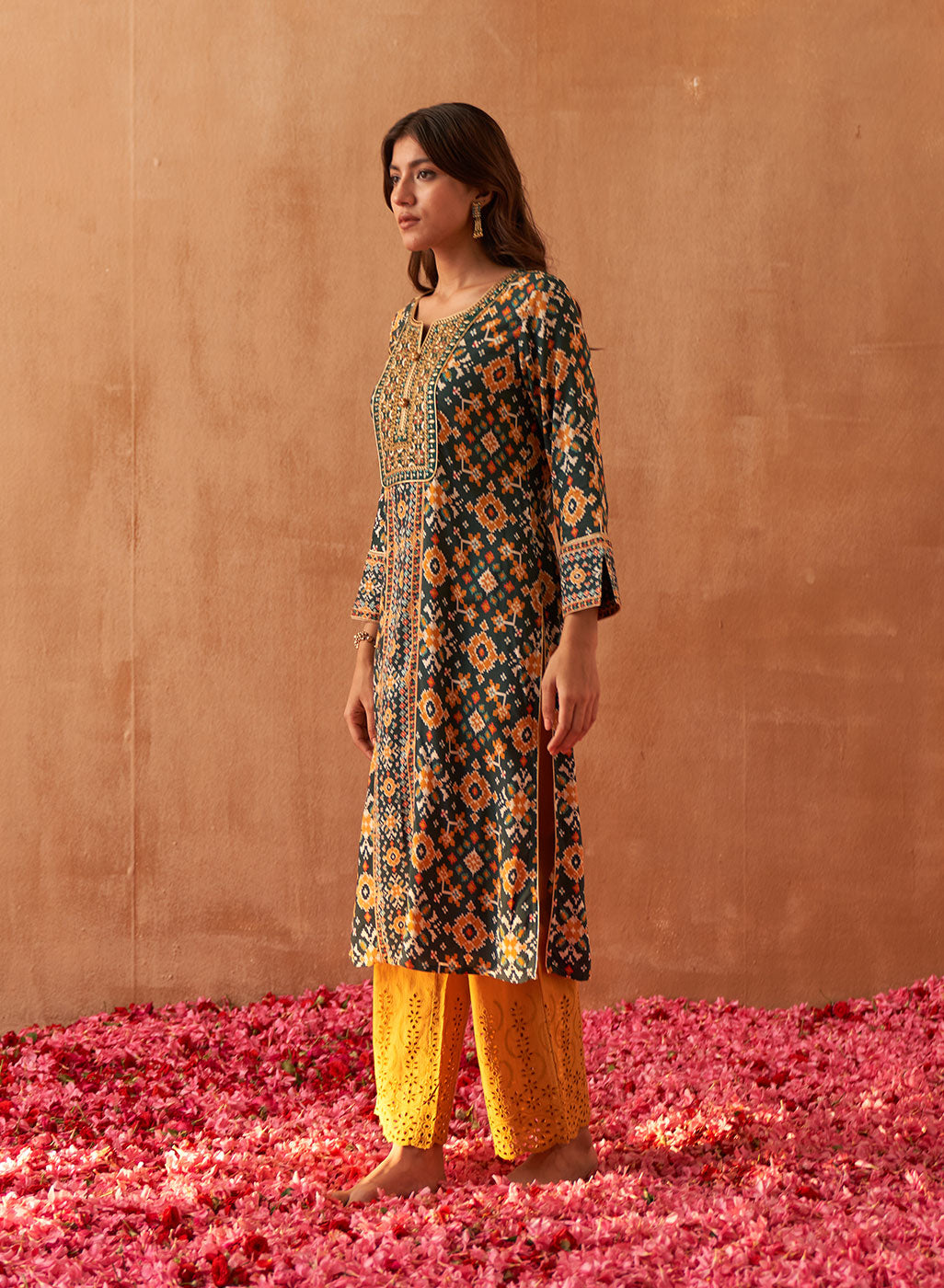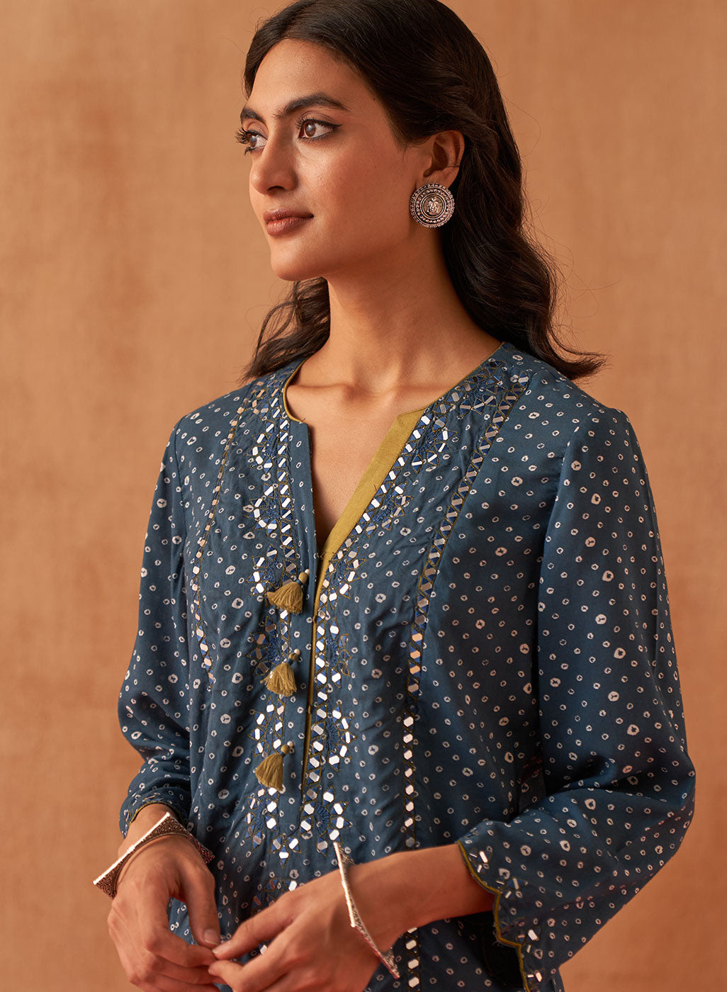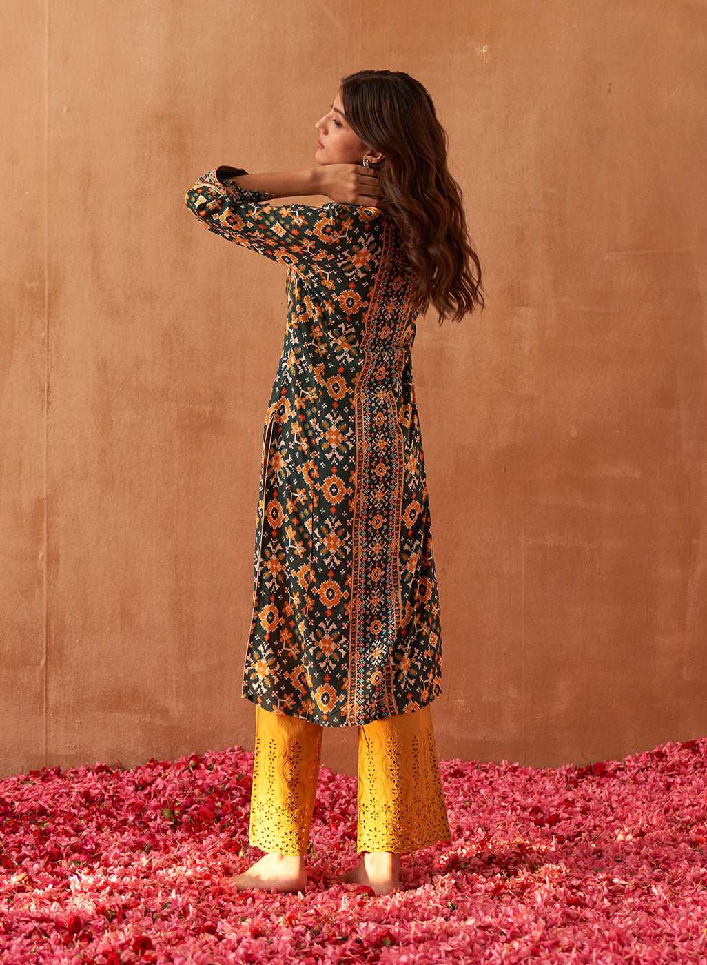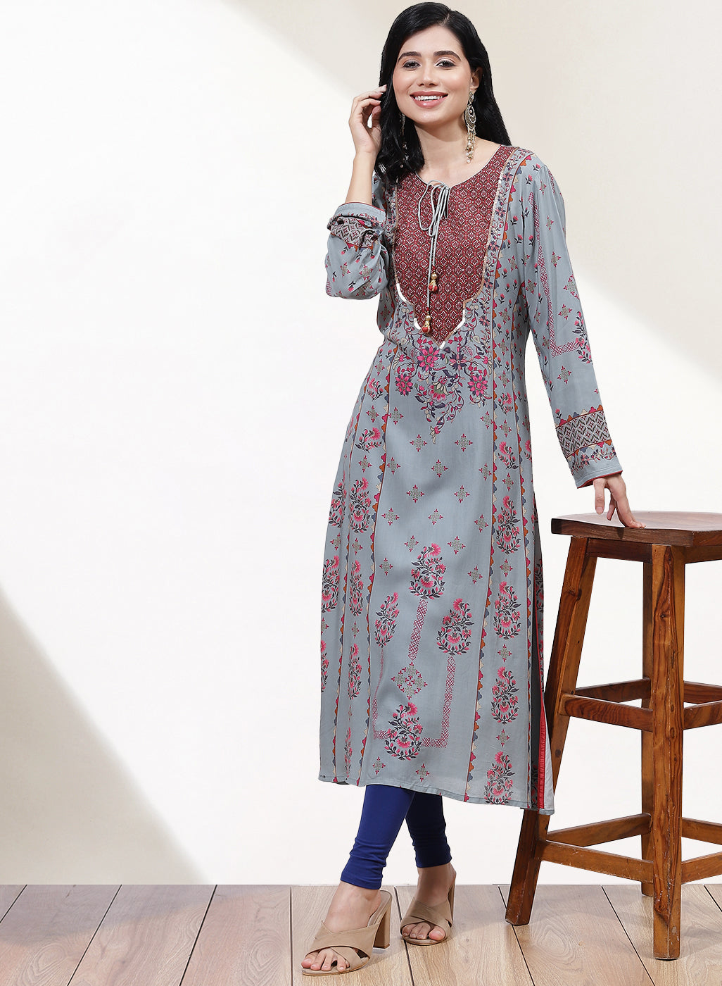 Teal Floral Print Dhaage Collection Kurta With Embroidery
