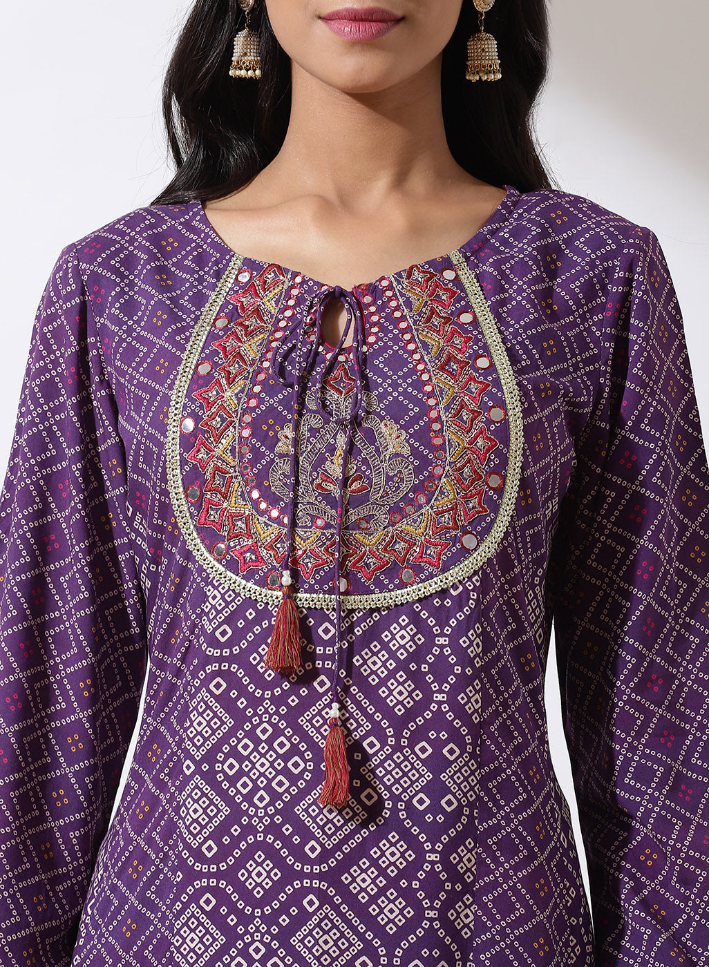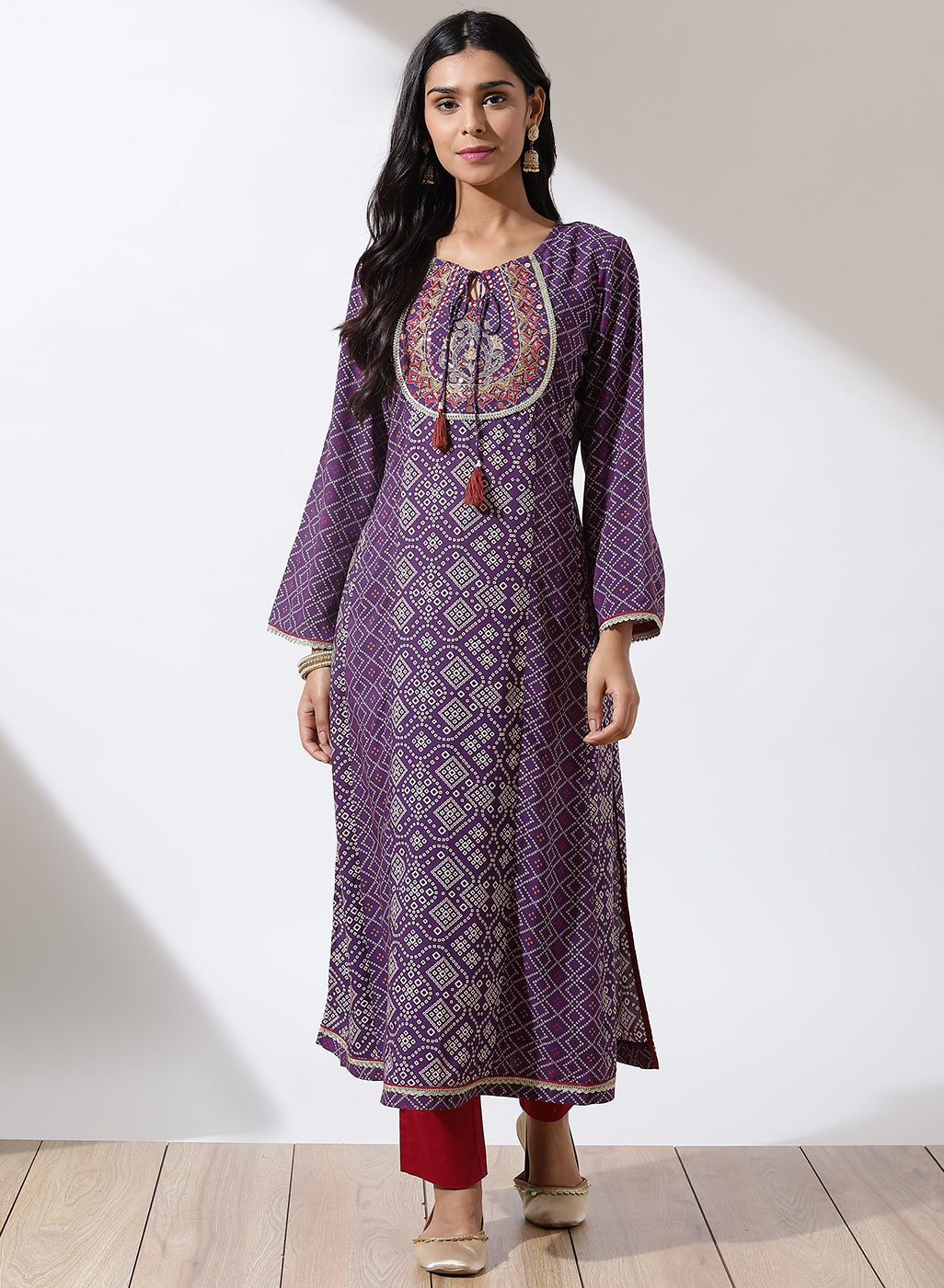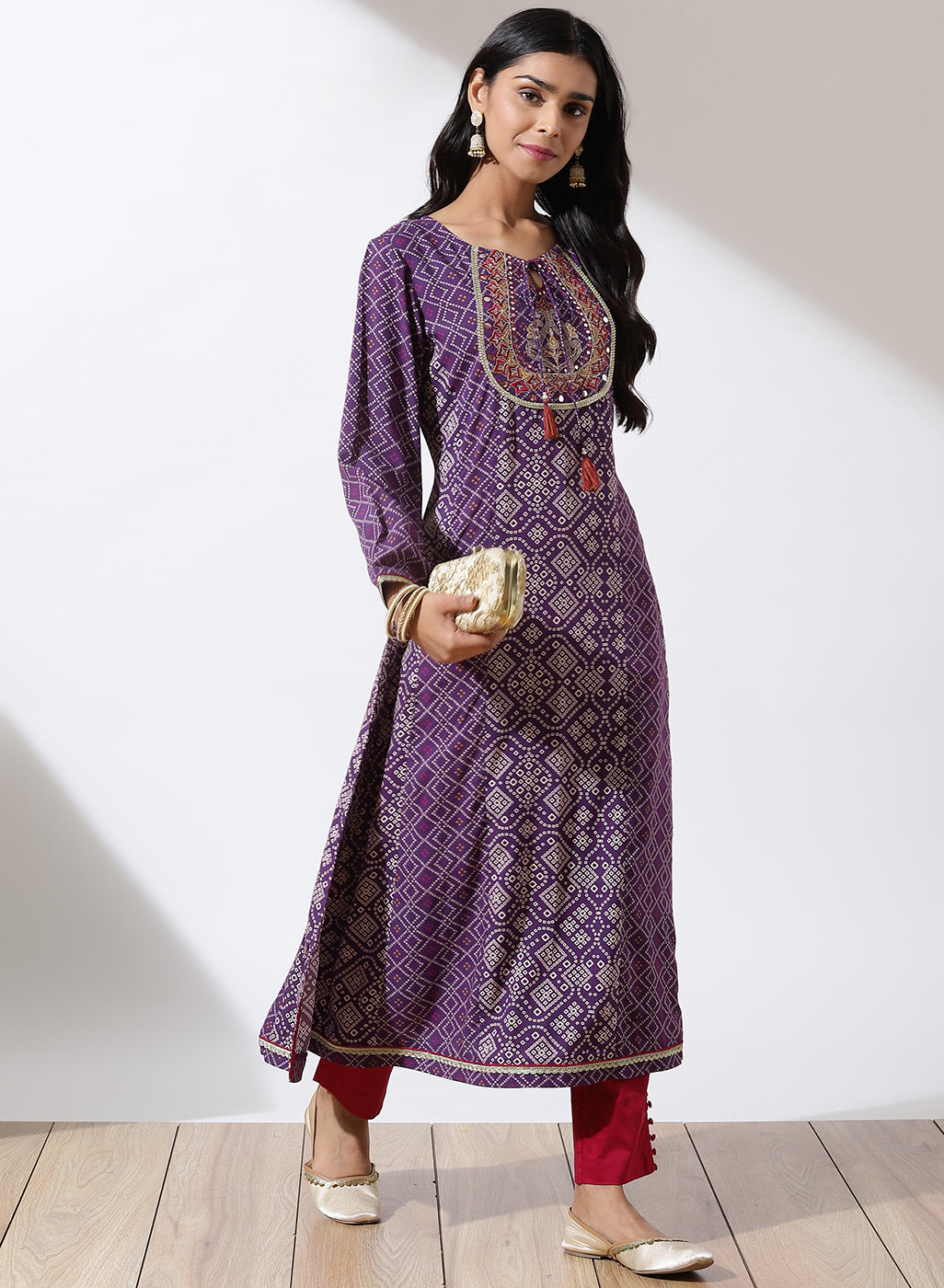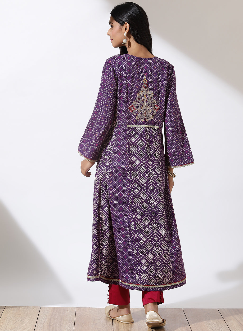 Purple Floral Print Dhaage Collection Kurta With Embroidery