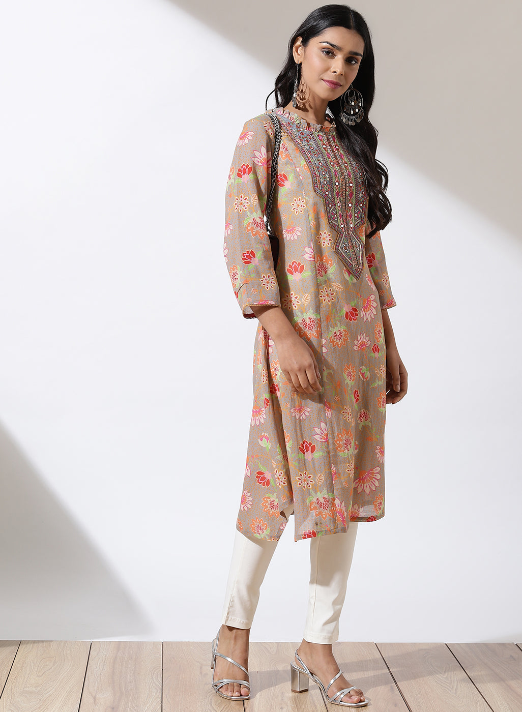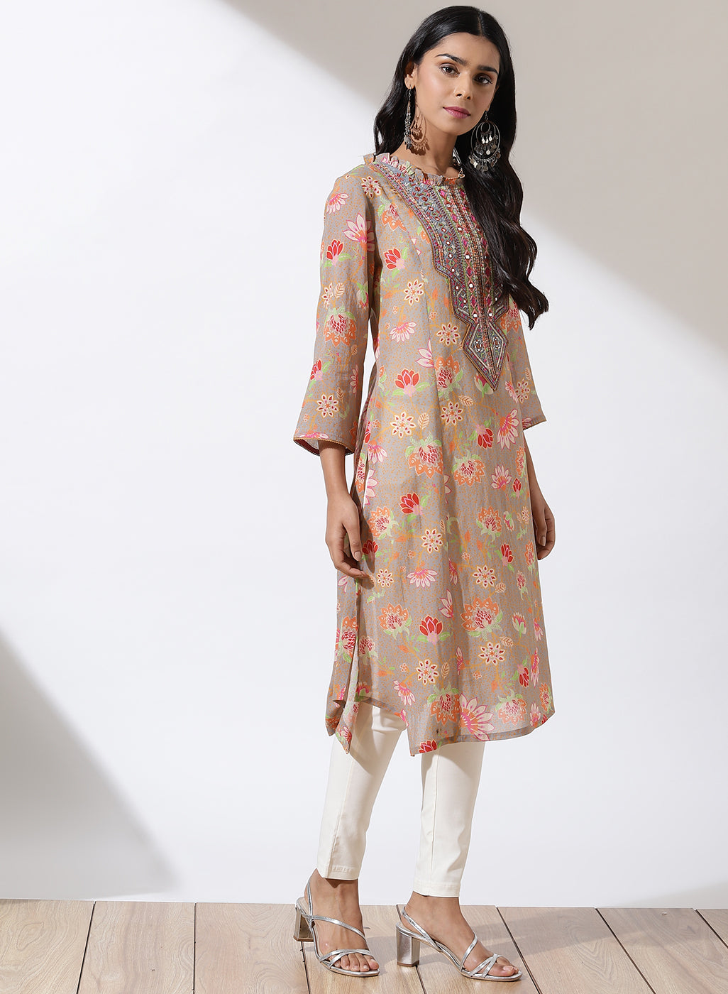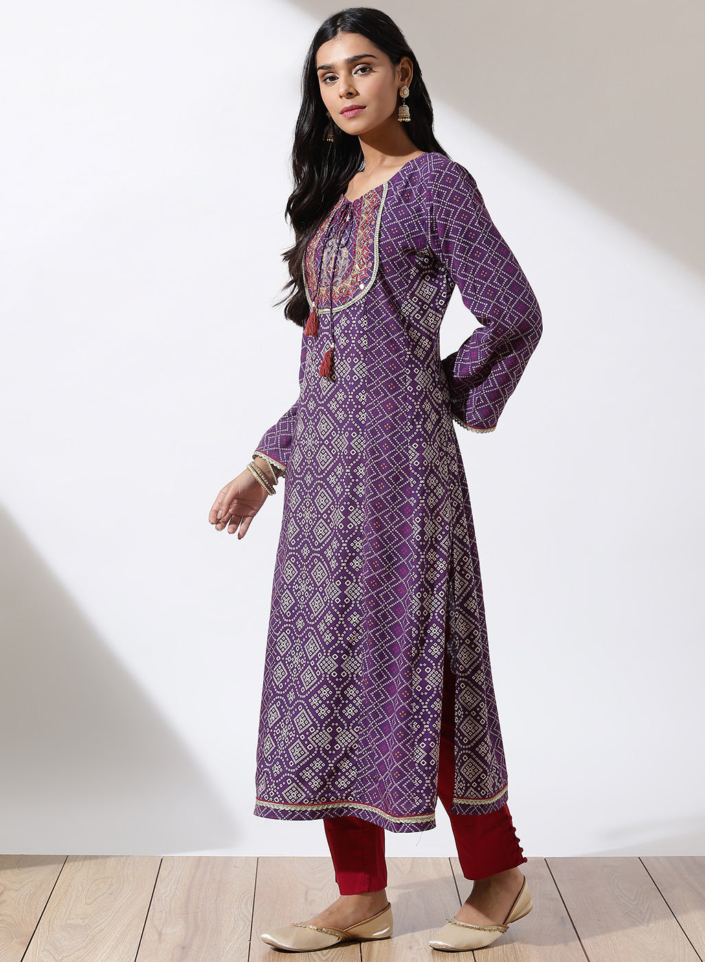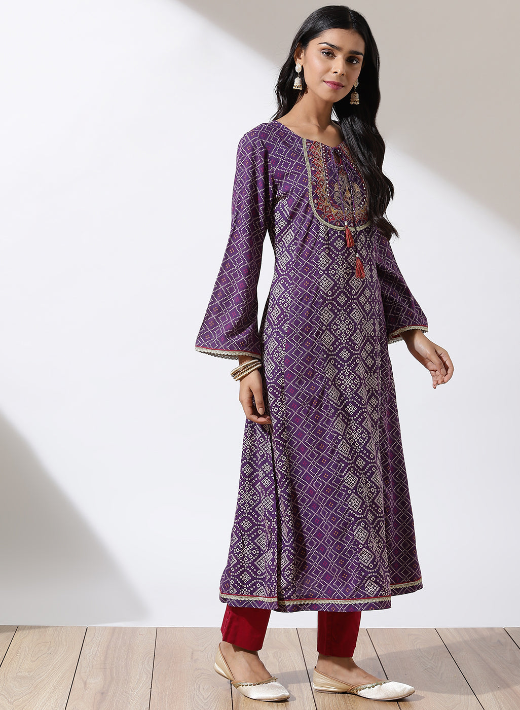 Purple Floral Print Dhaage Collection Kurta With Embroidery