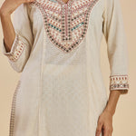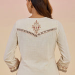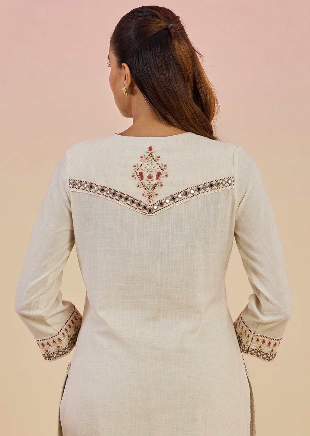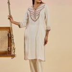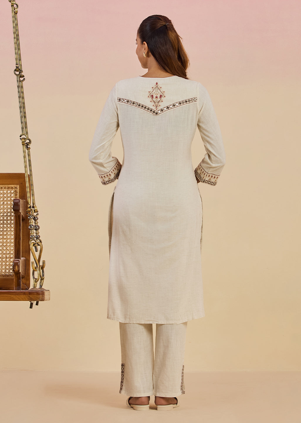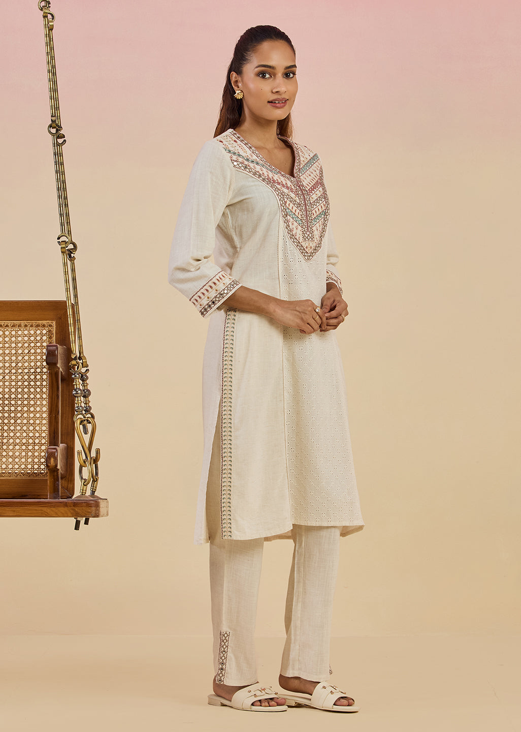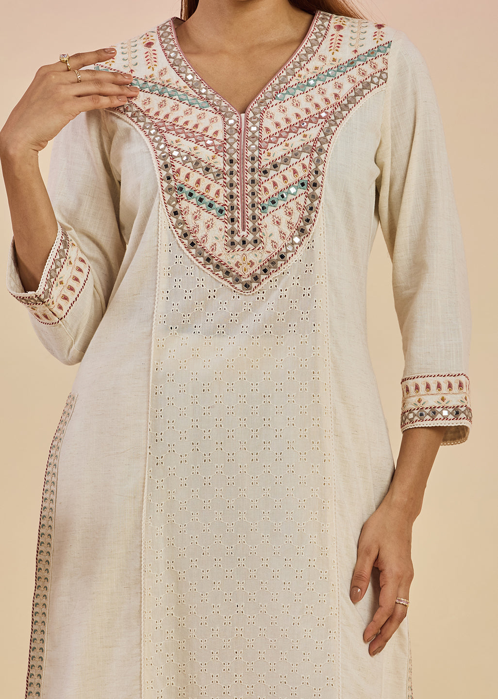 Rooted in elegance, this ivory kurta set is crafted in breathable rayon cotton flex and features intricate thread embroidery and stunning mirror work that captures the essence of heritage craftsmanship. The shiffli embroidered front panel lends it a textured charm, while contrast piping and broad cuffs edged with lace add refined detailing. Paired with straight pants, the ensemble is as functional as it is graceful.