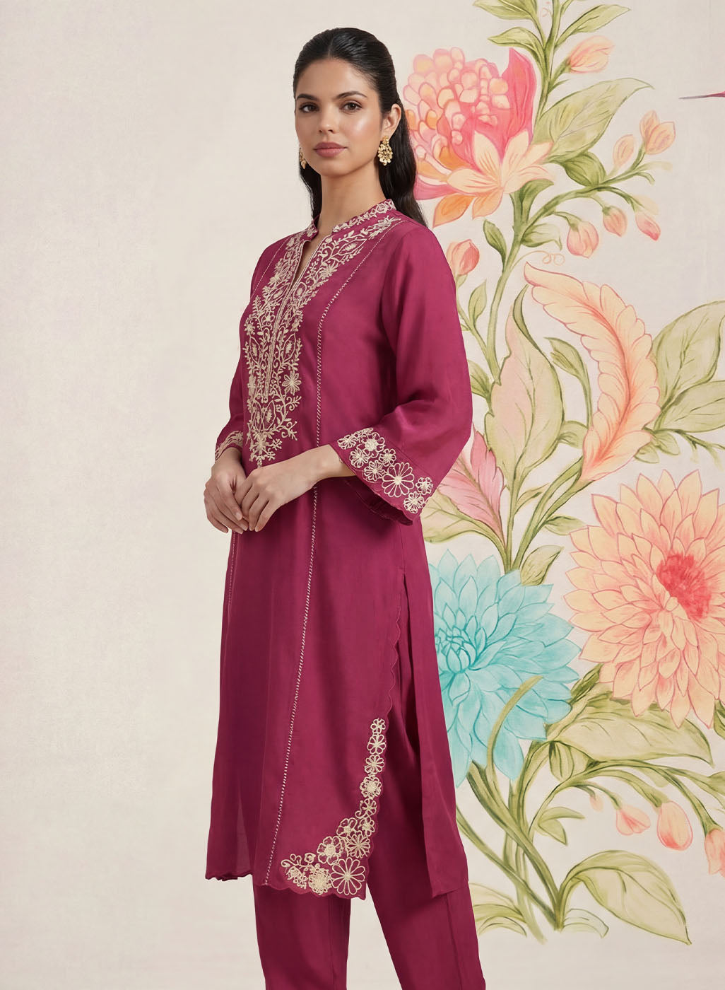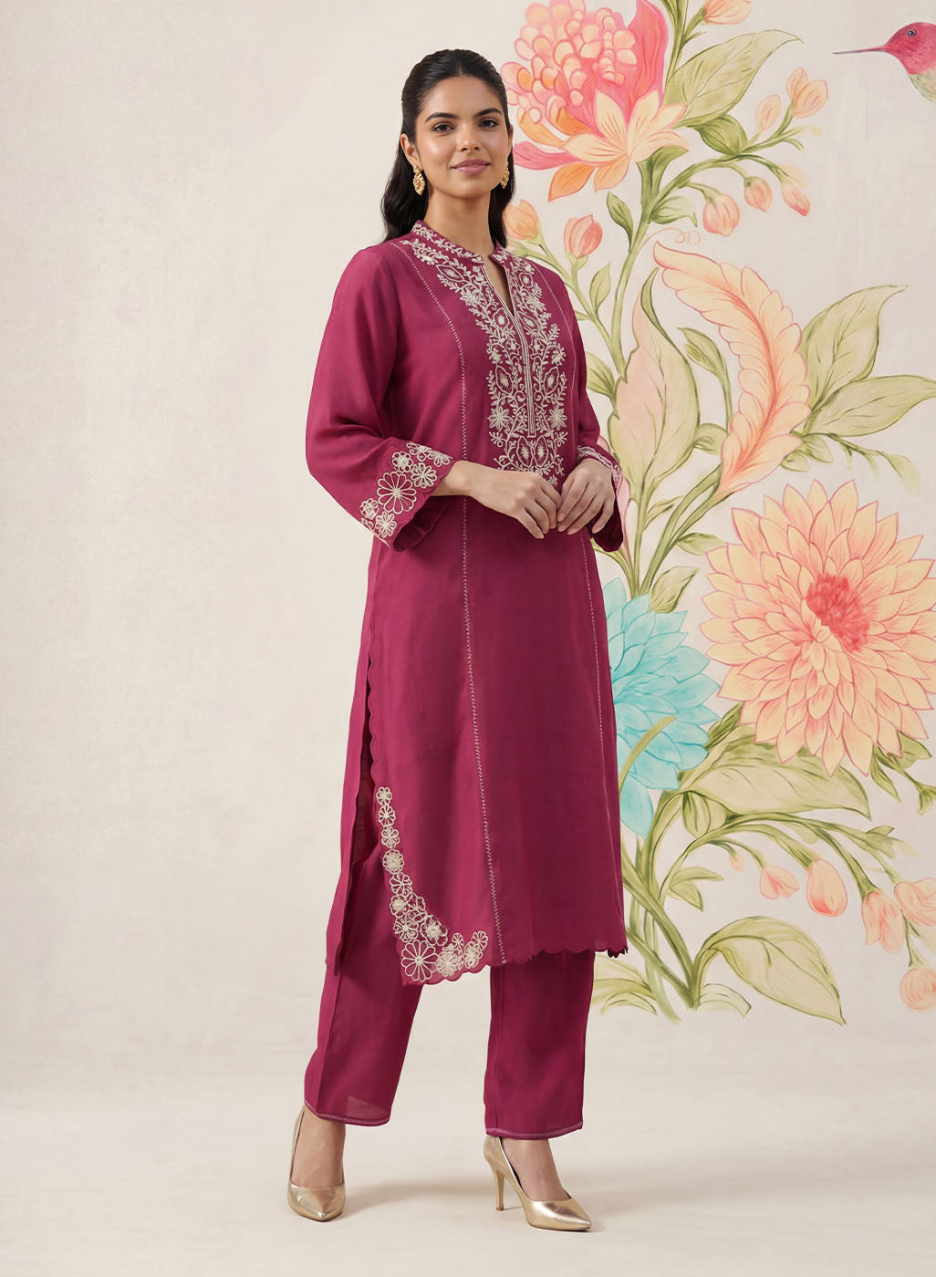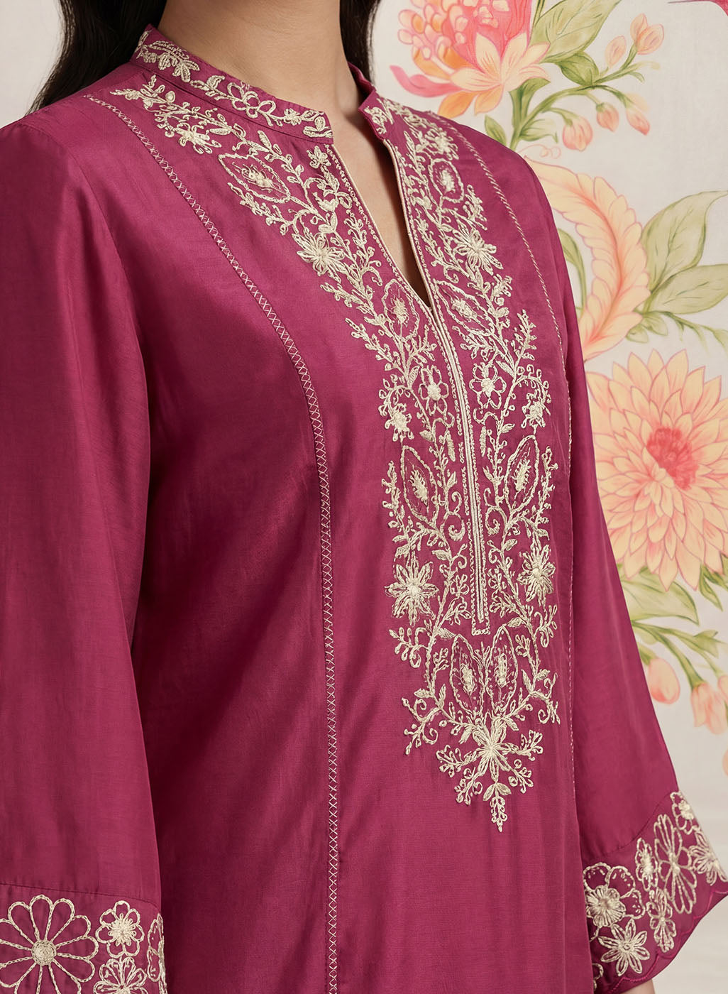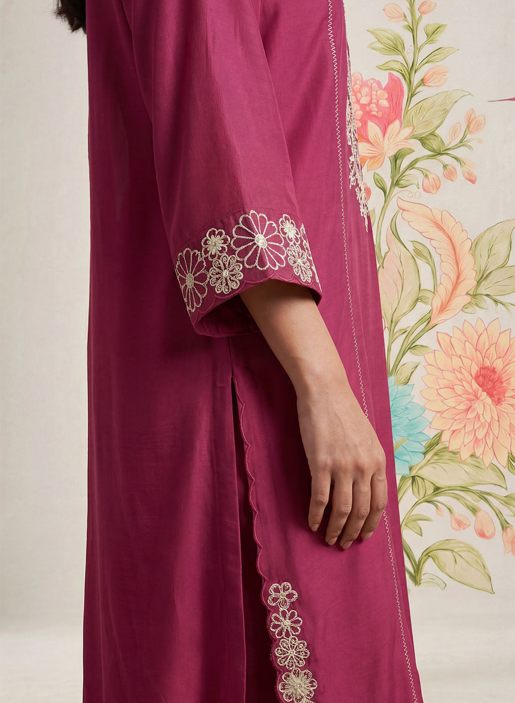Striking yet refined, this dark fuchsia kurta set is designed in a breathable cotton blend with a soft, linen-like texture that flows beautifully through the day. The kurta is adorned with intricate dori embroidery in contrasting white thread, elevated with subtle sequin highlights. Tailored in a flattering A-line silhouette with princess panels, the kurta features a mandarin collar and elegant bell sleeves. Delicate interlock detailing along the princess seams and scalloped accents on the hemline and side slits add thoughtful finishing touches. - Flowy, breathable cotton blend with linen-like texture. - Contrast dori embroidery with sequin highlights on front, back neckline, sleeves, and hemline. - Mandarin collar with a clean neckline finish. - A-line, princess panelled silhouette for a flattering fit. - Interlock detailing along princess seams. - Bell sleeves with embroidered accents. - Scalloped detailing on hemline and side slits. - Mid-rise straight pants with elastic waist, pockets, and interlock detailing
